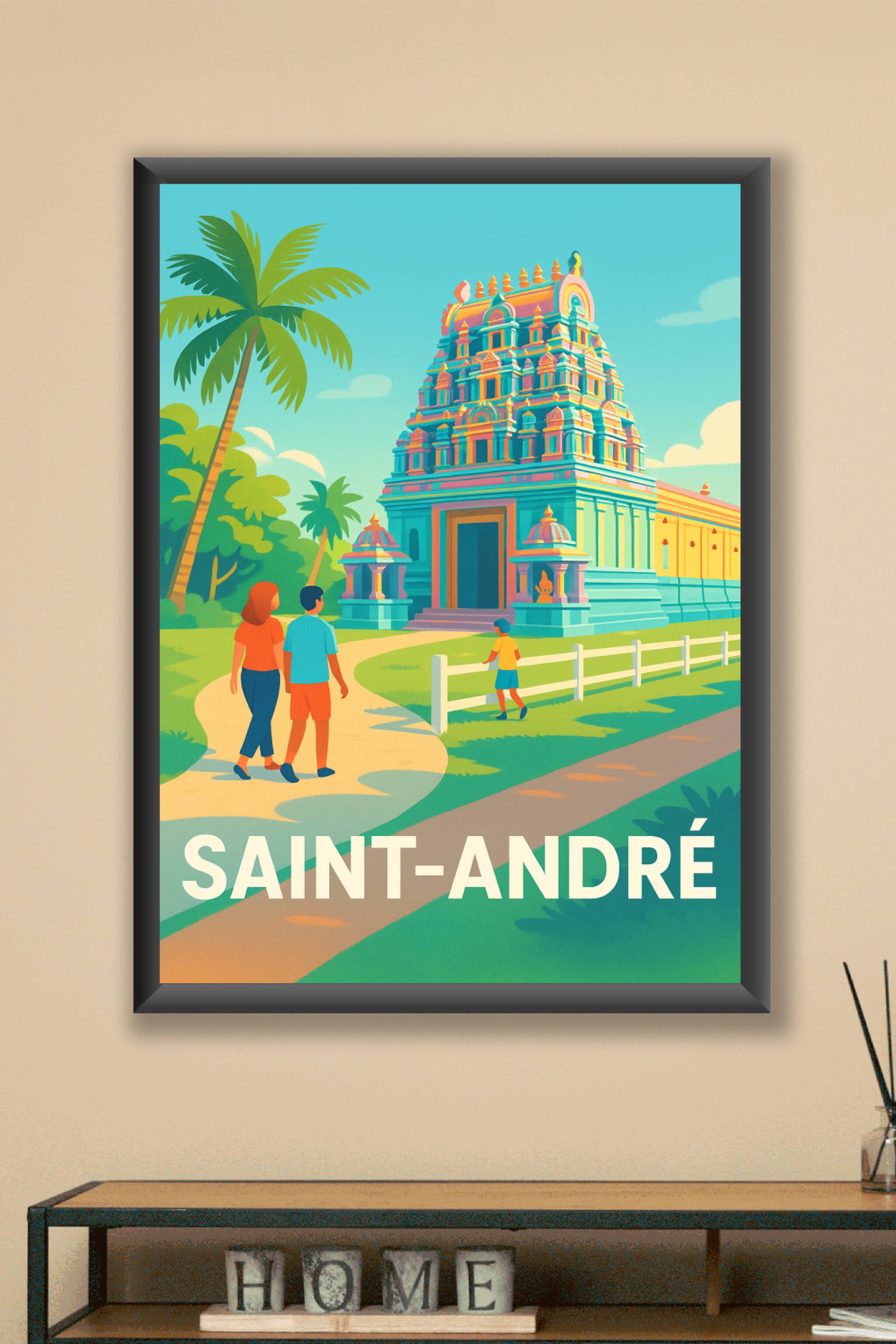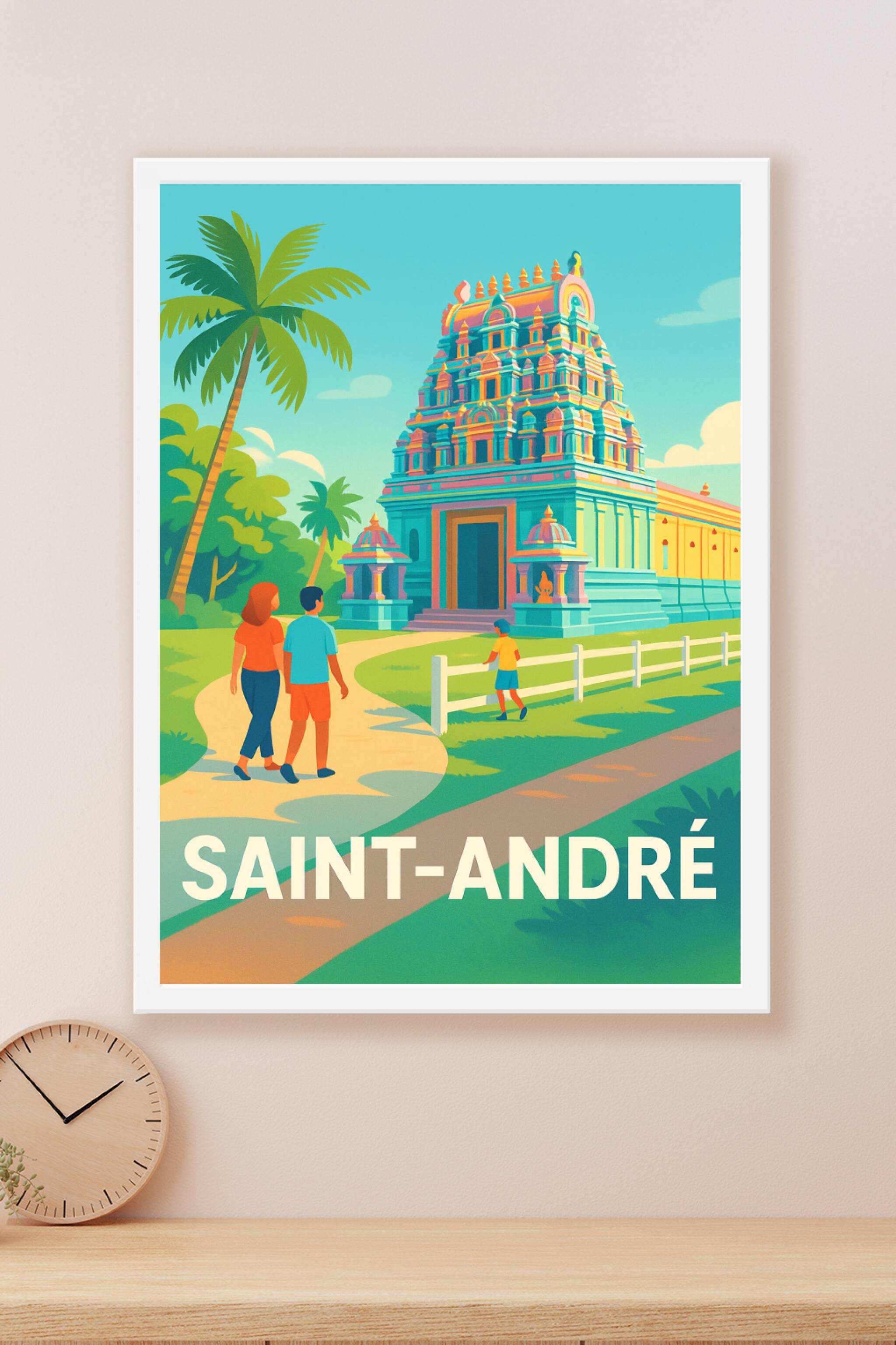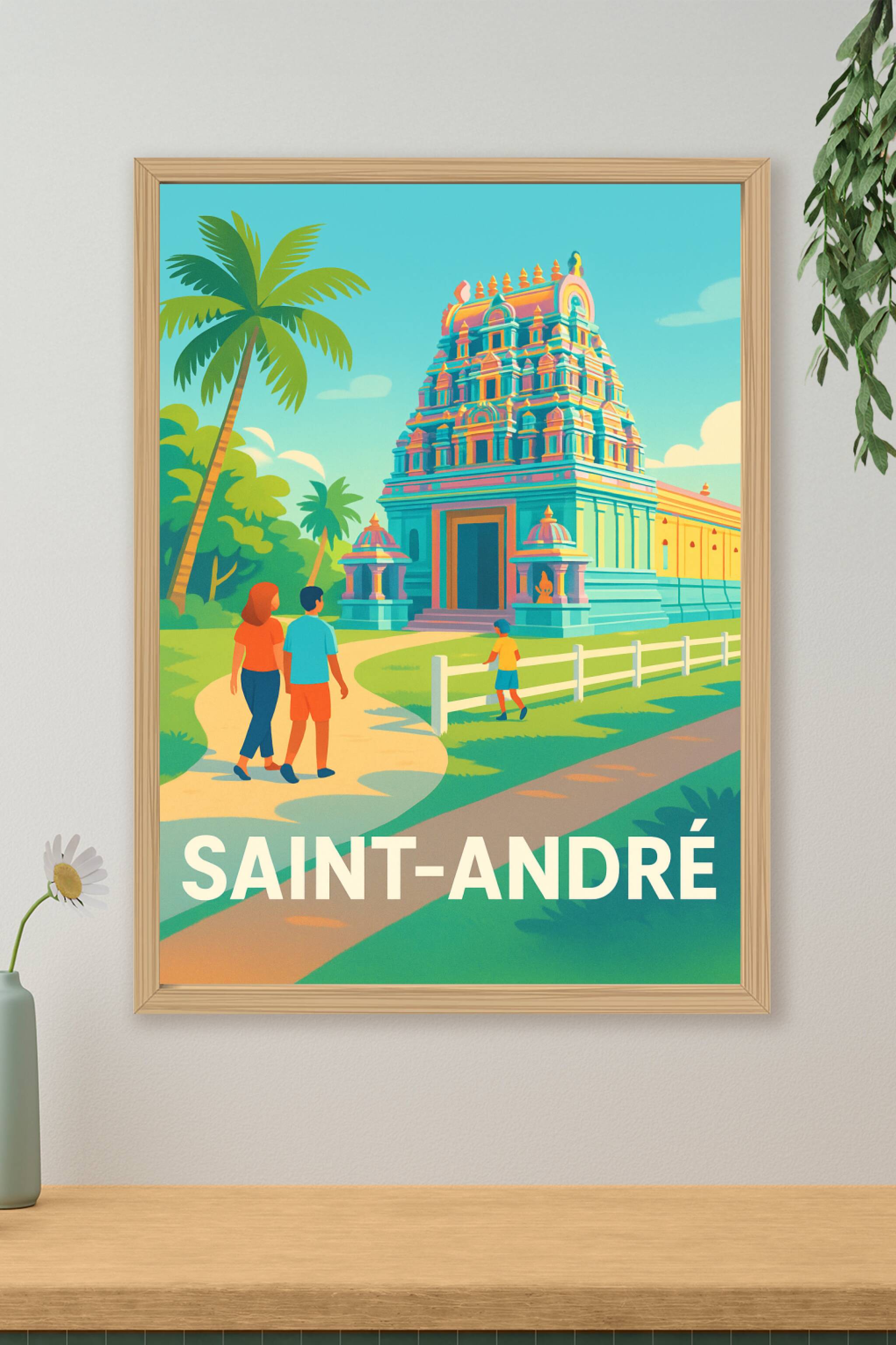 Apportez une touche d'exotisme et de sérénité à votre intérieur avec cette affiche représentant le temple emblématique de Saint-André, dans des teintes vives et modernes. Ce poster captivant invite à la découverte et à l'évasion grâce à son style illustratif éclatant qui met en lumière l'architecture unique et les palmiers environnants. Imprimé en tirage Fine Art sur papier 305g coton, ce poster se distingue par sa qualité d'impression exceptionnelle, garantissant des couleurs éclatantes et une durabilité remarquable. Disponible en formats A1 à A4, avec ou sans cadre, cette affiche est idéale pour décorer votre maison ou offrir un souvenir raffiné de Saint-André.