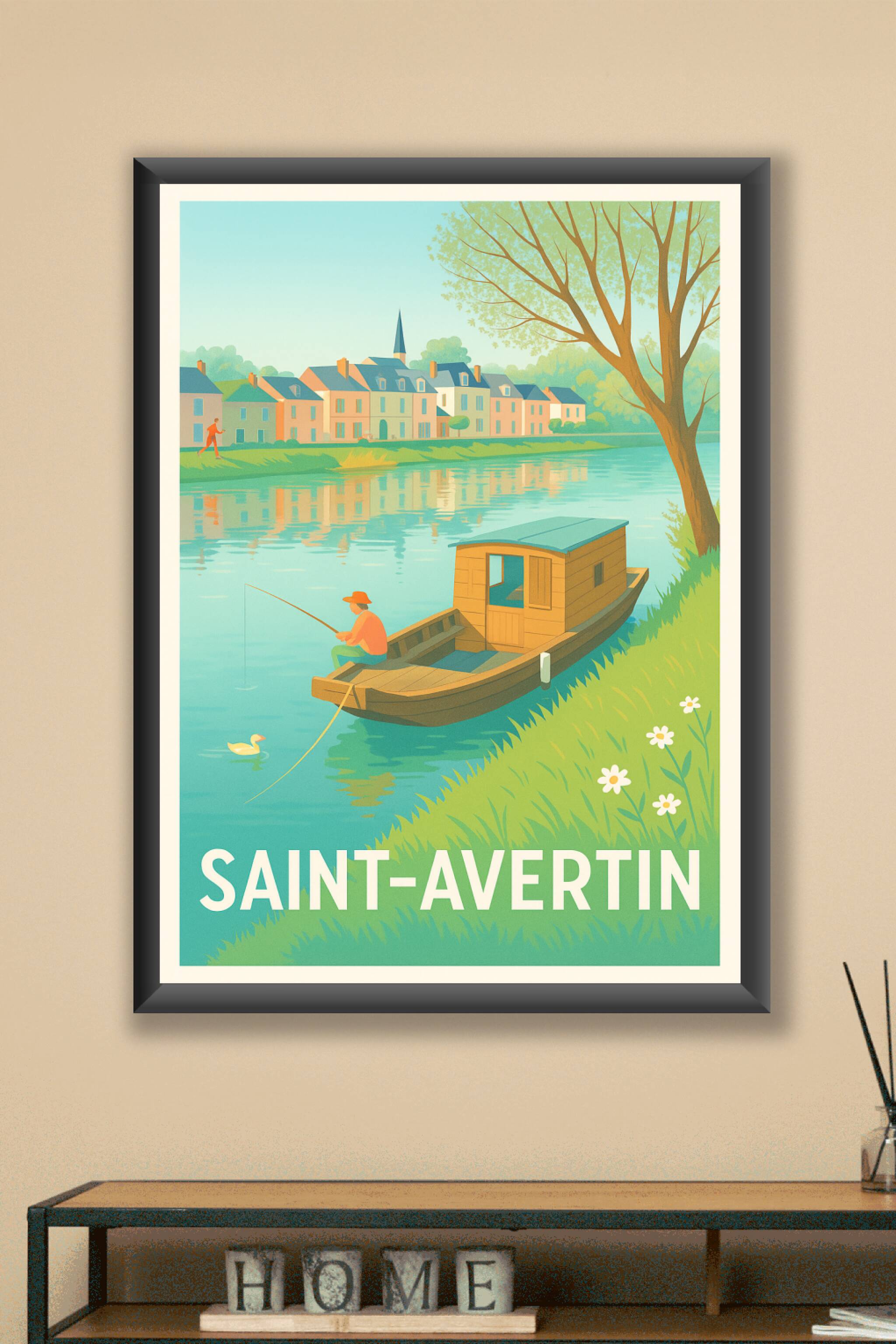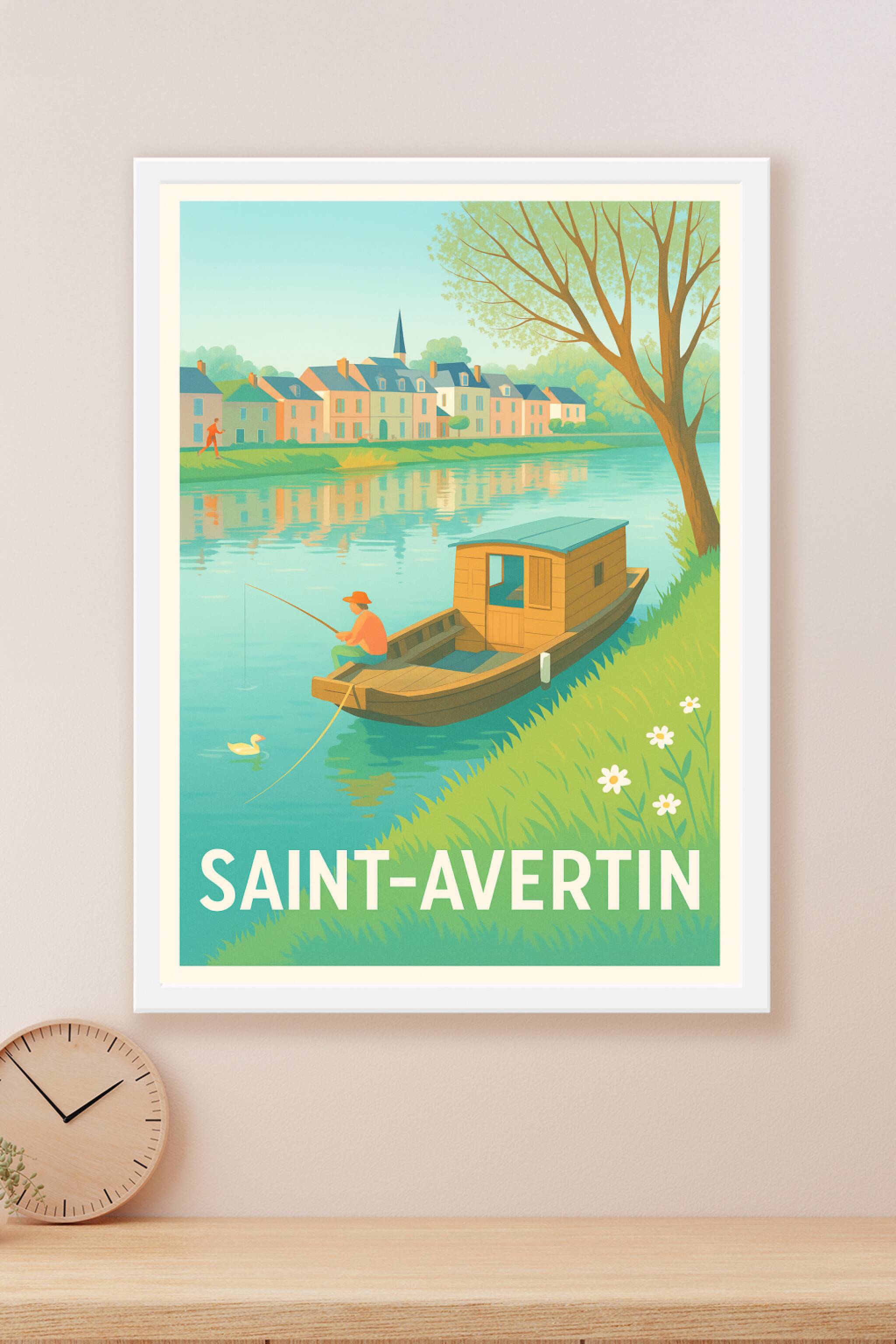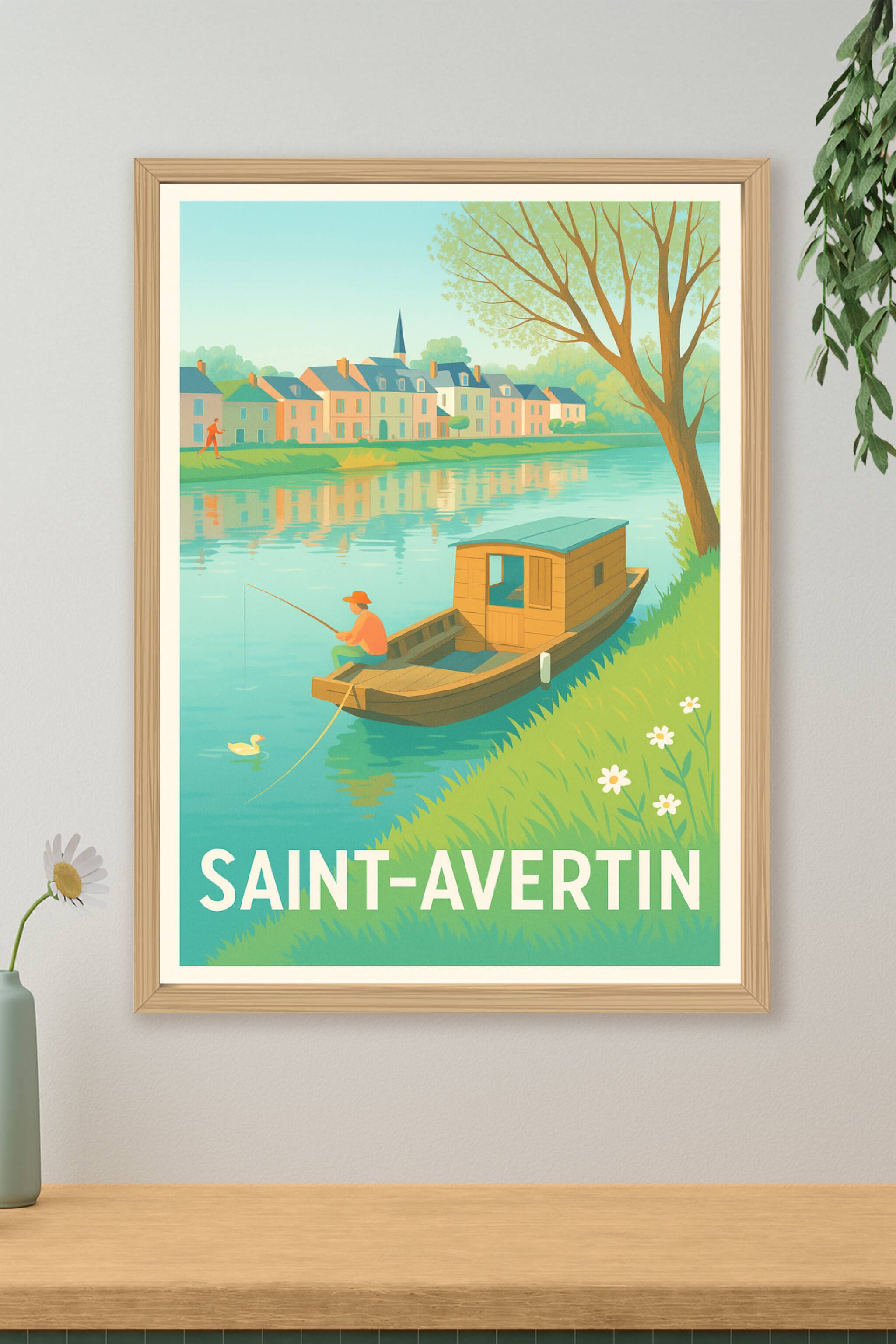 Découvrez la sérénité de Saint-Avertin avec cette affiche illustrée mettant en scène un pêcheur paisible sur la rivière, entouré de maisons colorée...