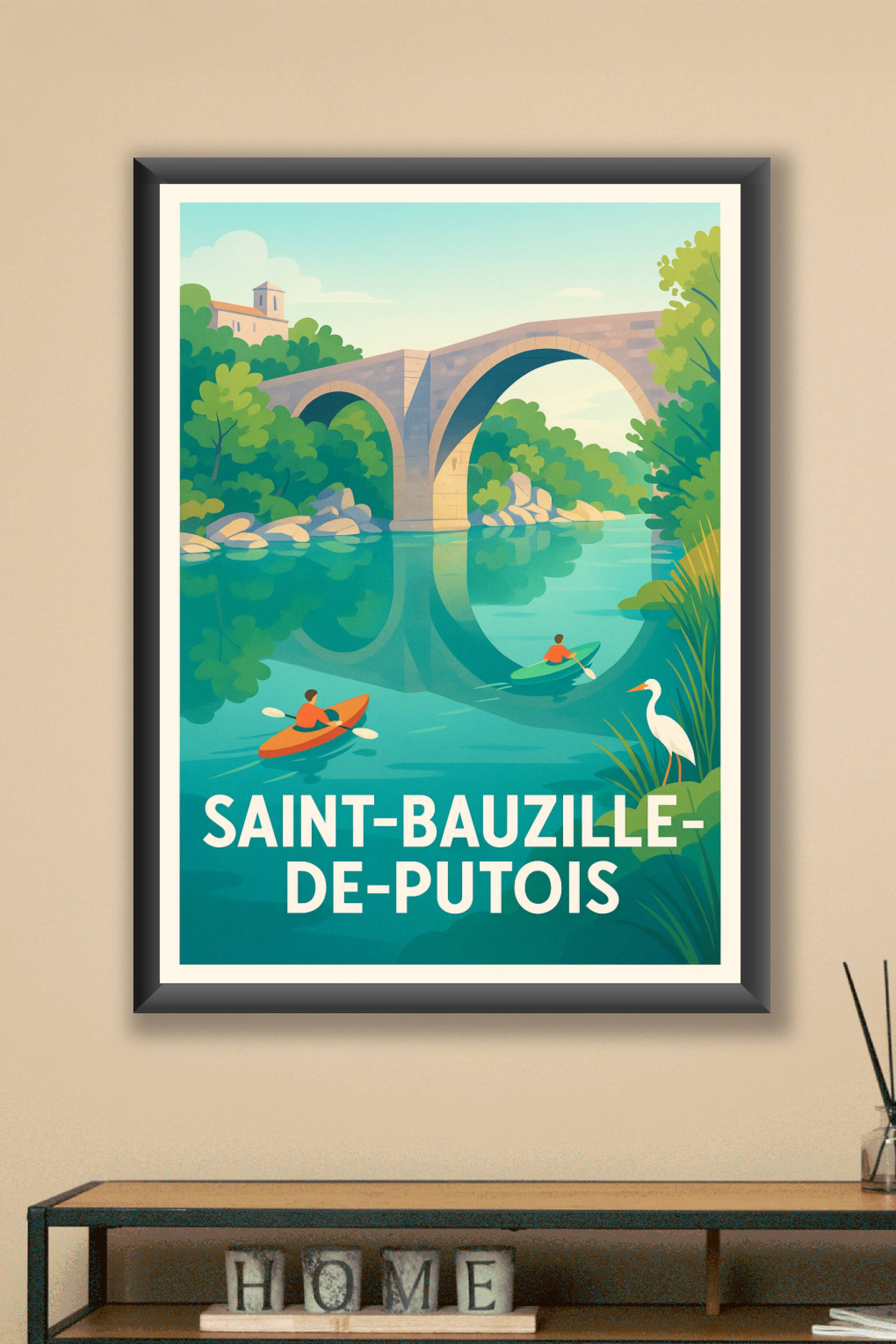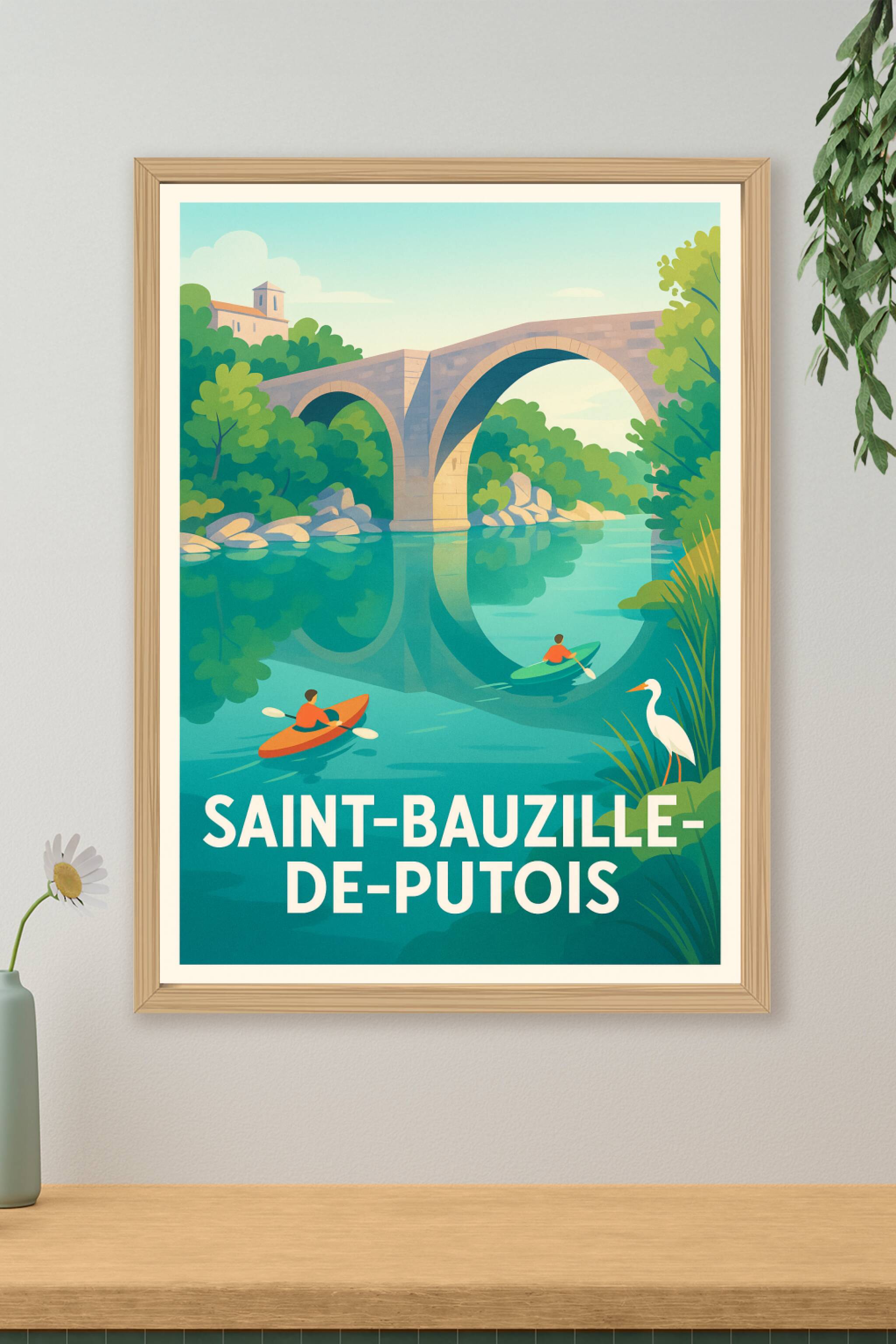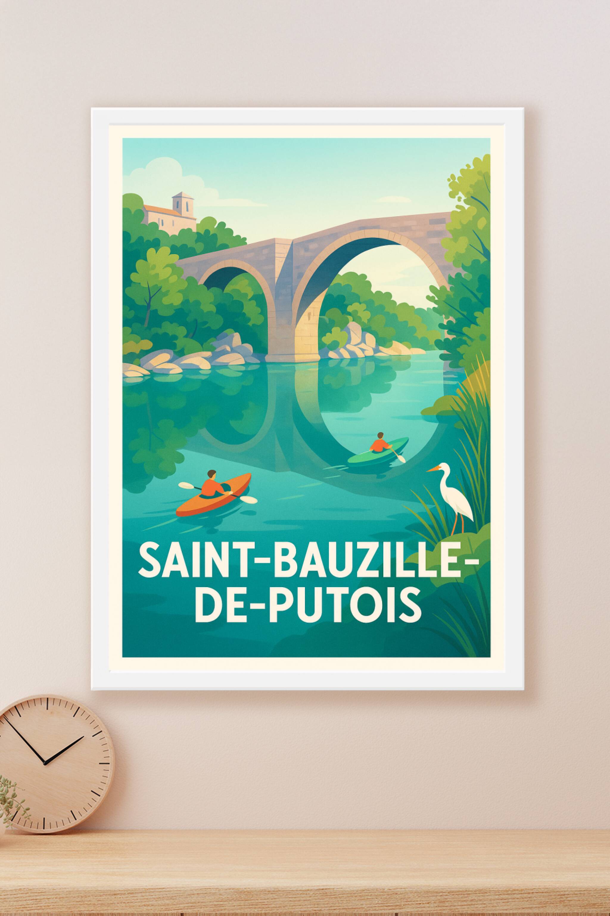 Découvrez la douceur de vivre de Saint-Bauzille-de-Putois avec cette affiche vintage illustrant une scène paisible sur la rivière, où deux kayakist...