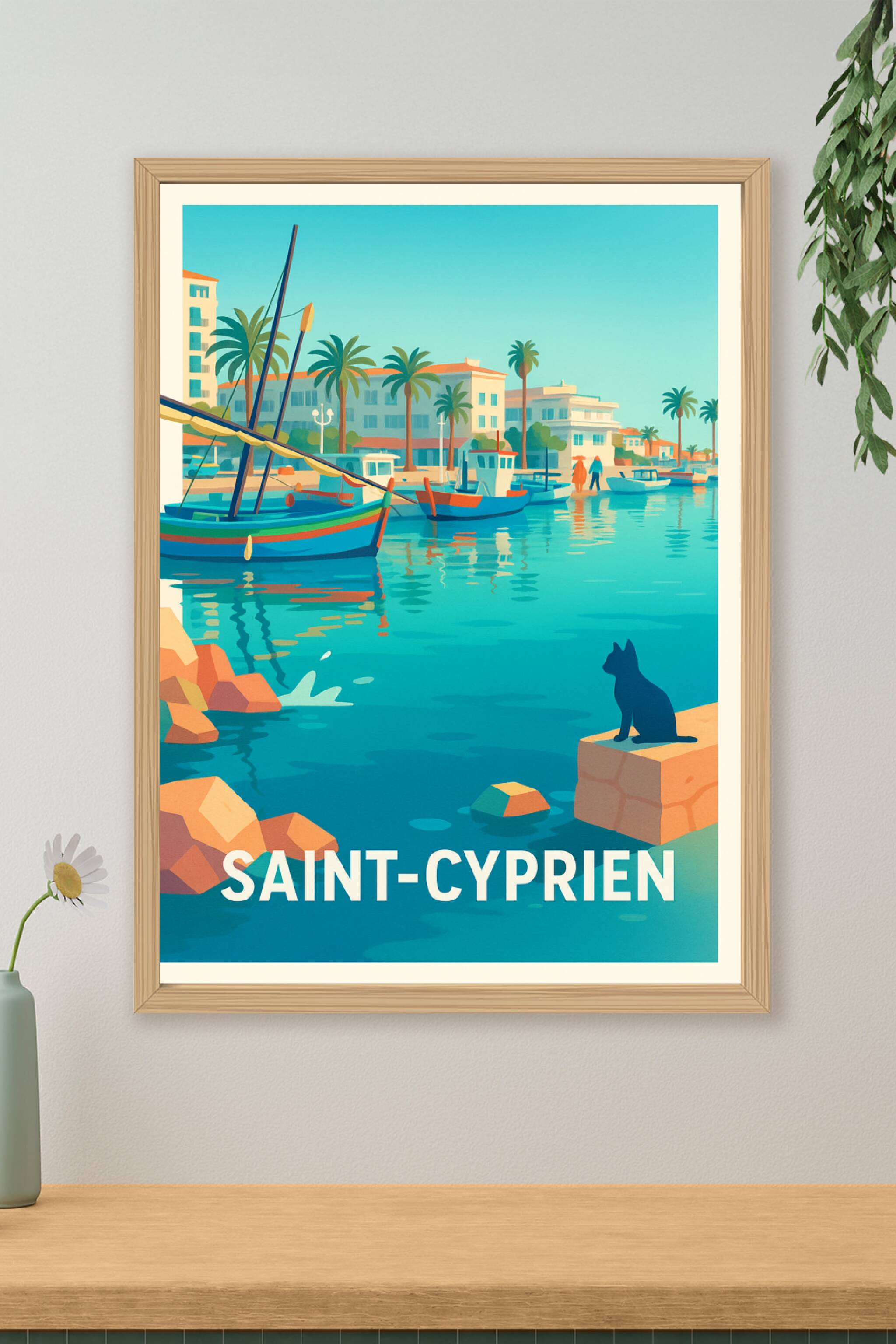 Découvrez la douceur de vivre en bord de mer avec cette affiche illustrant le port paisible de Saint-Cyprien, entre bateaux colorés, palmiers et am...