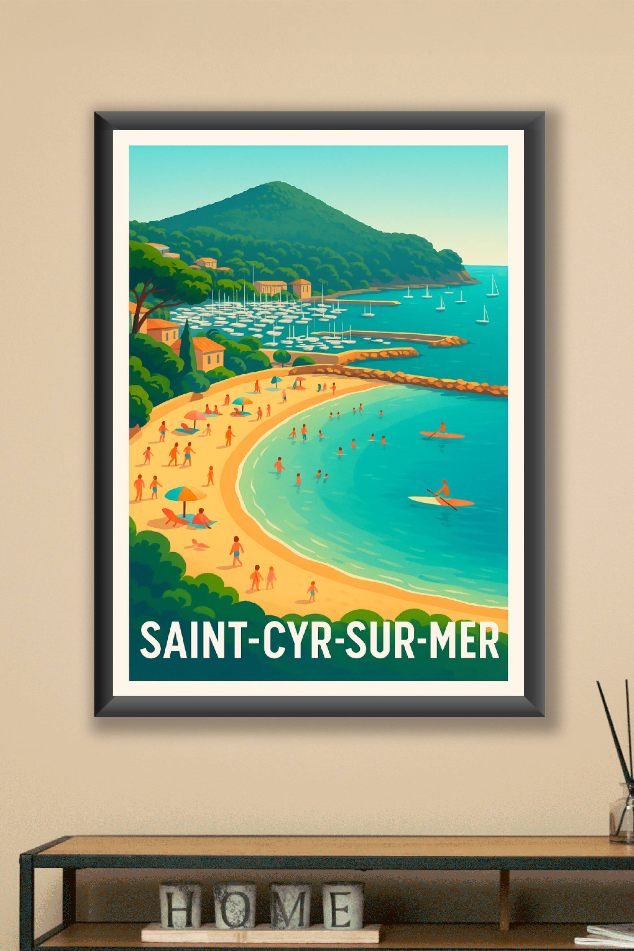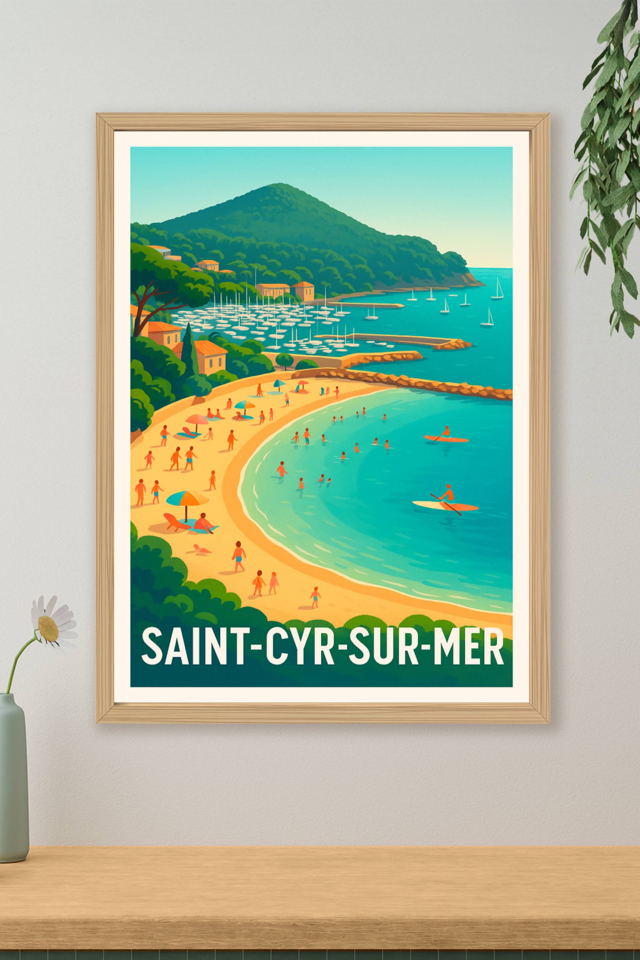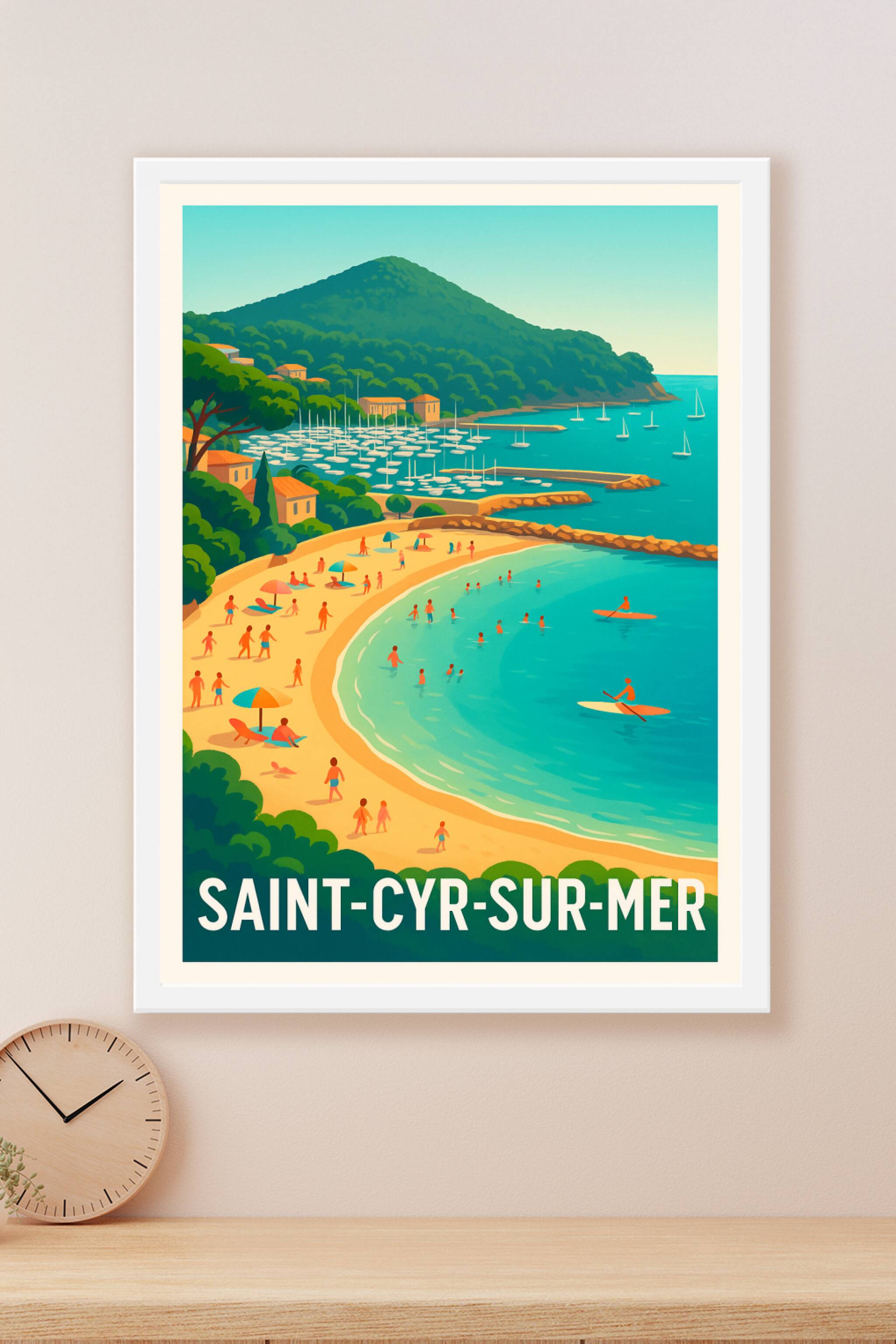 Découvrez l'ambiance ensoleillée et détendue de Saint-Cyr-sur-Mer avec cette affiche vintage illustrant sa plage animée et son port pittoresque. Ce...