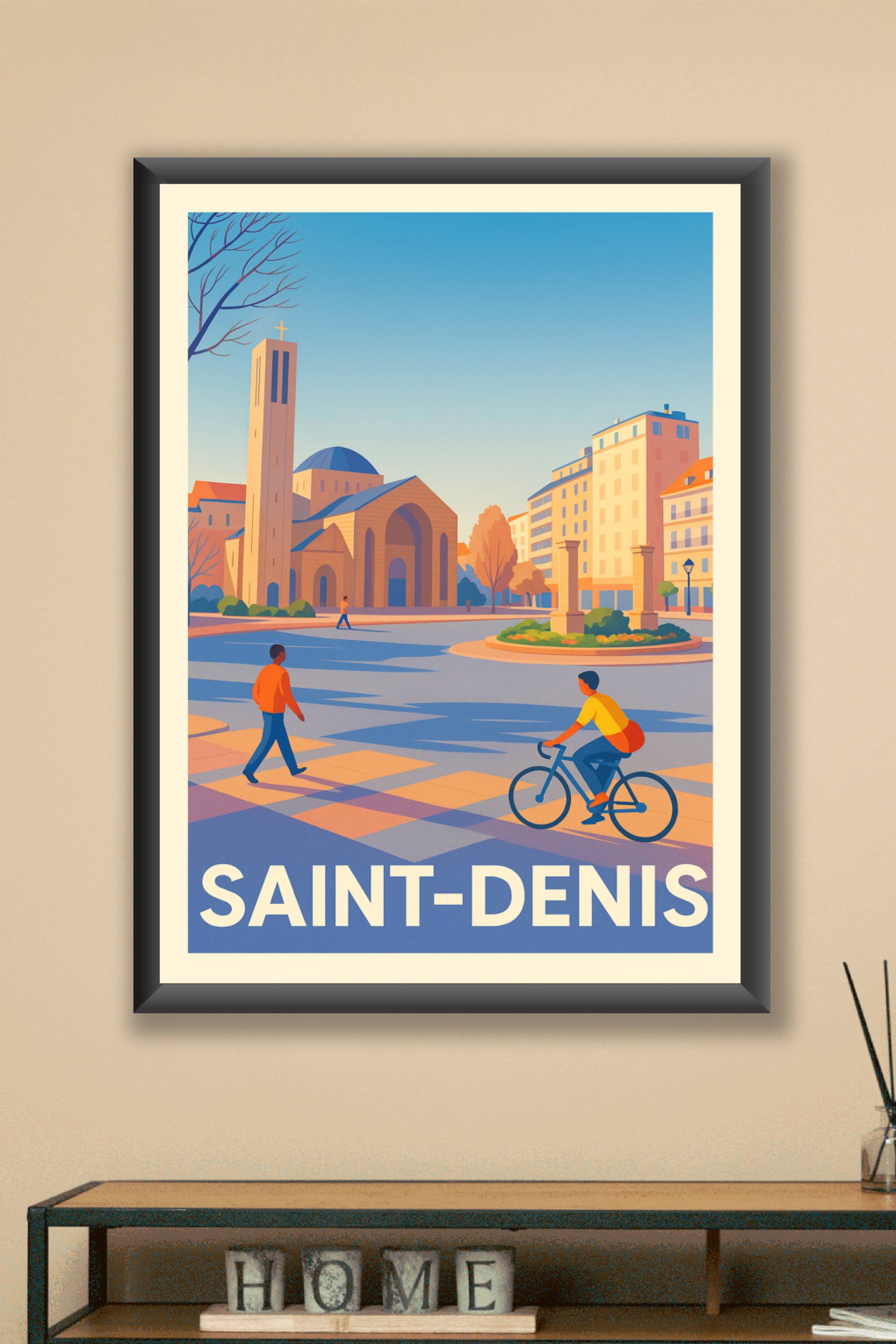 Découvrez cette affiche élégante qui capture la quiétude et le charme architectural de Saint-Denis. Ce poster illustre une scène urbaine calme avec un cycliste et un piéton évoluant près d'une église iconique, sous un ciel clair et lumineux. Imprimé en tirage "Fine Art" sur un papier 305g coton premium, ce poster vous garantit une qualité d'impression exceptionnelle et un rendu des couleurs éclatant. Disponible en formats A1 à A4, avec ou sans cadre, cette affiche est idéale pour apporter une touche contemporaine et harmonieuse à votre décoration intérieure. Profitez d'un produit 100% fabriqué en France, parfait comme cadeau ou souvenir artistique de Saint-Denis.