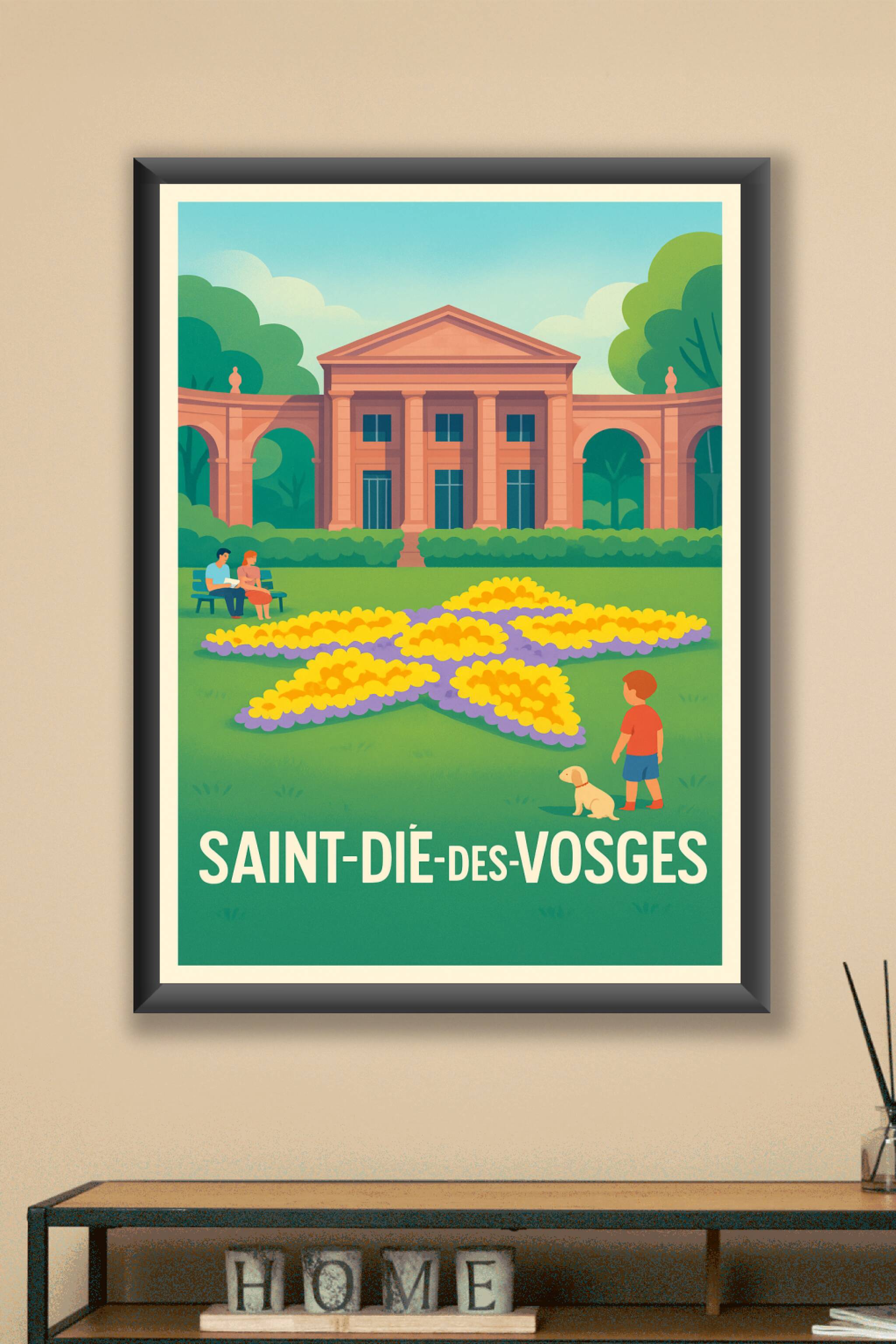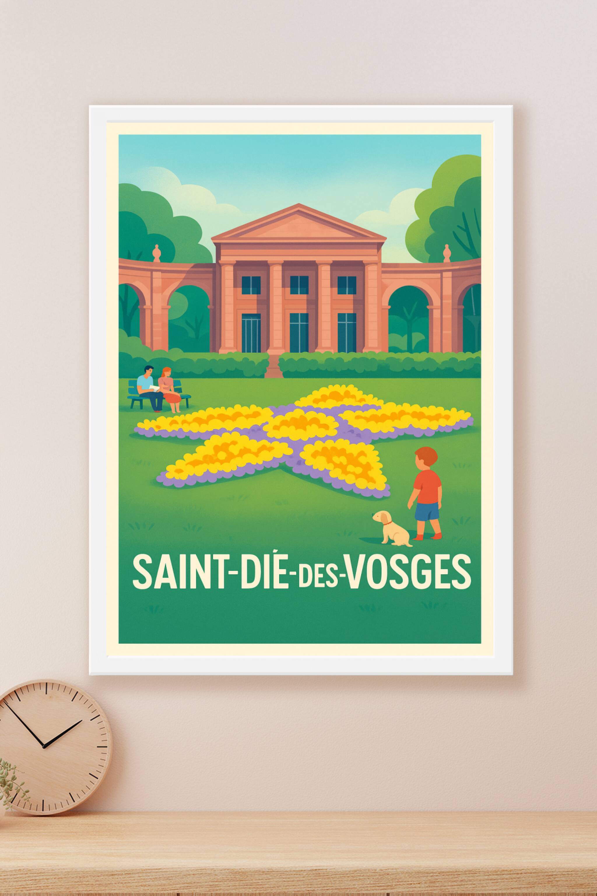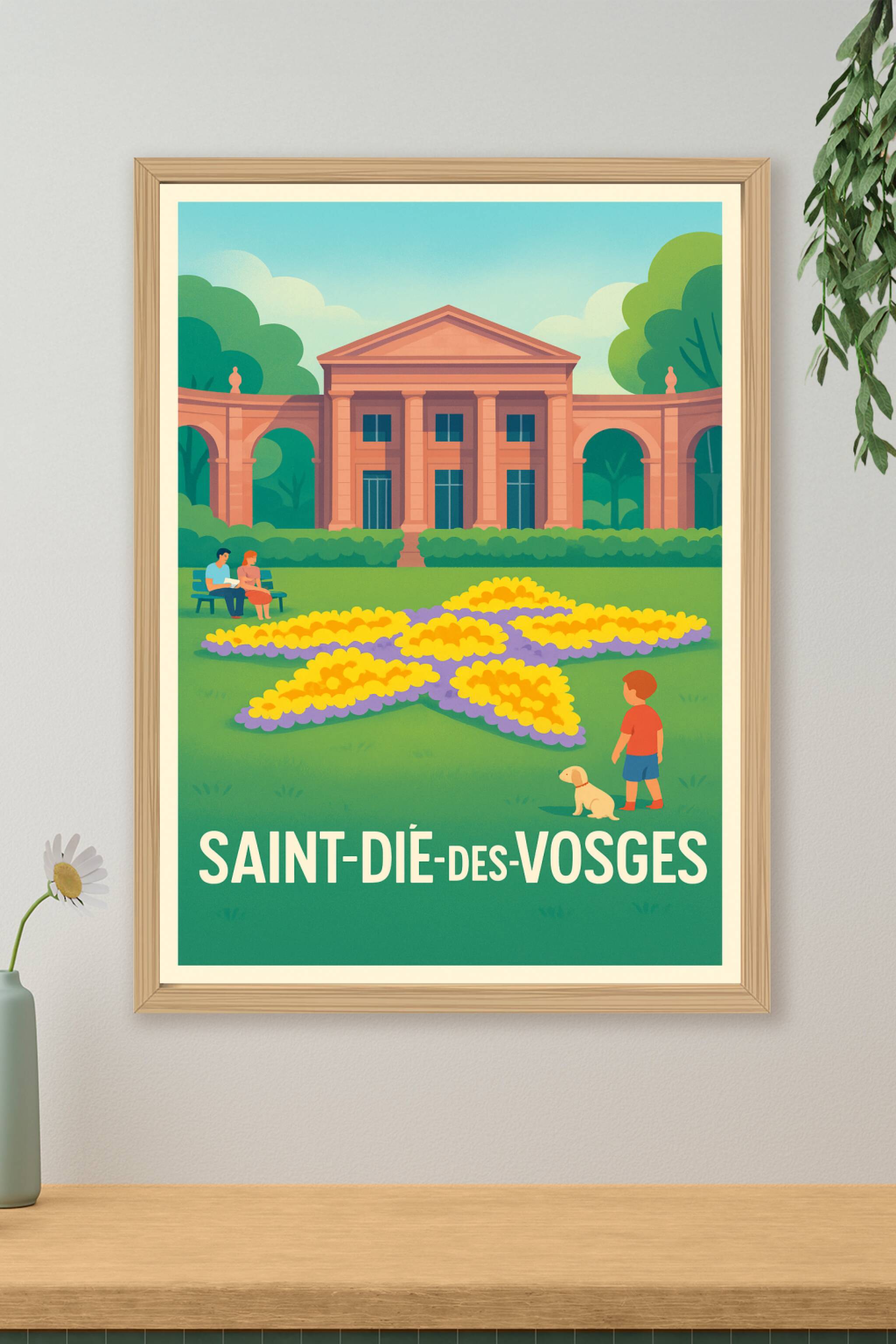 Découvrez l'élégance paisible de Saint-Dié-des-Vosges à travers cette affiche illustrée mettant en scène le célèbre jardin floral et son architectu...