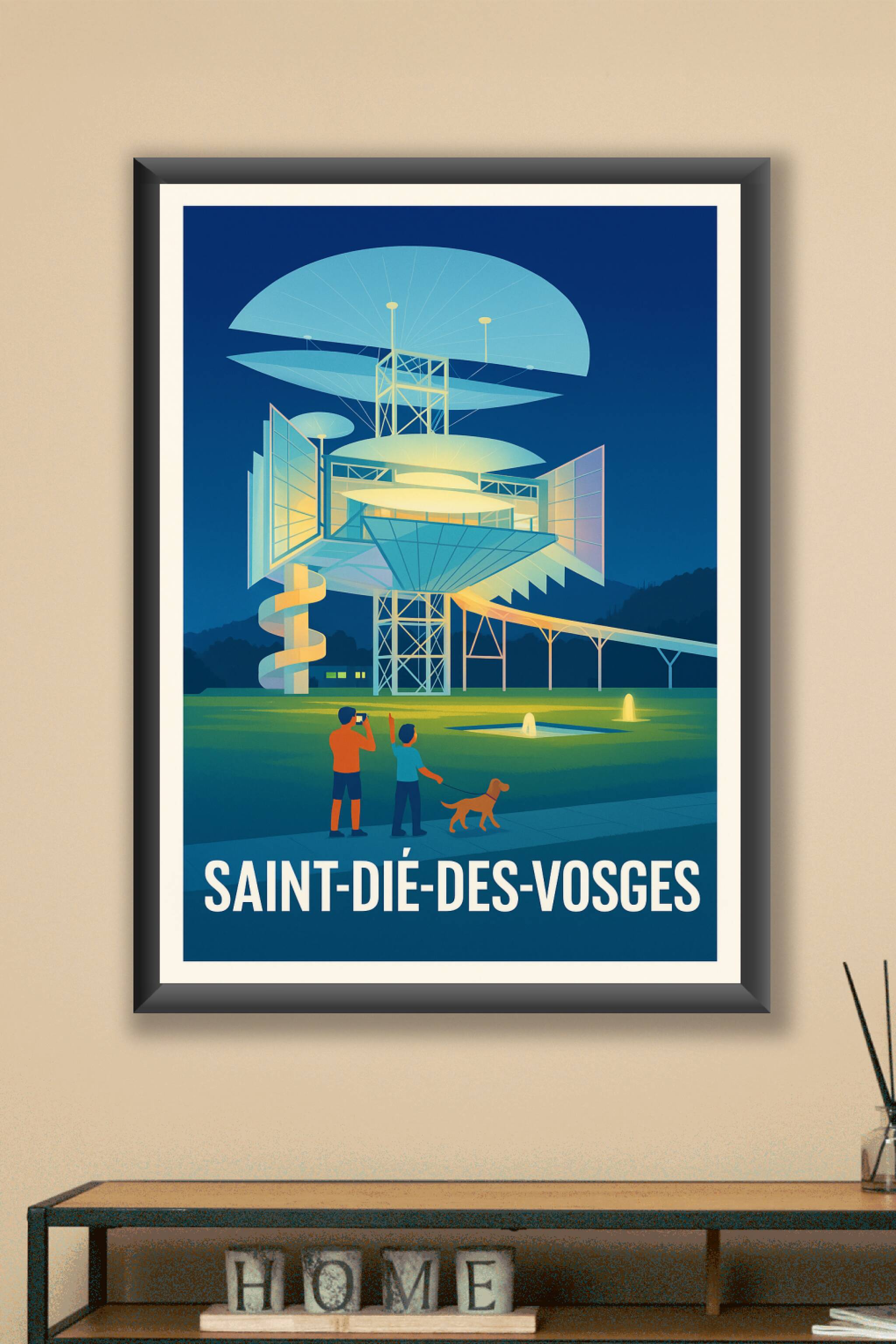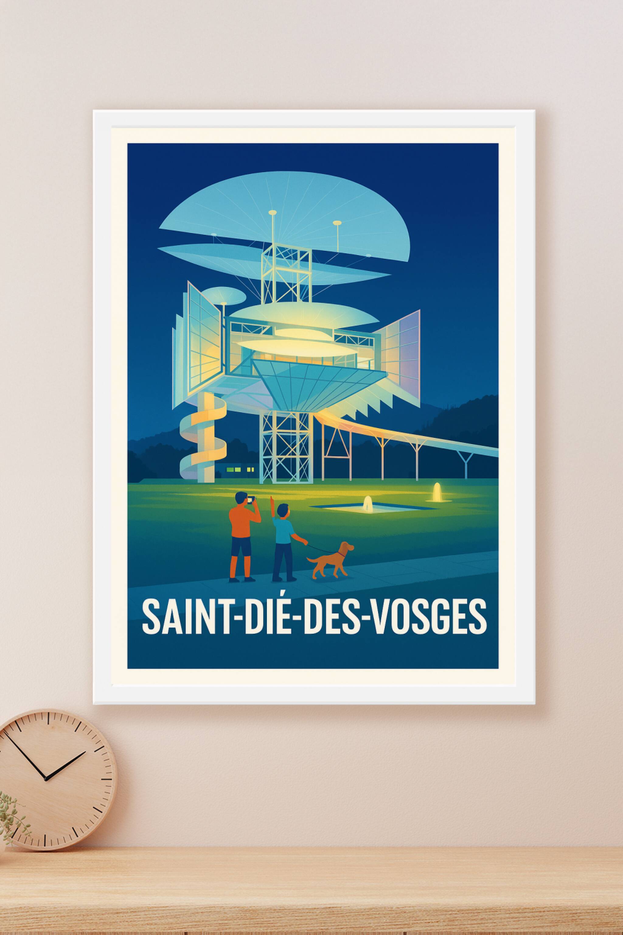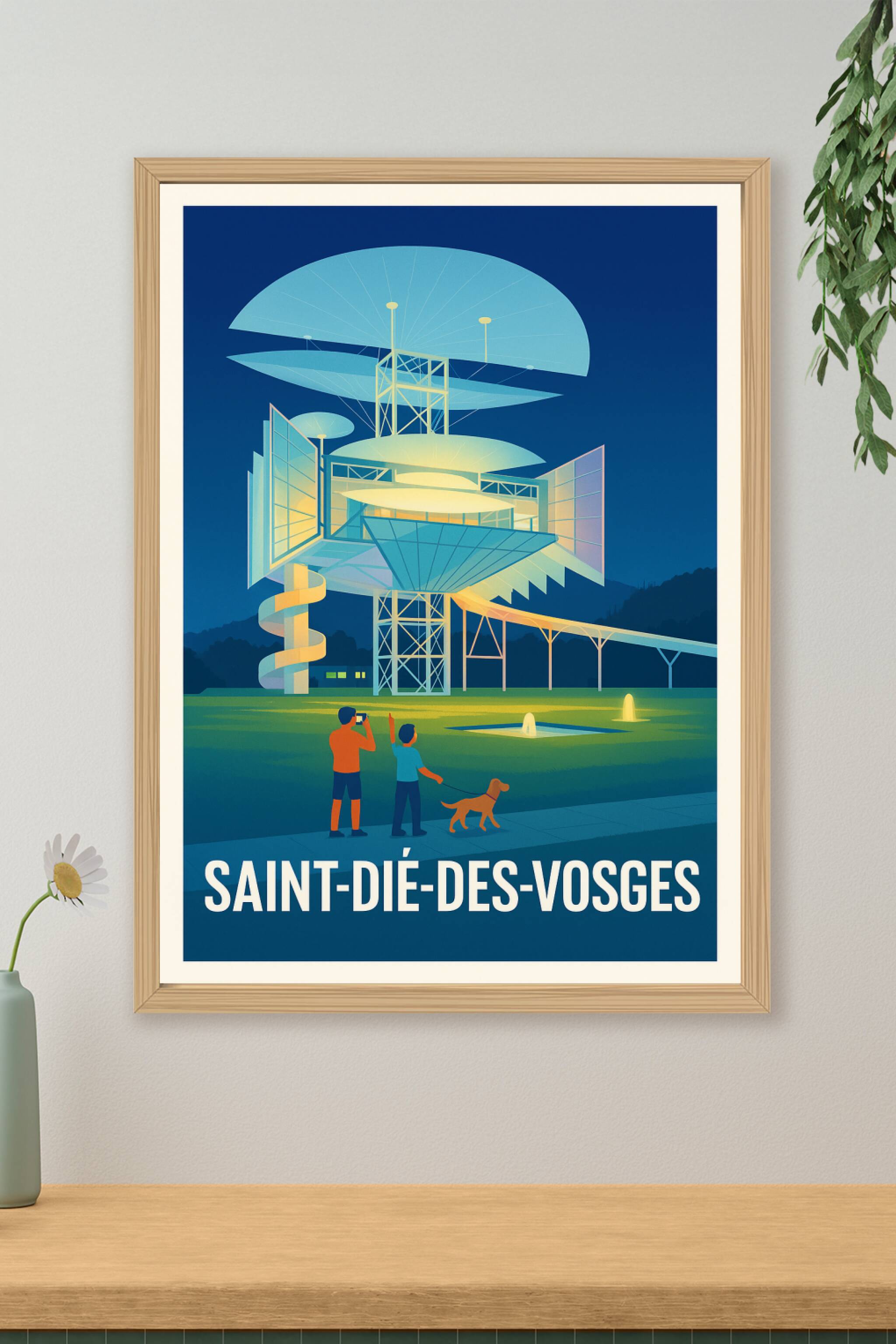Découvrez l'affiche illustrant l'architecture unique et futuriste de Saint-Dié-des-Vosges, mise en lumière dans une ambiance nocturne apaisante. Ce...