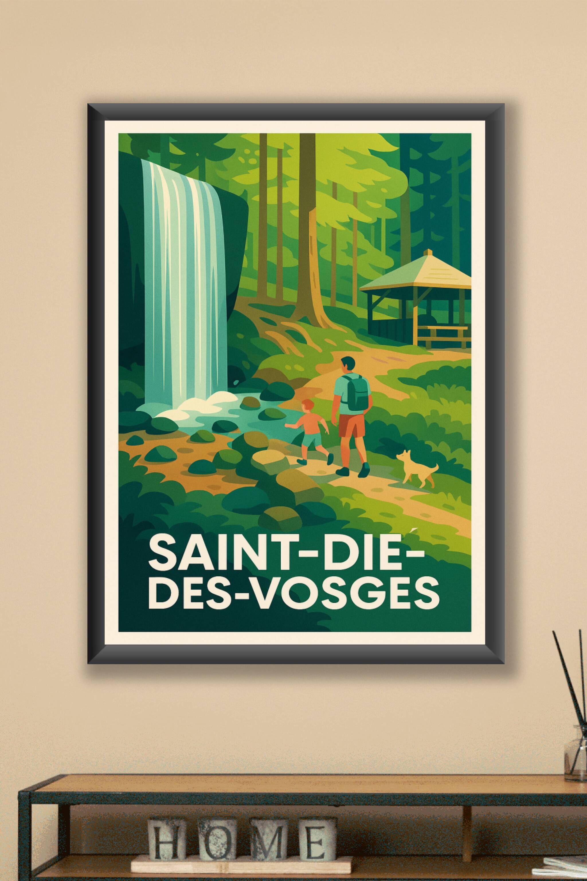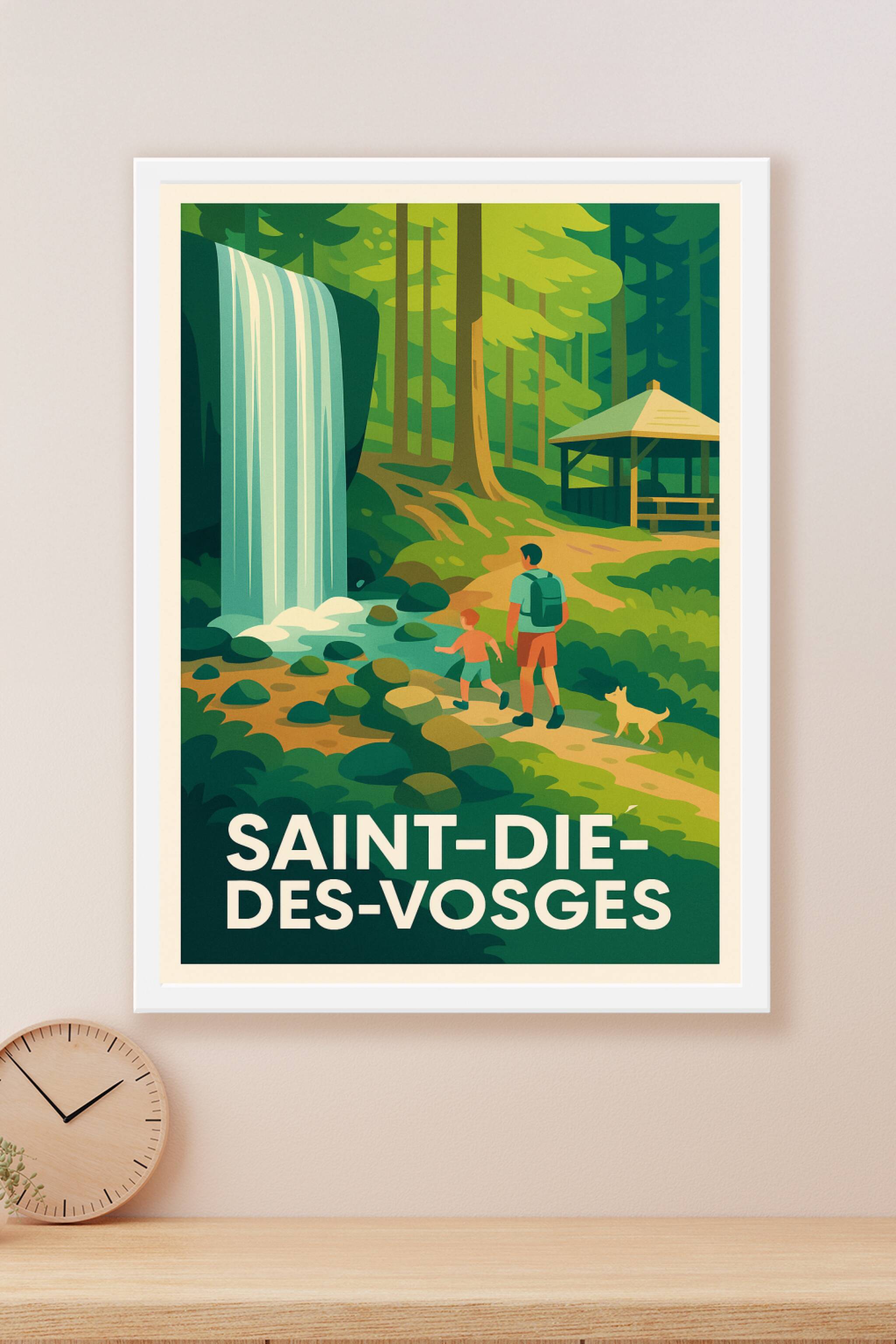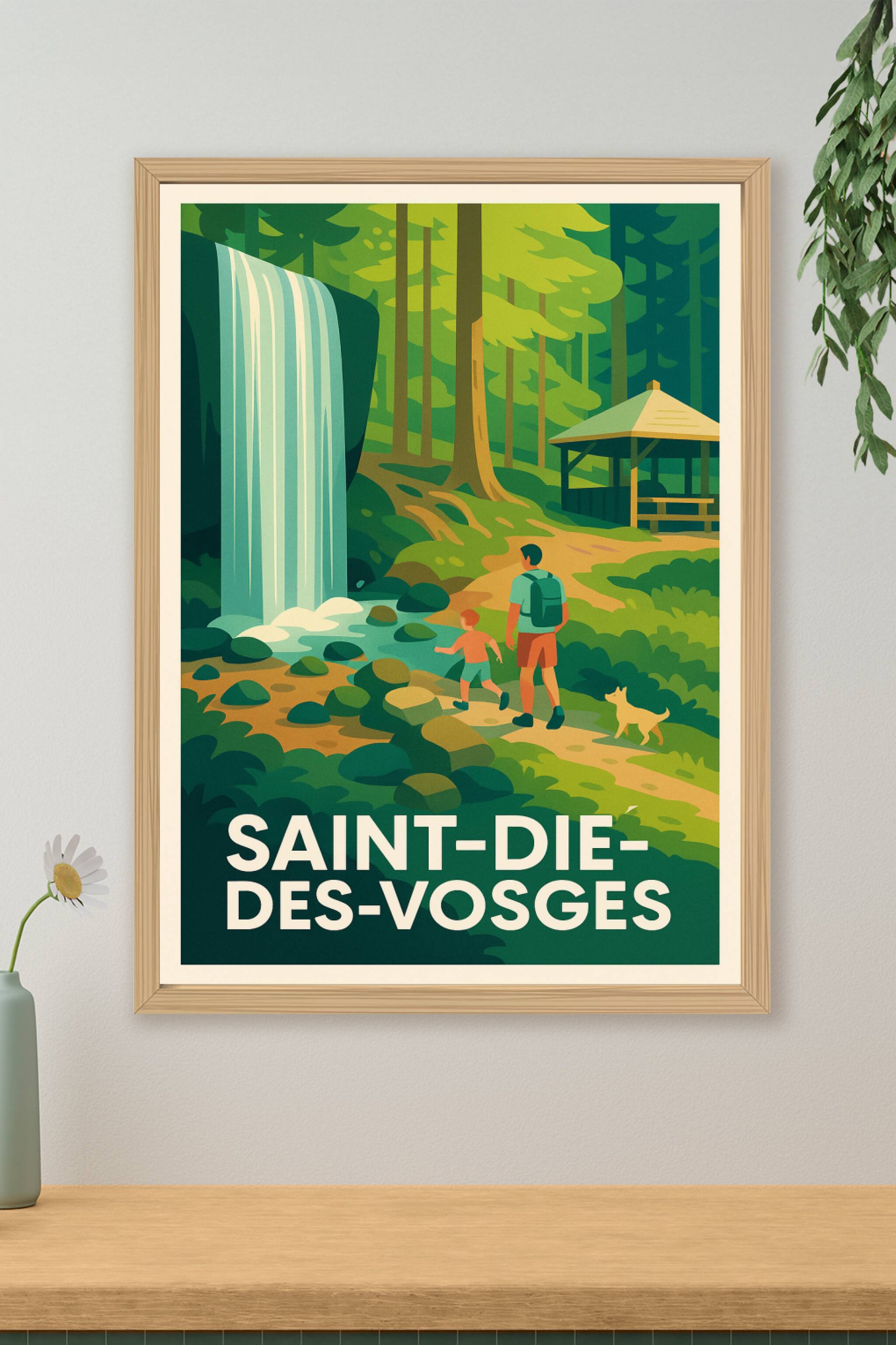 Découvrez la beauté sereine de Saint-Dié-des-Vosges avec cette affiche illustrée représentant une escapade au pied d'une cascade en pleine forêt. C...
