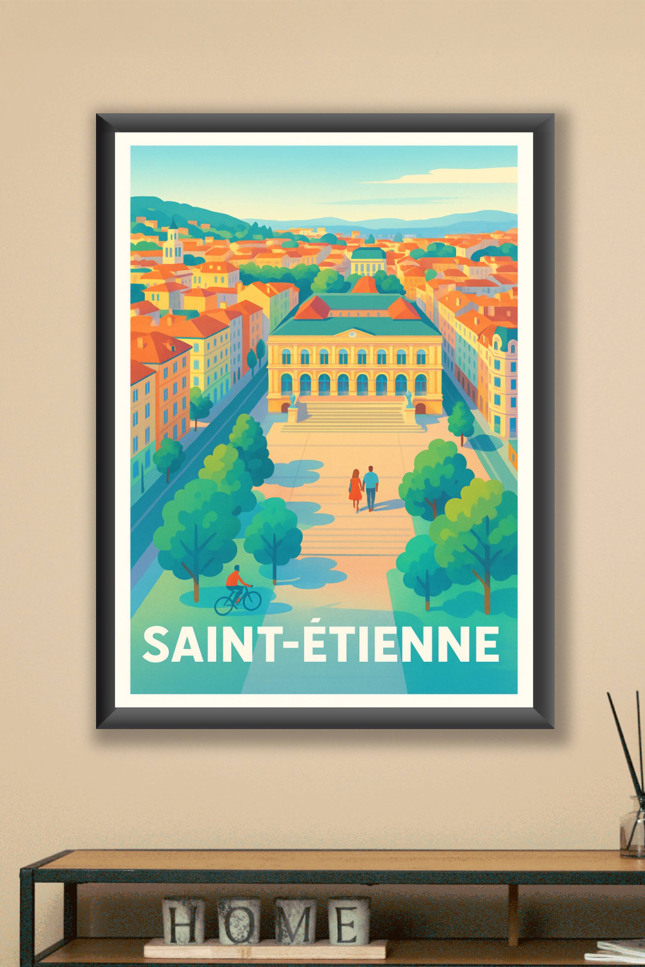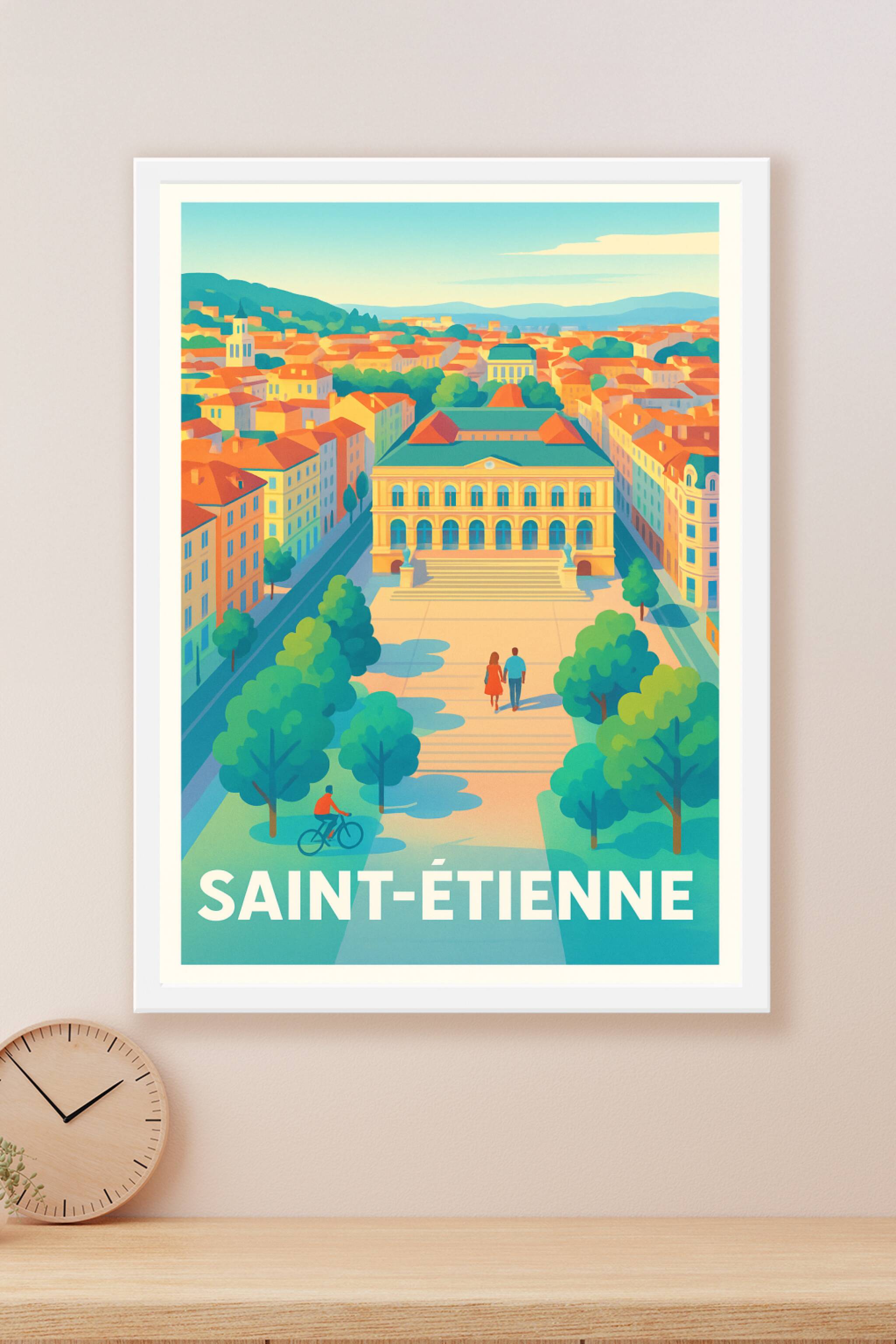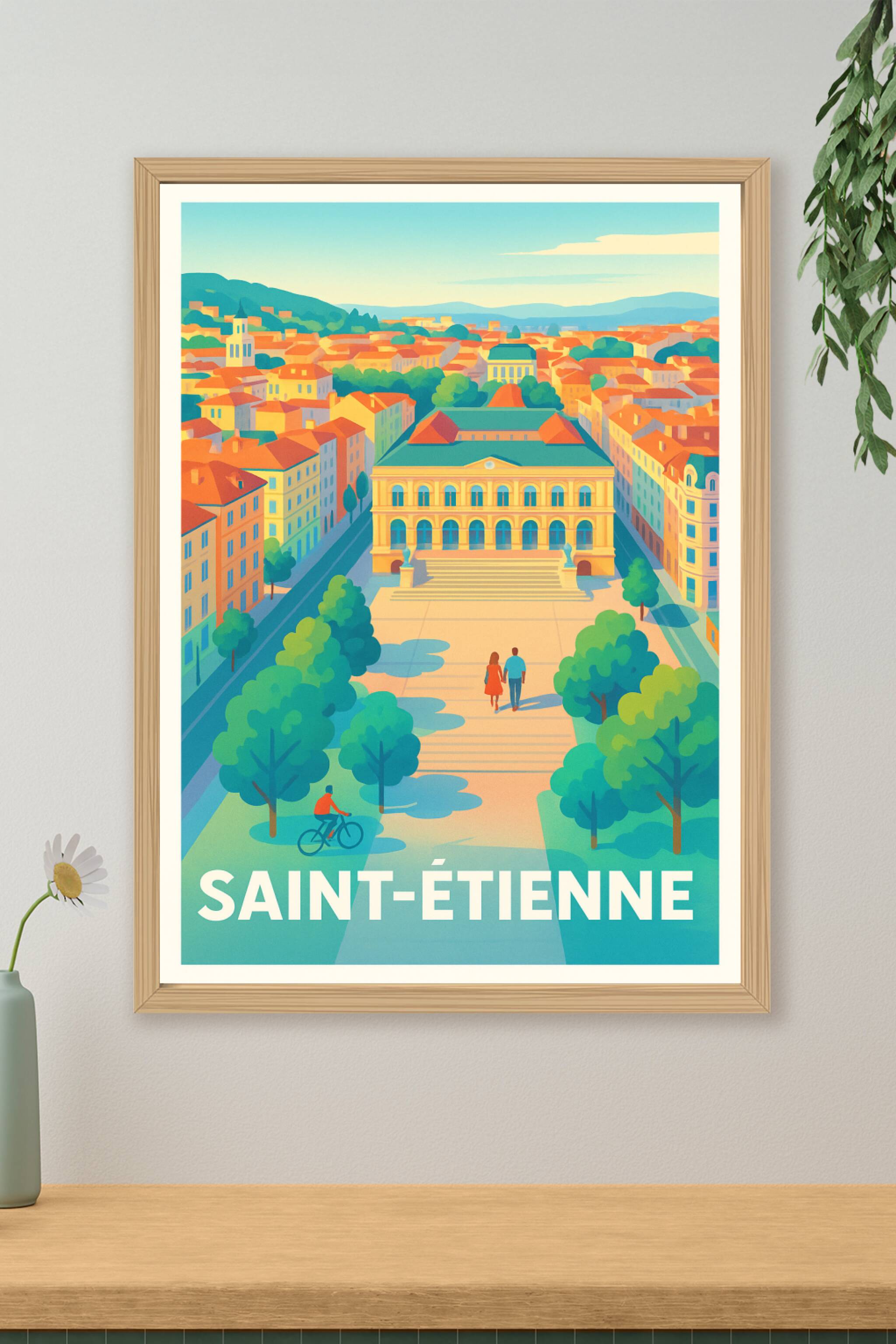 Découvrez l'élégance architecturale et la douceur de vivre de Saint-Étienne avec cette affiche illustrée aux couleurs chaudes et apaisantes. Ce pos...