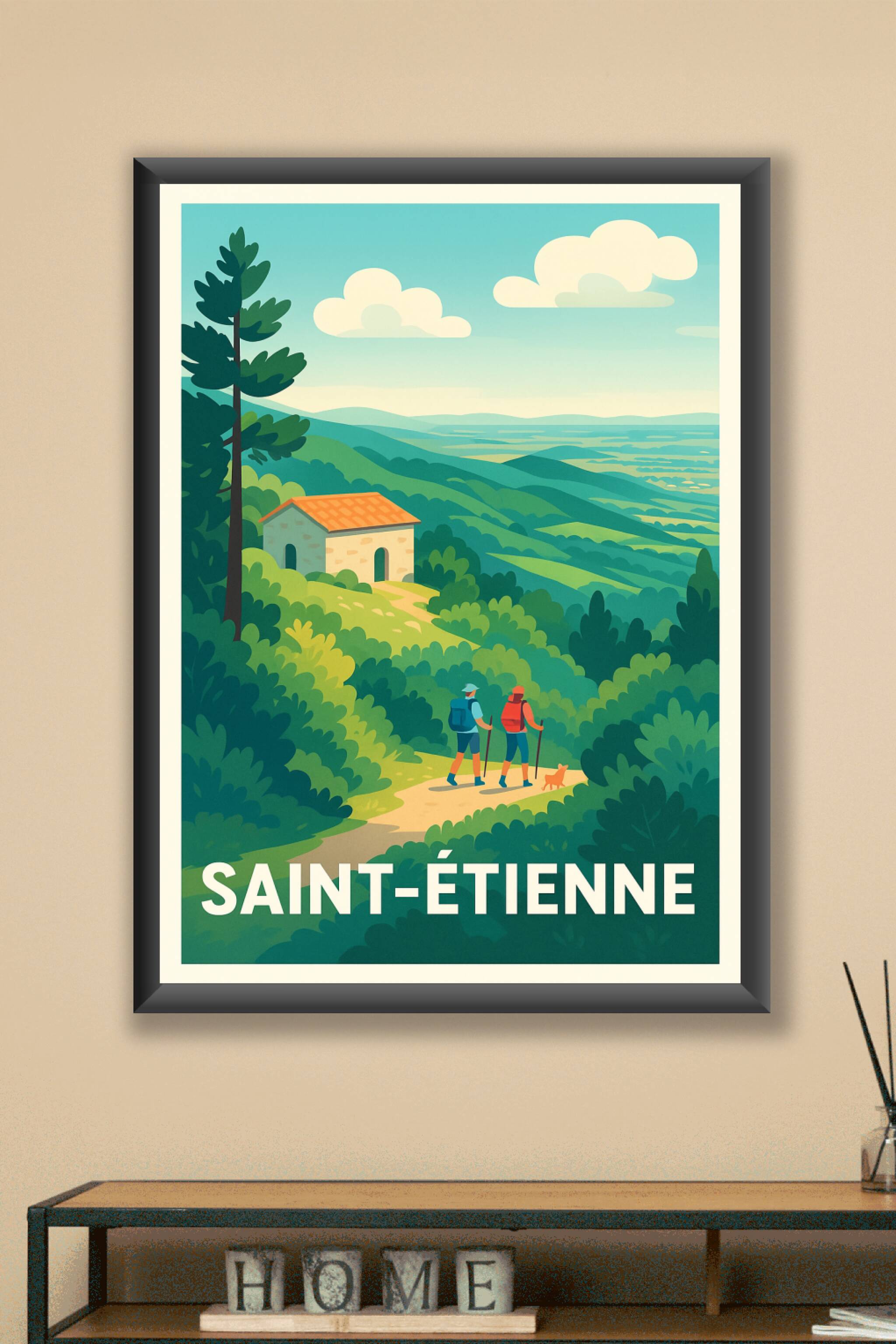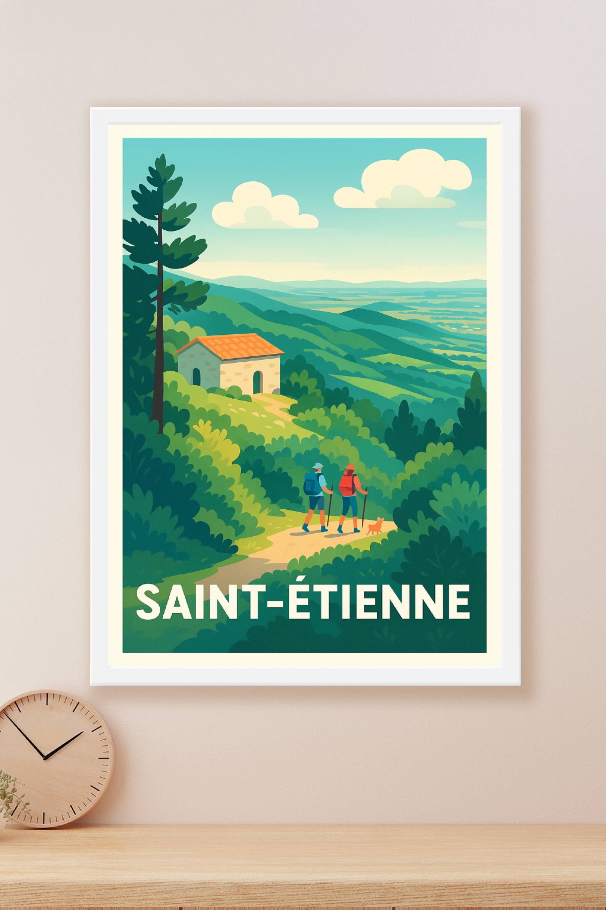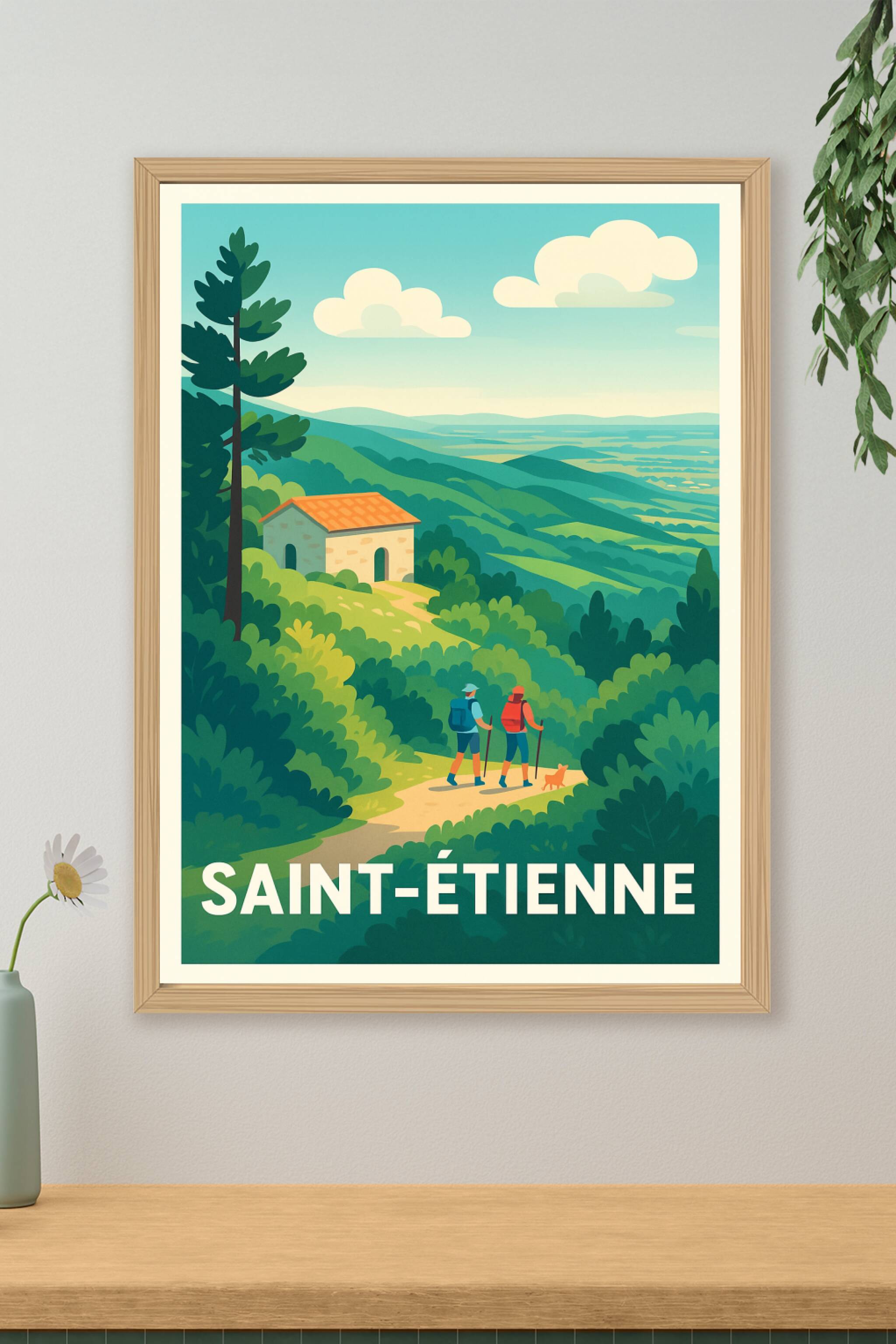 Découvrez la sérénité des paysages autour de Saint-Étienne avec cette affiche illustrée qui invite à la randonnée et à la détente au cœur des colli...