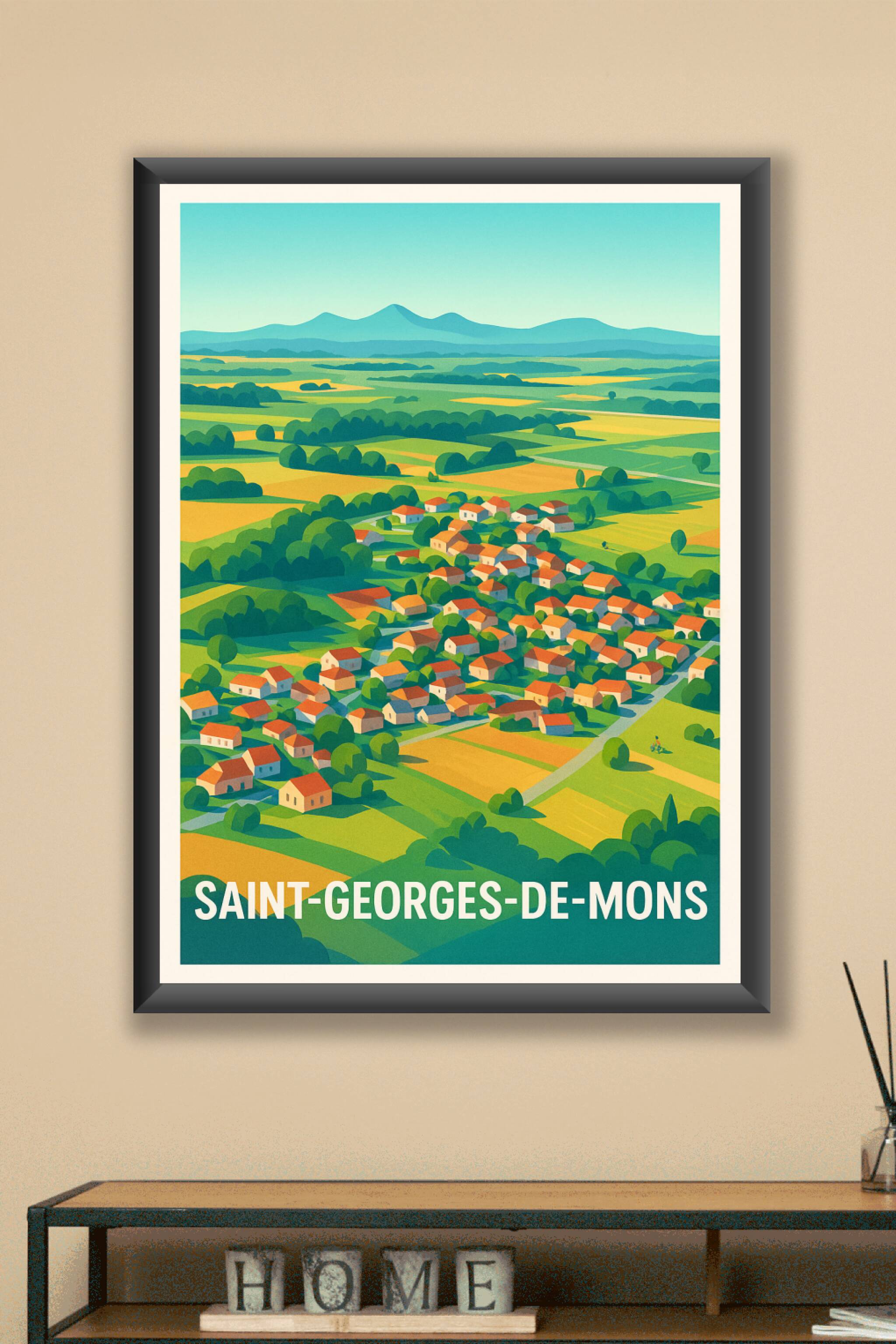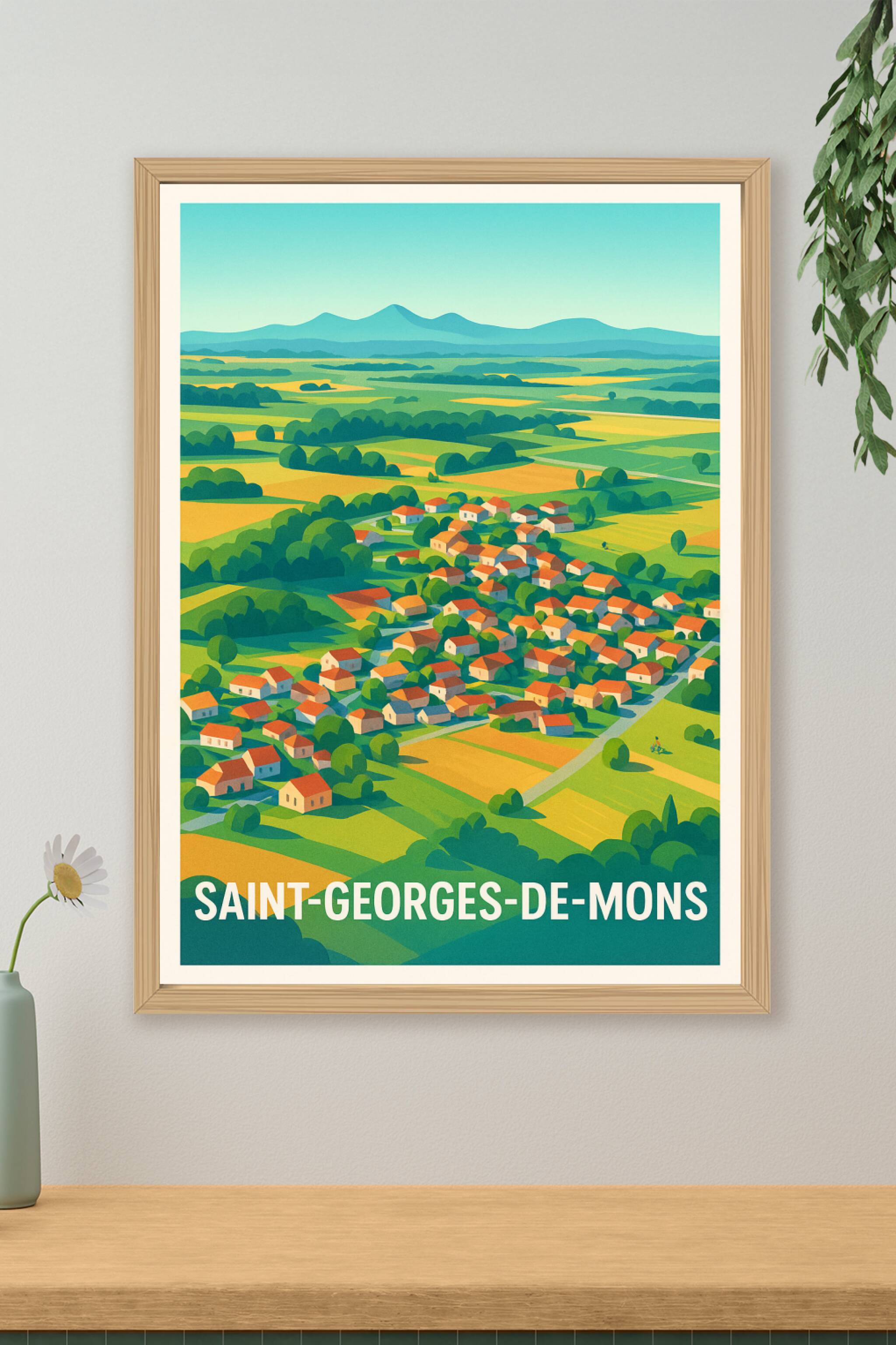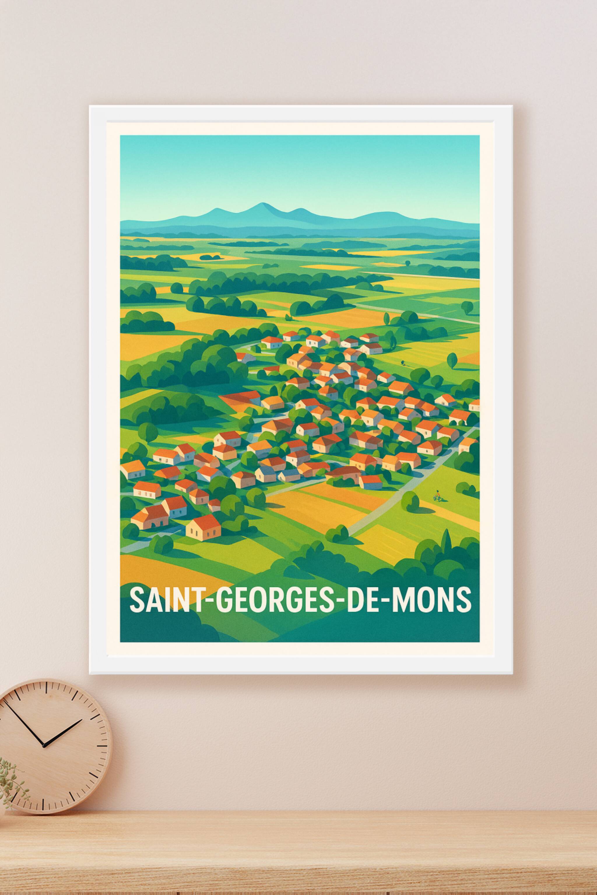 Découvrez cette superbe affiche illustrant le village pittoresque de Saint-Georges-de-Mons entouré des paysages verdoyants de la campagne auvergnat...