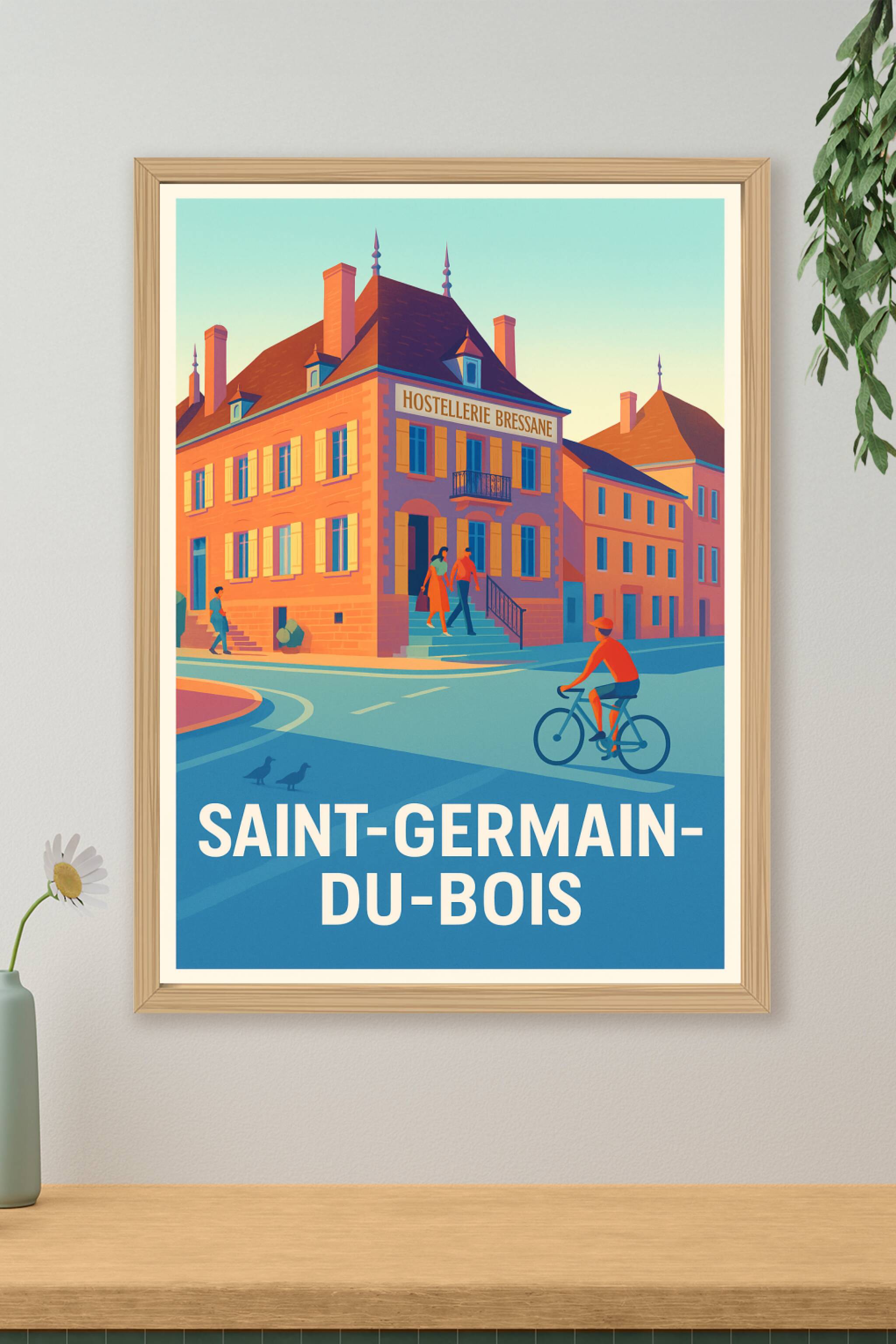Découvrez l'élégance paisible de Saint-Germain-du-Bois à travers cette affiche illustrée qui capture l'essence d'une journée lumineuse dans ce village typique. L'Hostellerie Bressane et ses maisons traditionnelles s'animent doucement avec des habitants en balade et un cycliste, dans un jeu subtil de lumière et ombrage.Ce poster est proposé en tirage "Fine Art" de haute qualité, imprimé sur papier 305g coton, garantissant des couleurs éclatantes et un rendu parfait. Disponible en dimensions A1 à A4, avec ou sans cadre, il s'adapte à tous vos espaces pour apporter une touche authentique et élégante à votre décoration. Imprimé en France, ce poster est un choix parfait pour les amateurs de décoration raffinée ou pour offrir un souvenir unique de Saint-Germain-du-Bois.