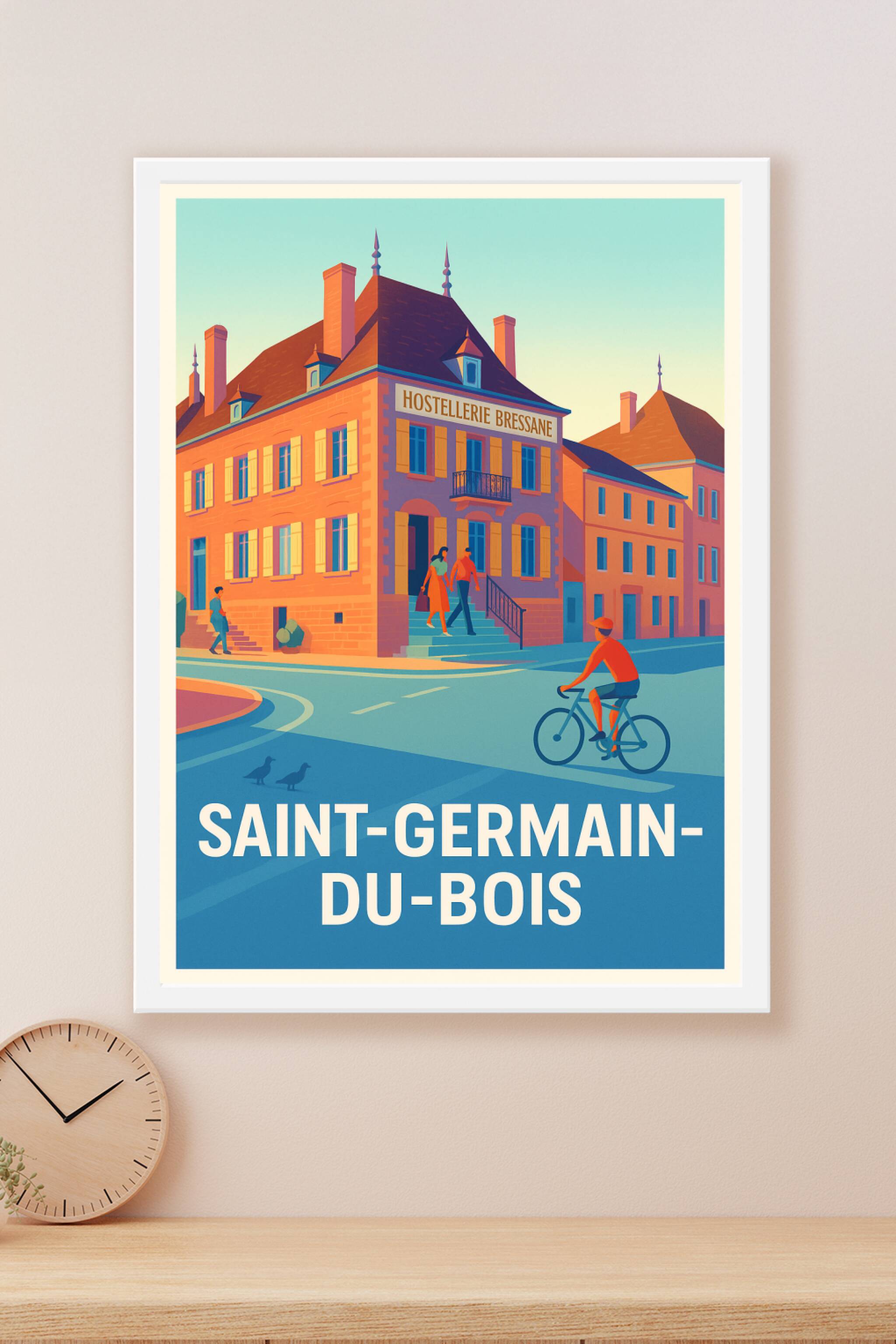 Découvrez l'élégance paisible de Saint-Germain-du-Bois à travers cette affiche illustrée qui capture l'essence d'une journée lumineuse dans ce vill...