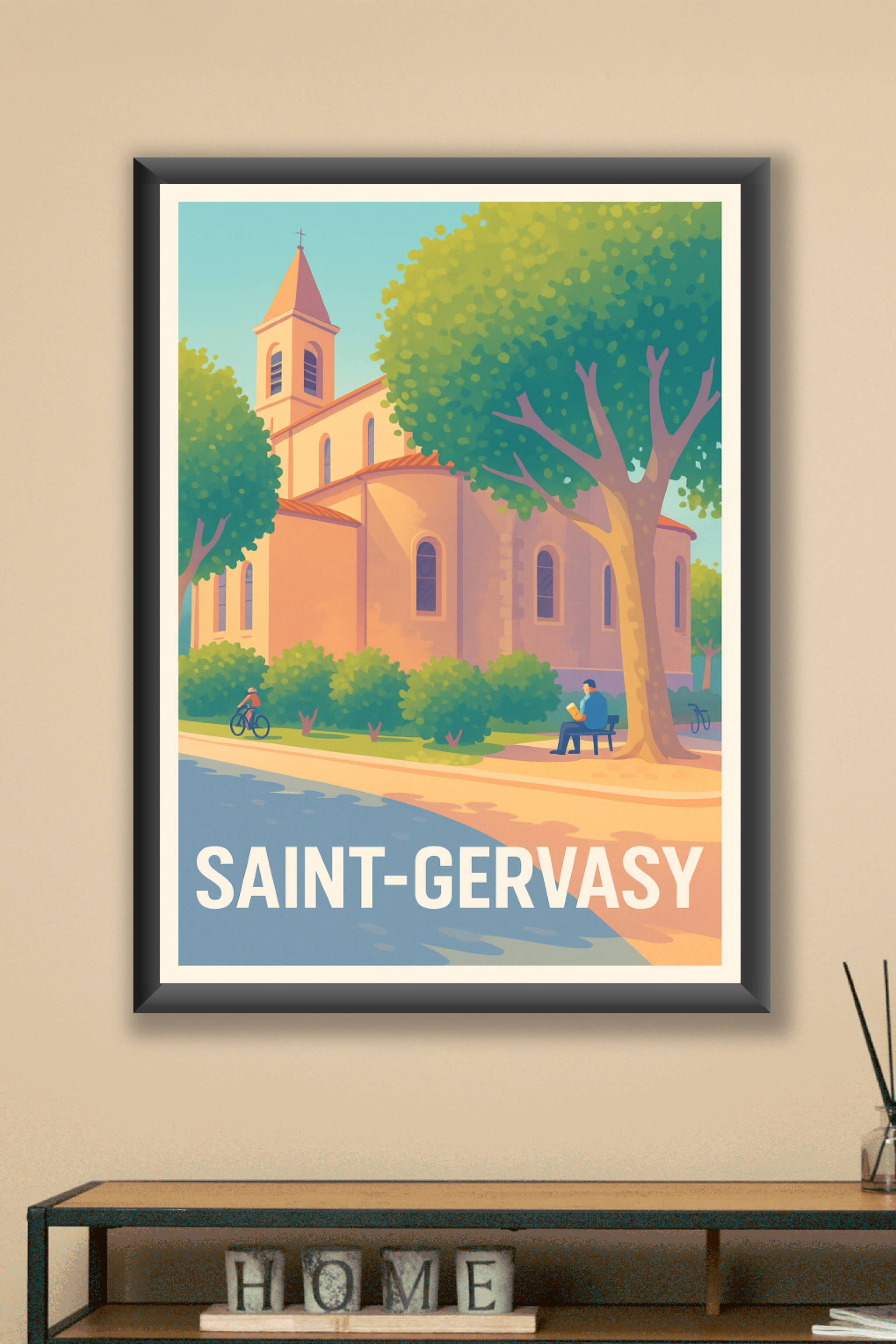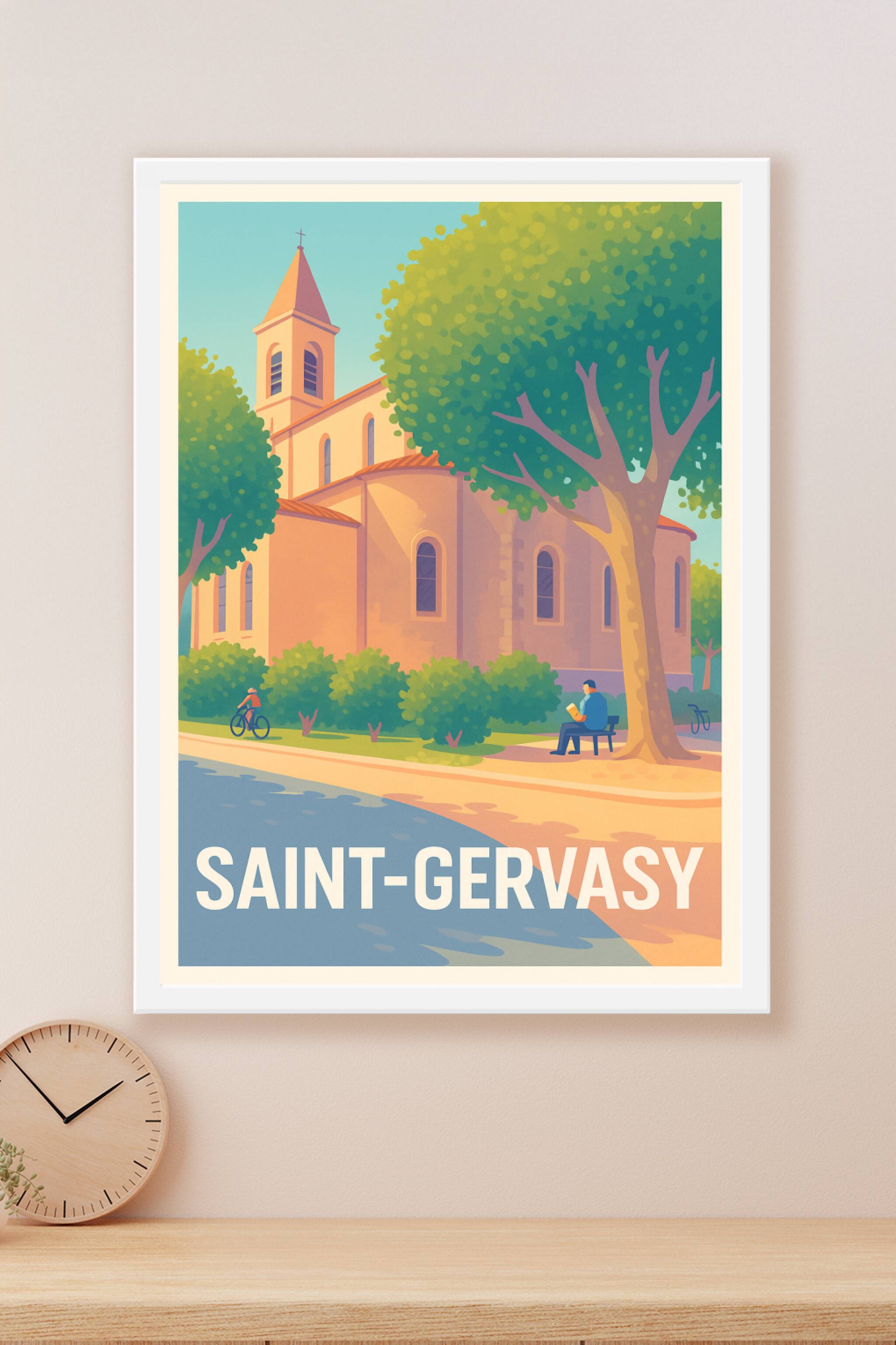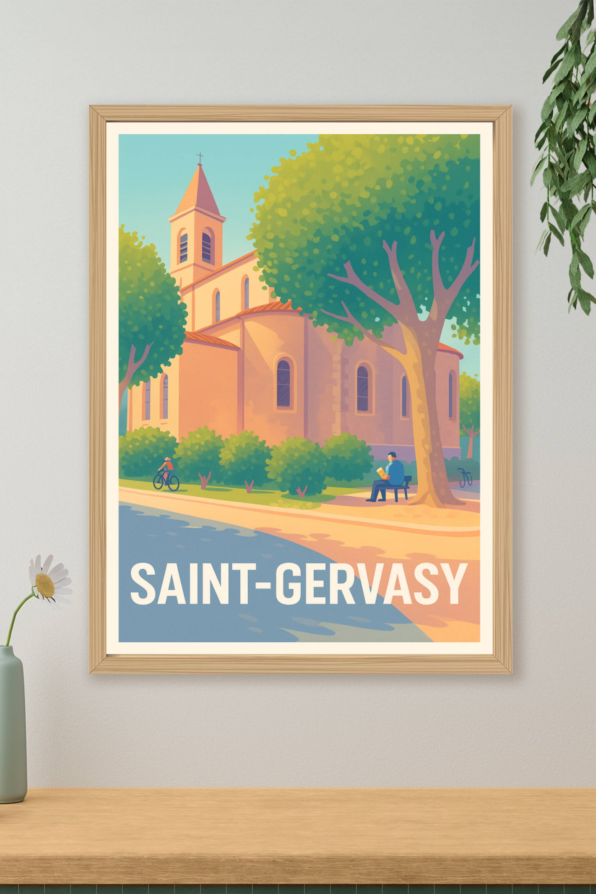 Découvrez le calme et la douceur de vivre à Saint-Gervasy avec cette affiche illustrée mettant en scène une église baignée par une lumière douce, e...