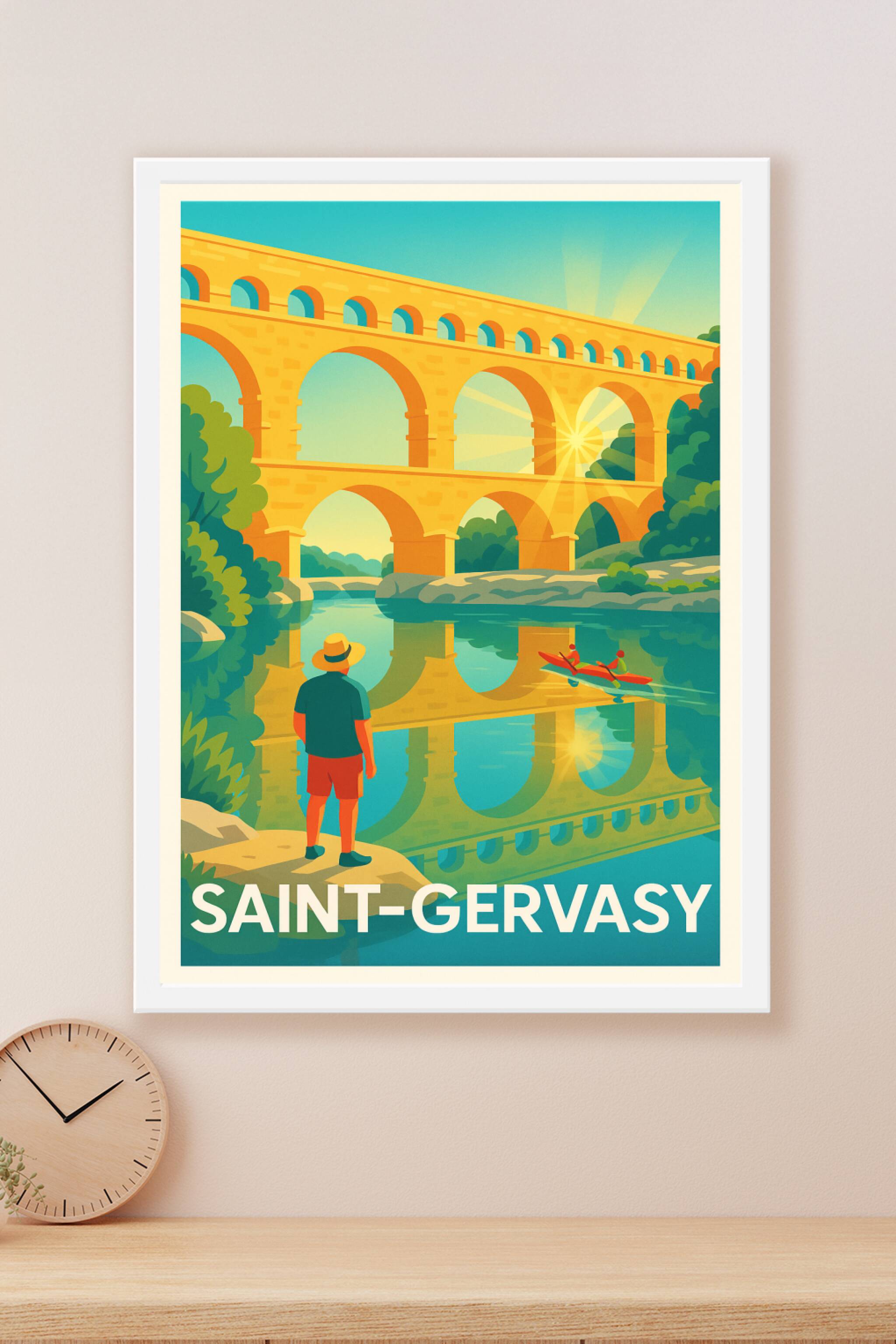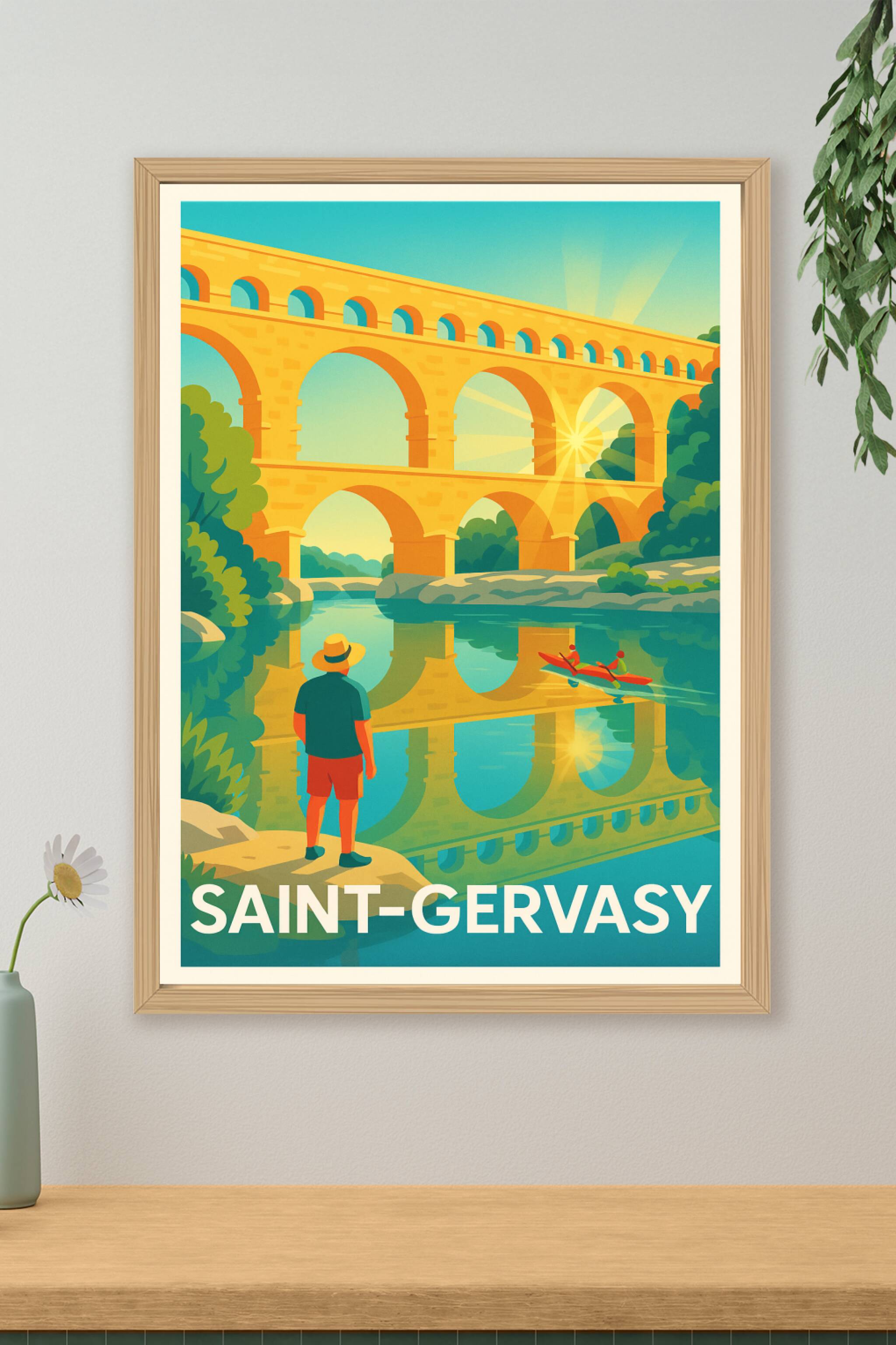 Découvrez l'emblématique Pont du Gard dans toute sa splendeur avec cette affiche vibrante qui capture la magie d'une fin de journée ensoleillée. Ce poster illustré met en scène un paysage serein où les couleurs chaudes du monument se reflètent parfaitement dans les eaux calmes, offrant une ambiance apaisante et authentique.Le tirage 'Fine Art' est réalisé sur un papier 305g coton de haute qualité, garantissant des couleurs éclatantes et une durabilité exceptionnelle. Disponible en formats A1 à A4, avec ou sans cadre, cette affiche s'intègre parfaitement à tous types d'intérieurs, qu'ils soient modernes ou traditionnels.Offrez-vous un souvenir élégant et artisanal de Saint-Gervasy, imprimé en France avec soin, pour sublimer votre décoration ou faire un cadeau unique aux passionnés des merveilles du patrimoine français.