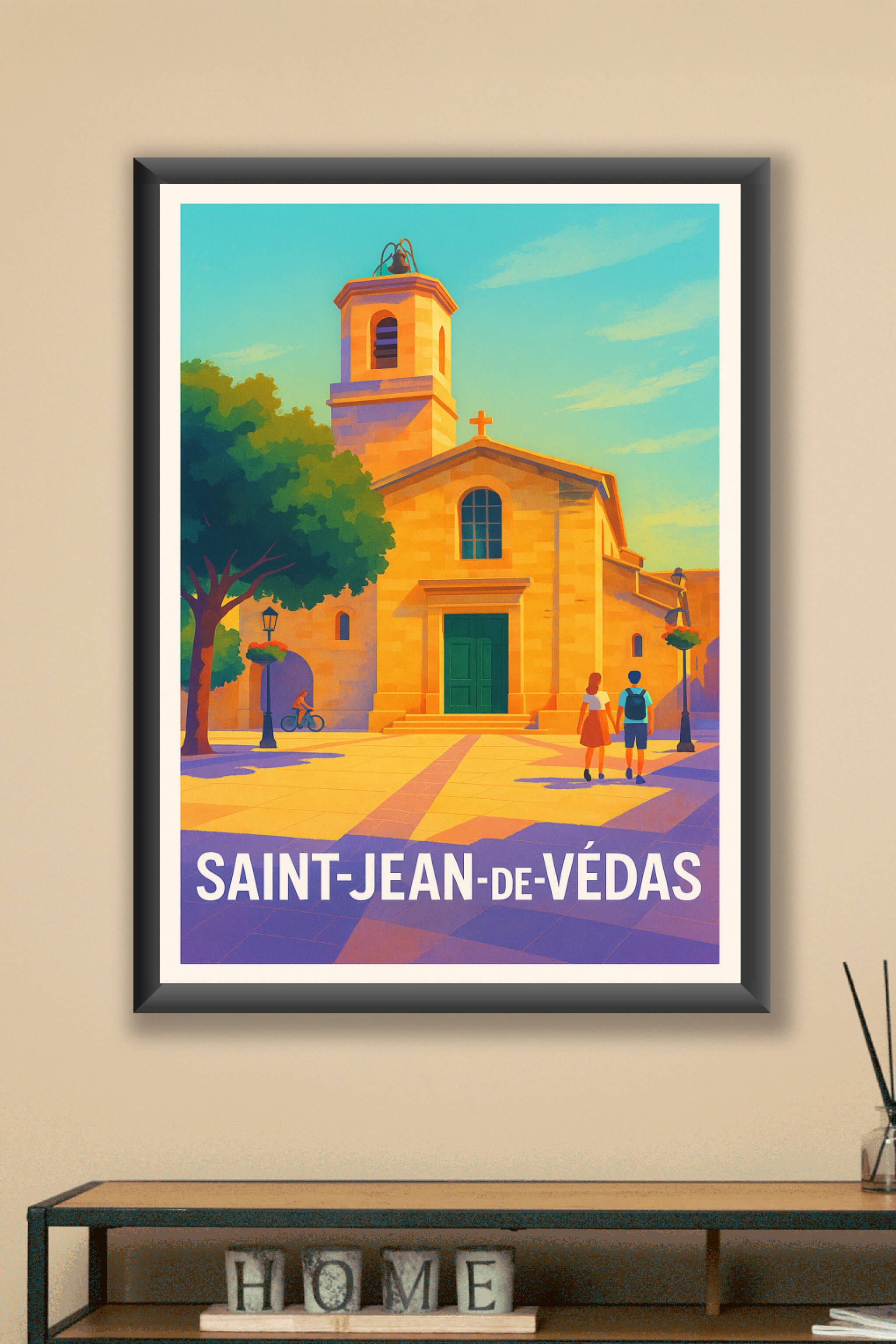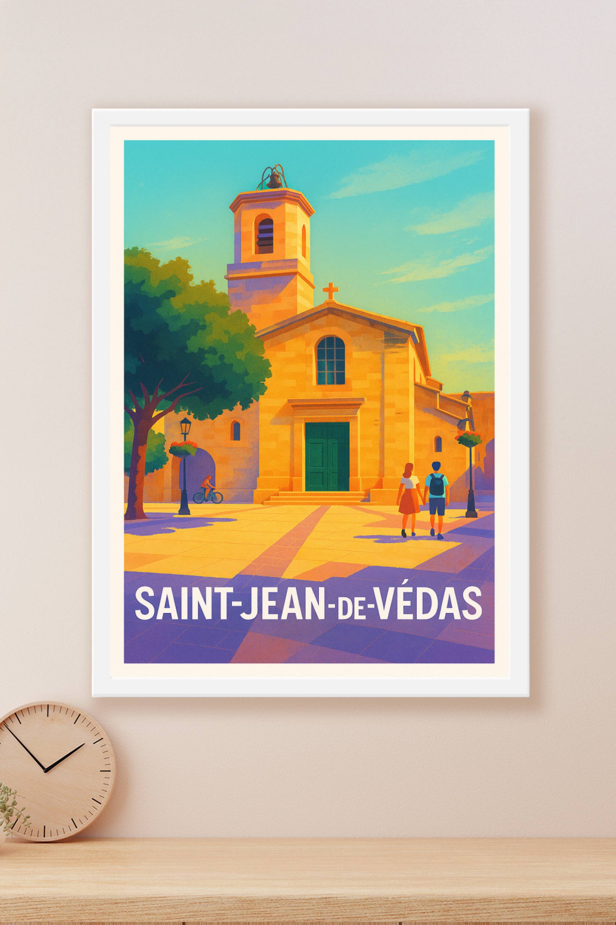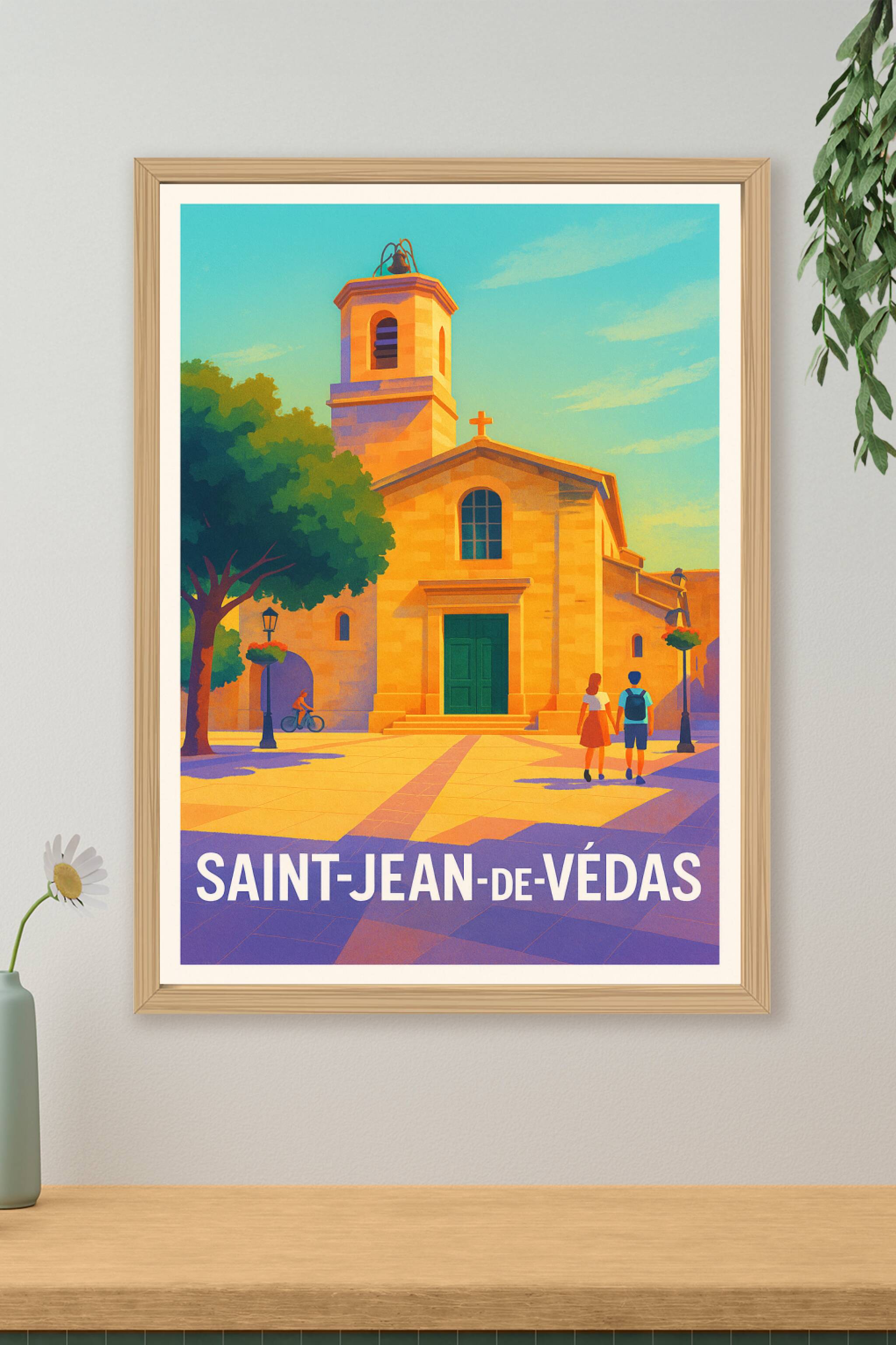Découvrez le charme authentique de Saint-Jean-de-Védas avec cette superbe affiche illustrée représentant une église baignée par la lumière dorée du...