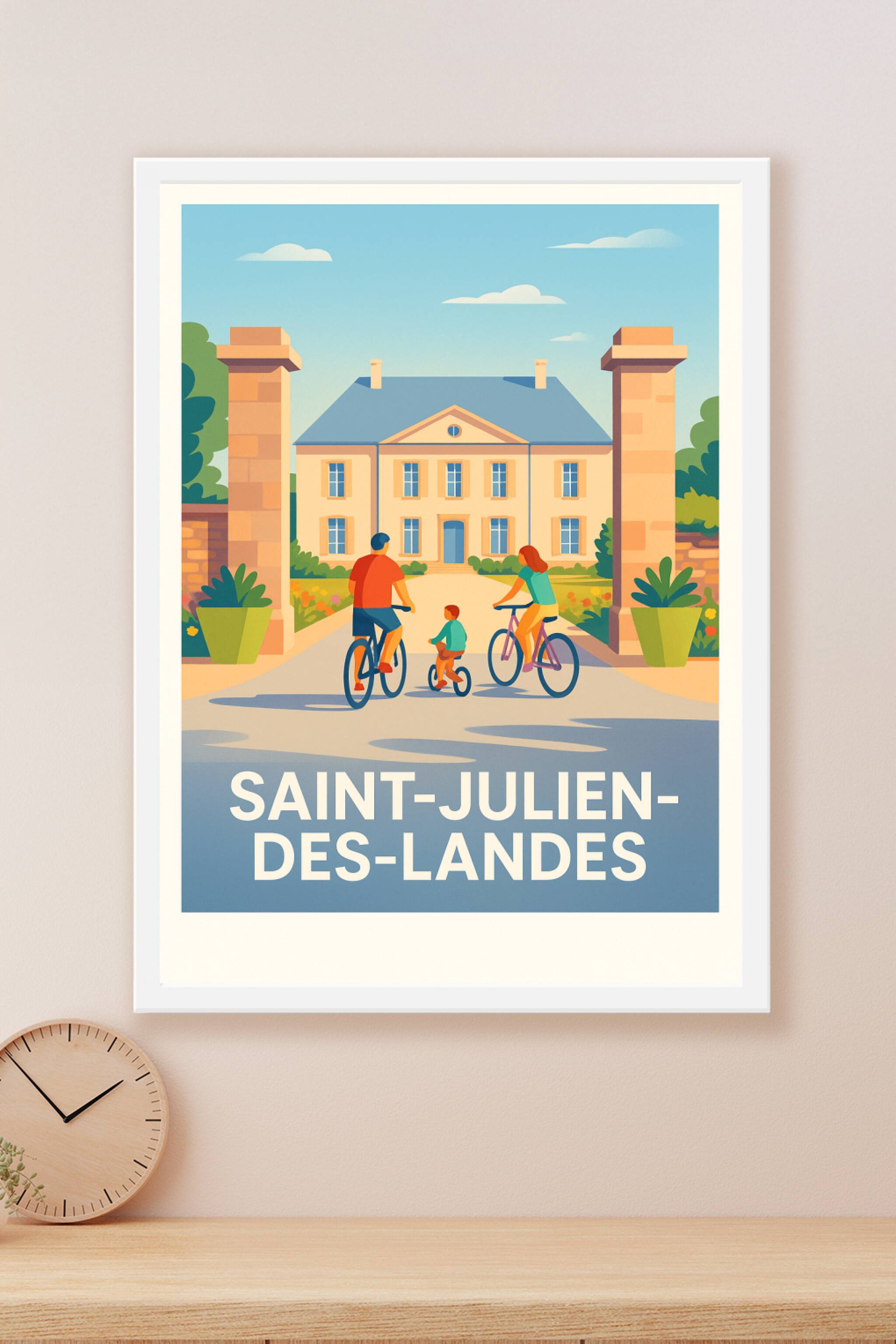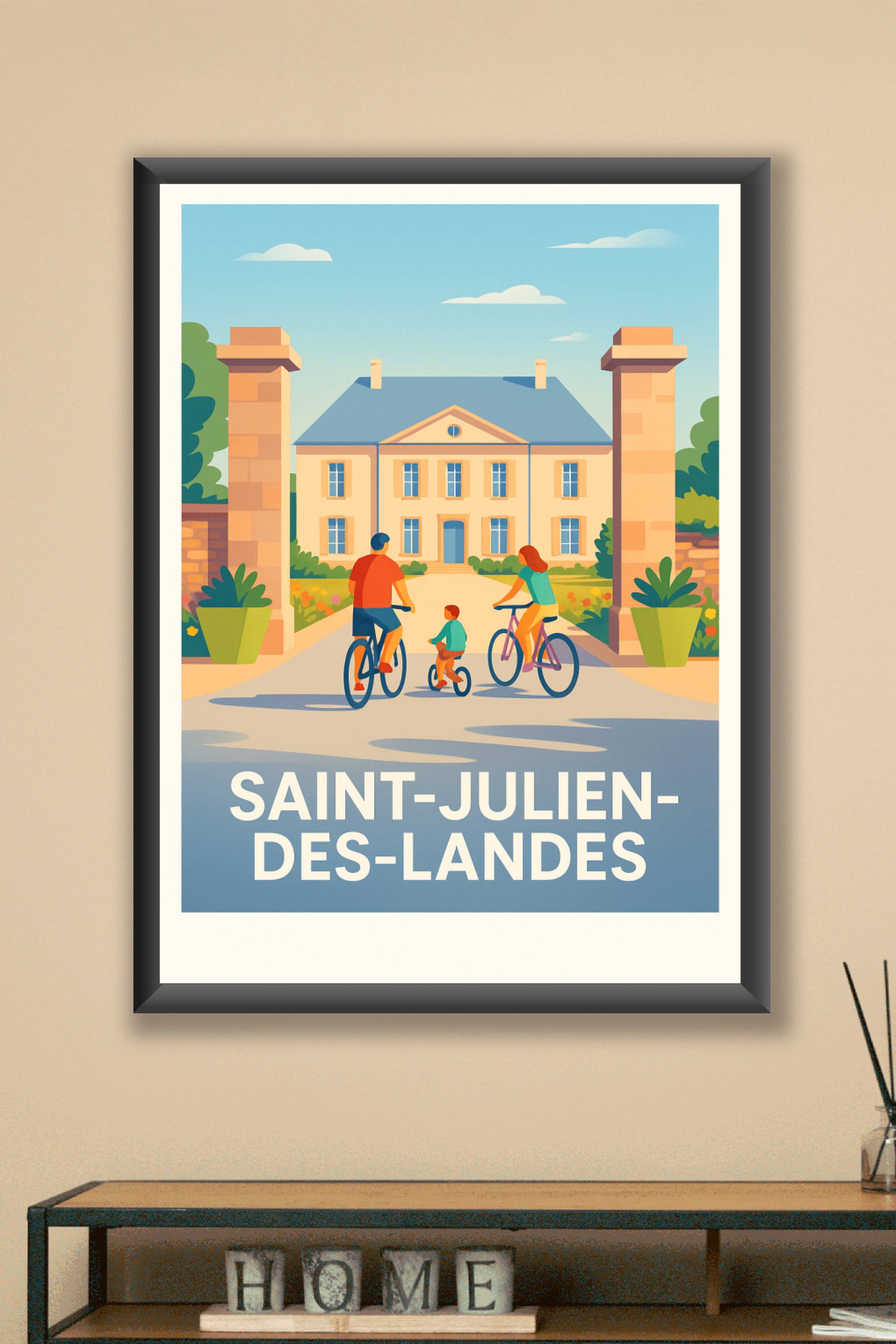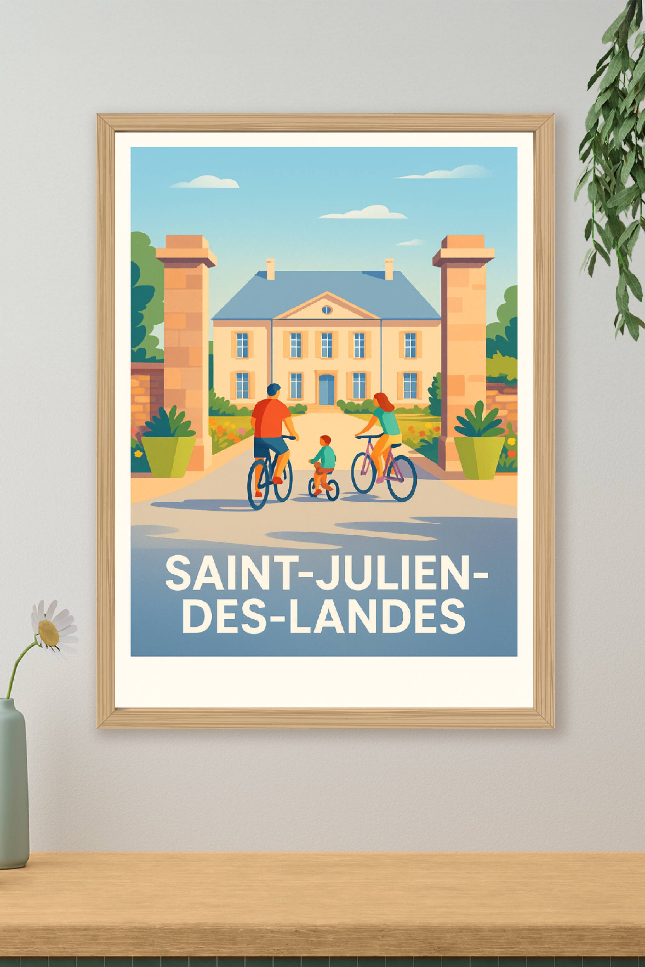 Découvrez la douceur de vivre à Saint-Julien-des-Landes avec cette affiche illustrée pleine de charme, représentant une famille parcourant à vélo l...