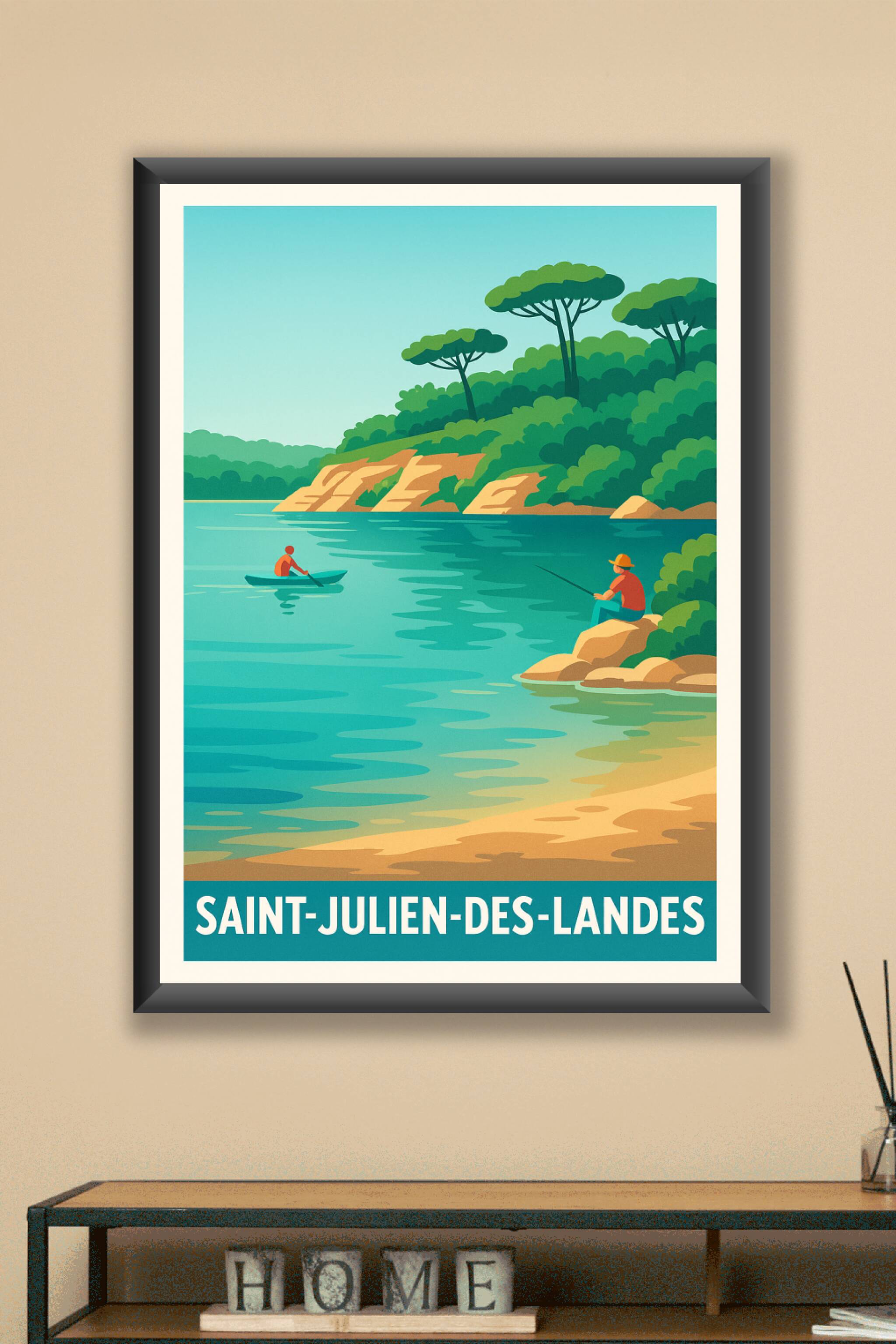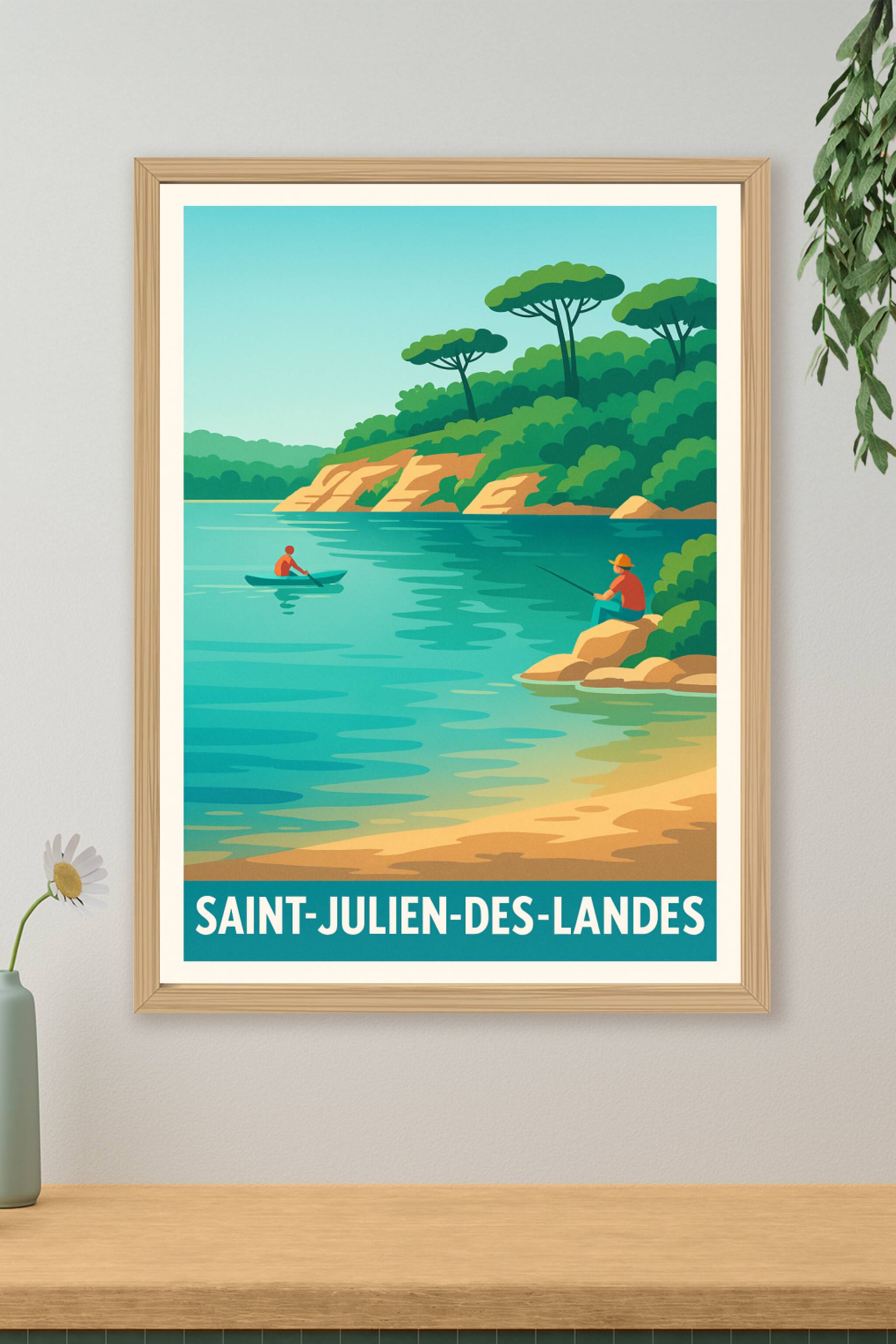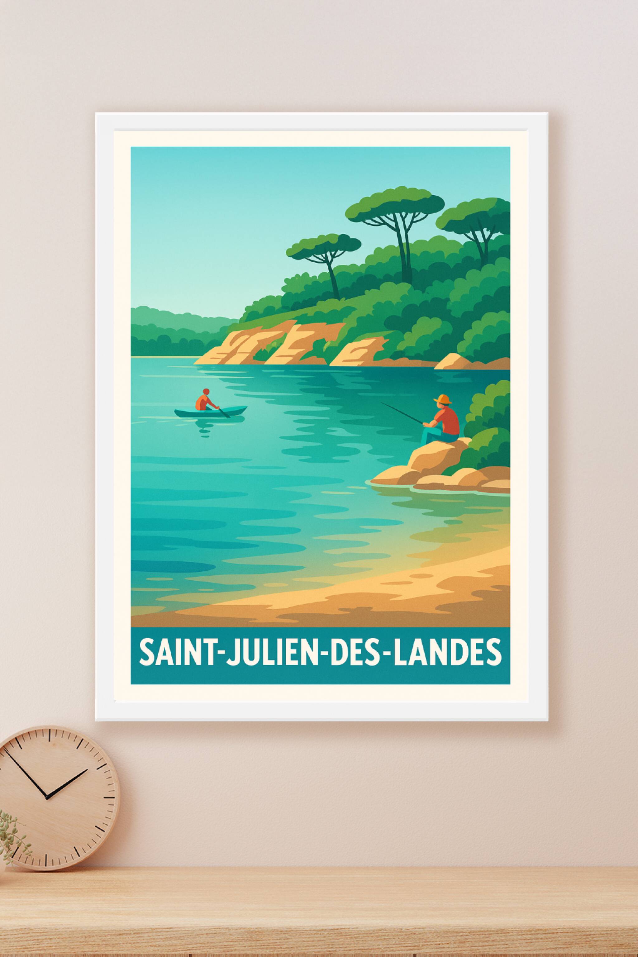 Emportez un souffle de sérénité avec ce poster illustré représentant un paysage paisible de Saint-Julien-des-Landes, où la nature verdoyante rencontre les eaux calmes d'un lac idéal pour la pêche et la balade en canoë. Cette affiche au style vintage moderne capture l'esprit d'une escapade champêtre et invite à la détente. Imprimée en tirage Fine Art sur un papier 305g coton de grande qualité, elle garantit des couleurs lumineuses et une finition haut de gamme, parfaite pour sublimer votre intérieur. Disponible en formats A1, A2, A3 et A4, avec ou sans cadre, cette affiche est un choix raffiné pour décorer votre maison ou offrir un cadeau original aux amoureux de la nature et des ambiances apaisantes.