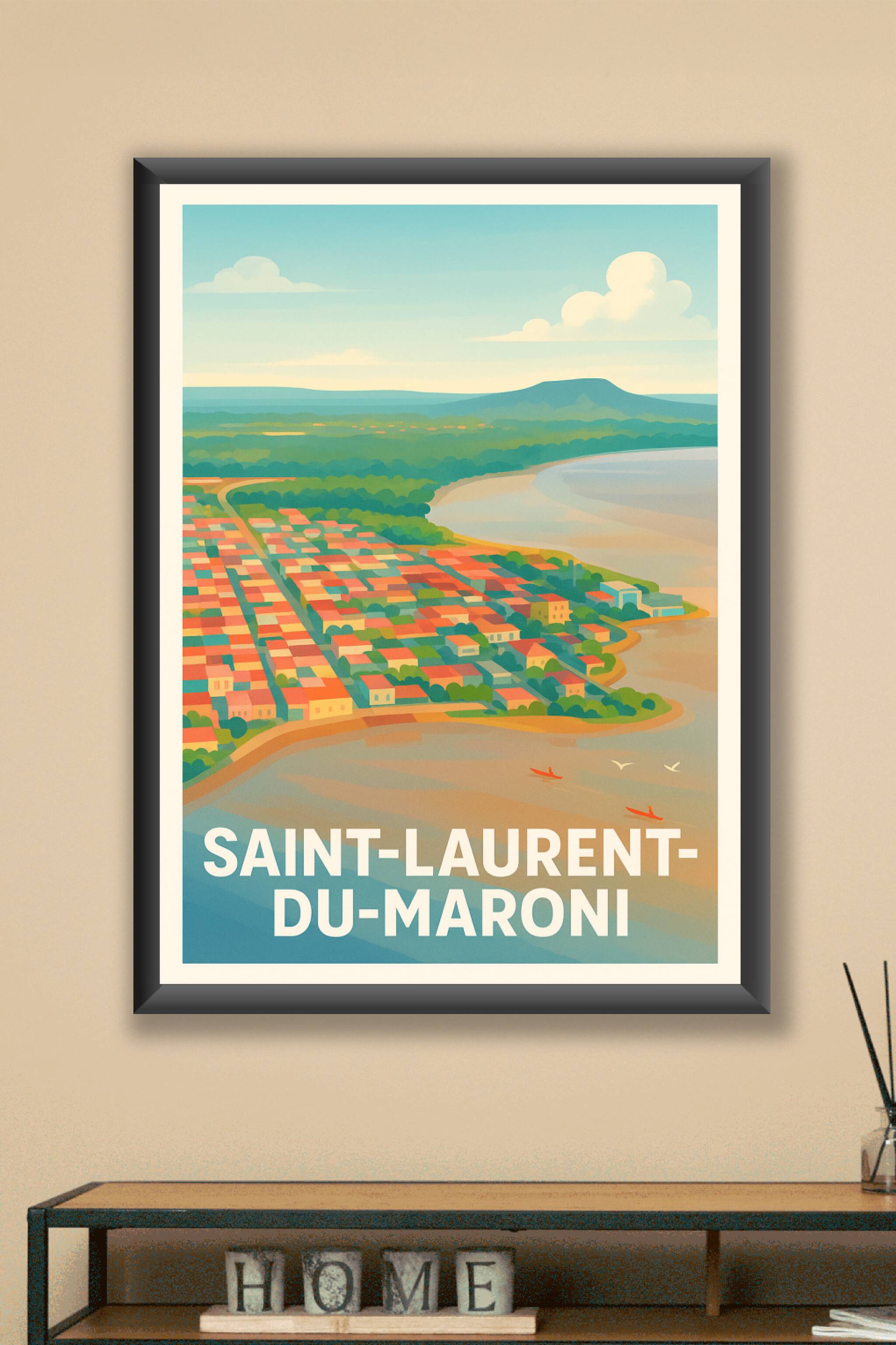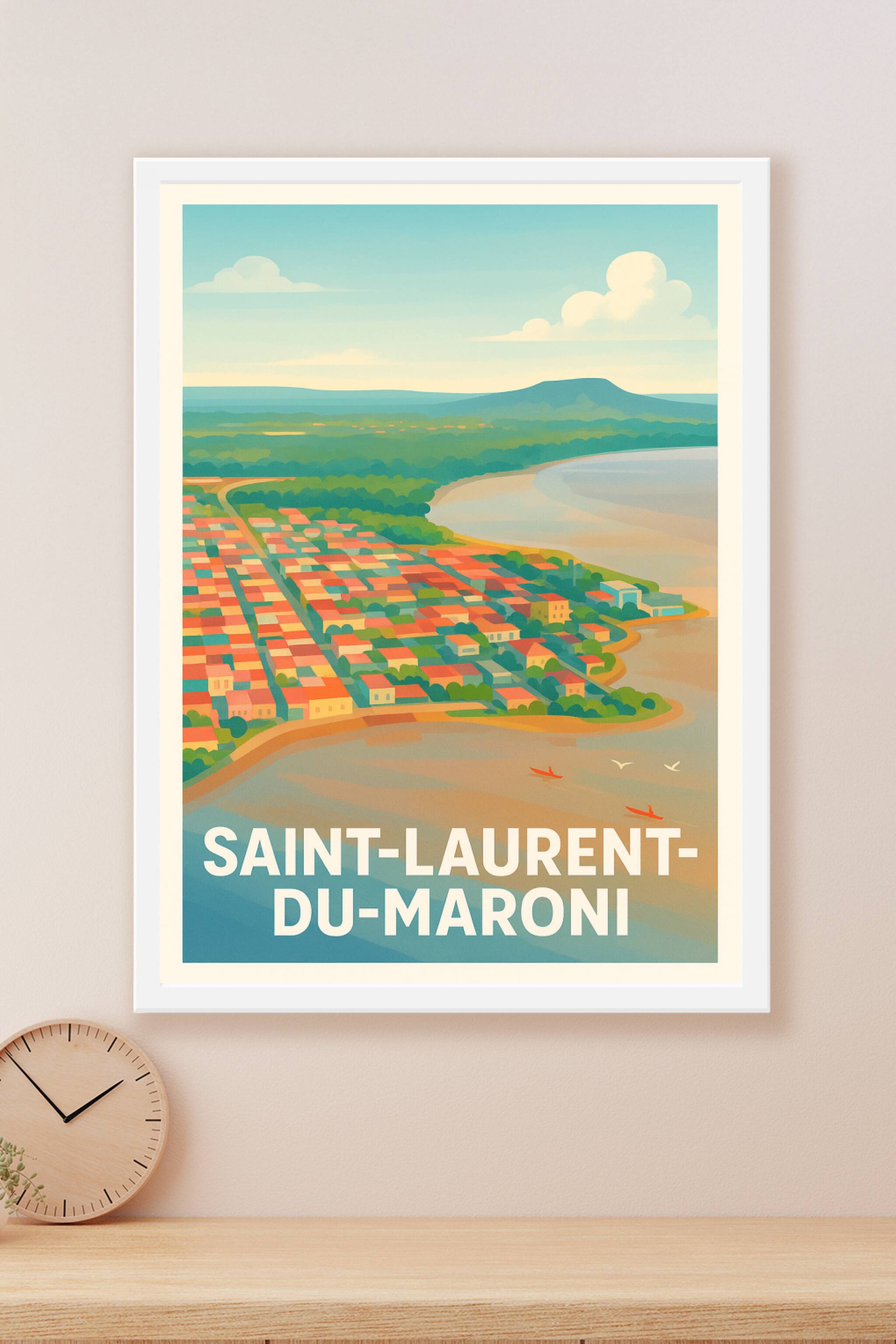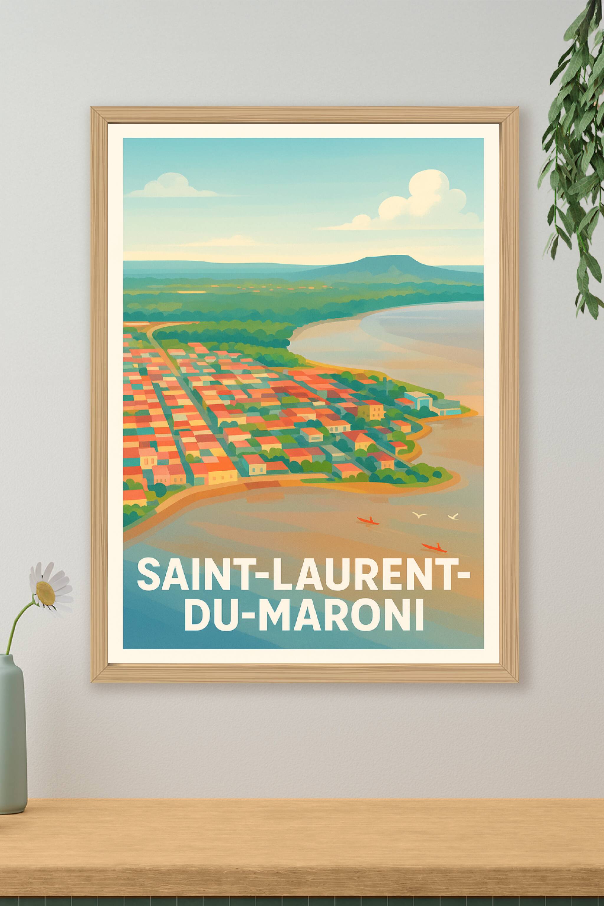 Découvrez Saint-Laurent-du-Maroni à travers cette affiche inspirante qui capture la douceur tropicale de cette ville amazone, avec ses toits coloré...