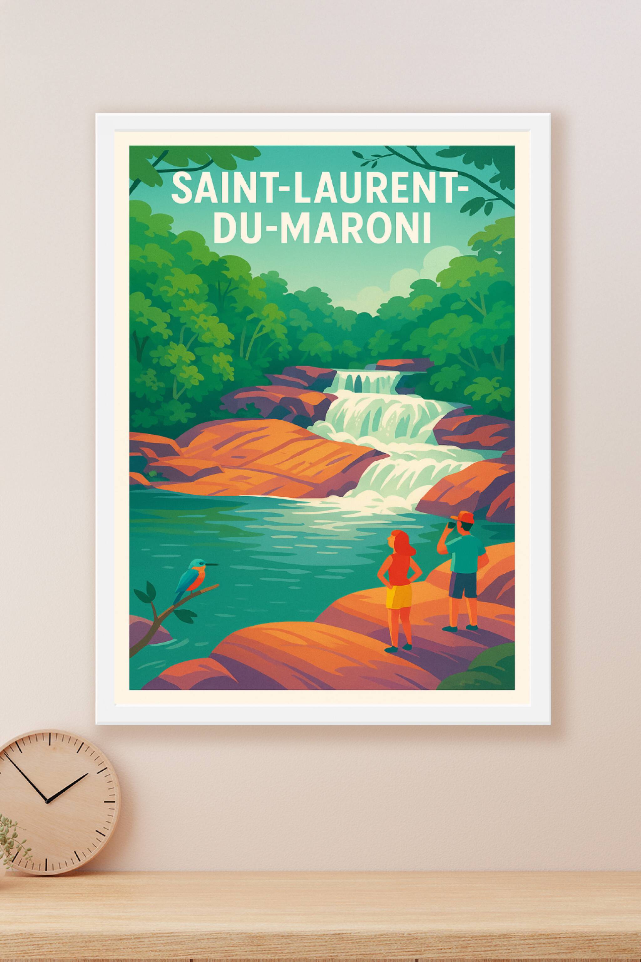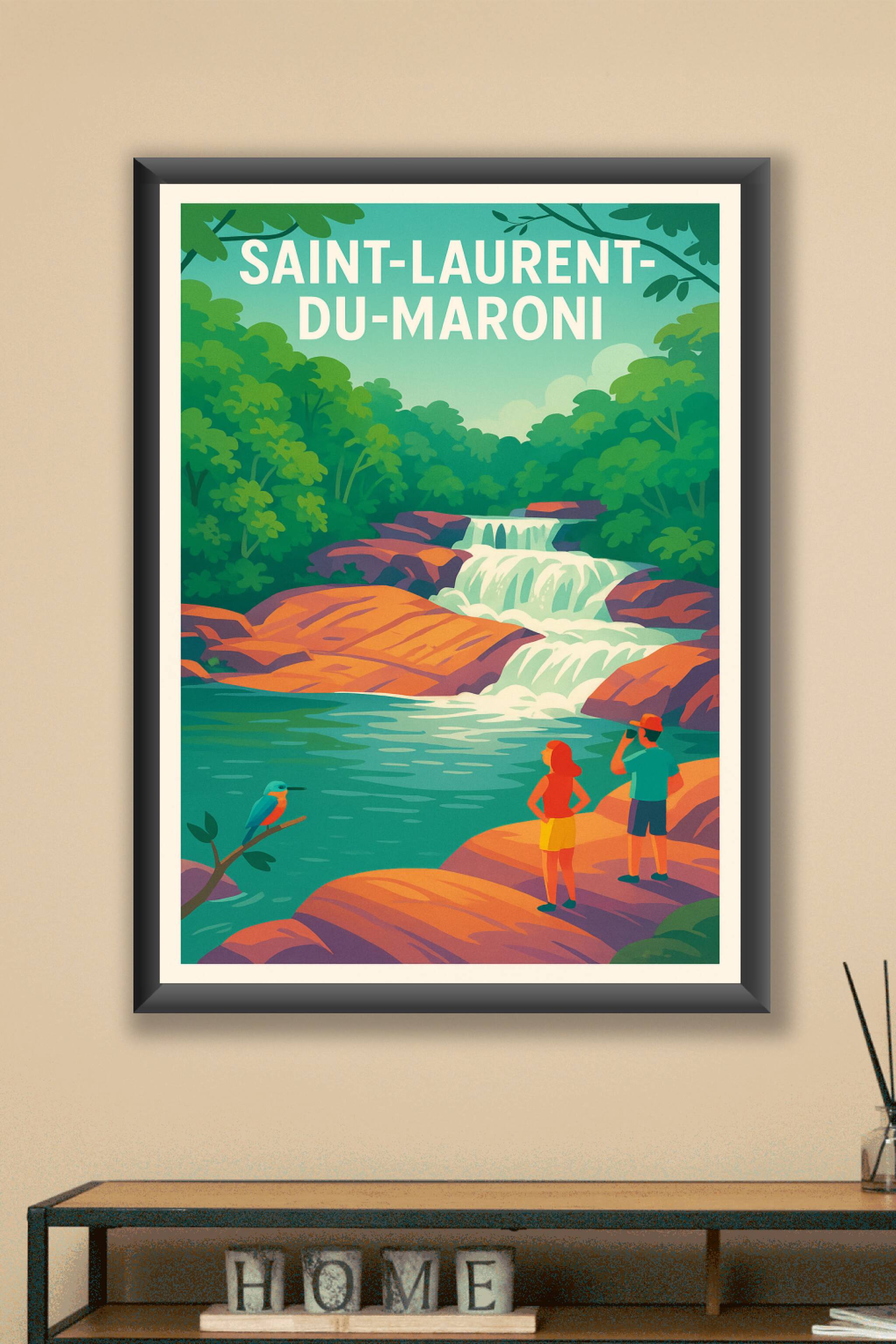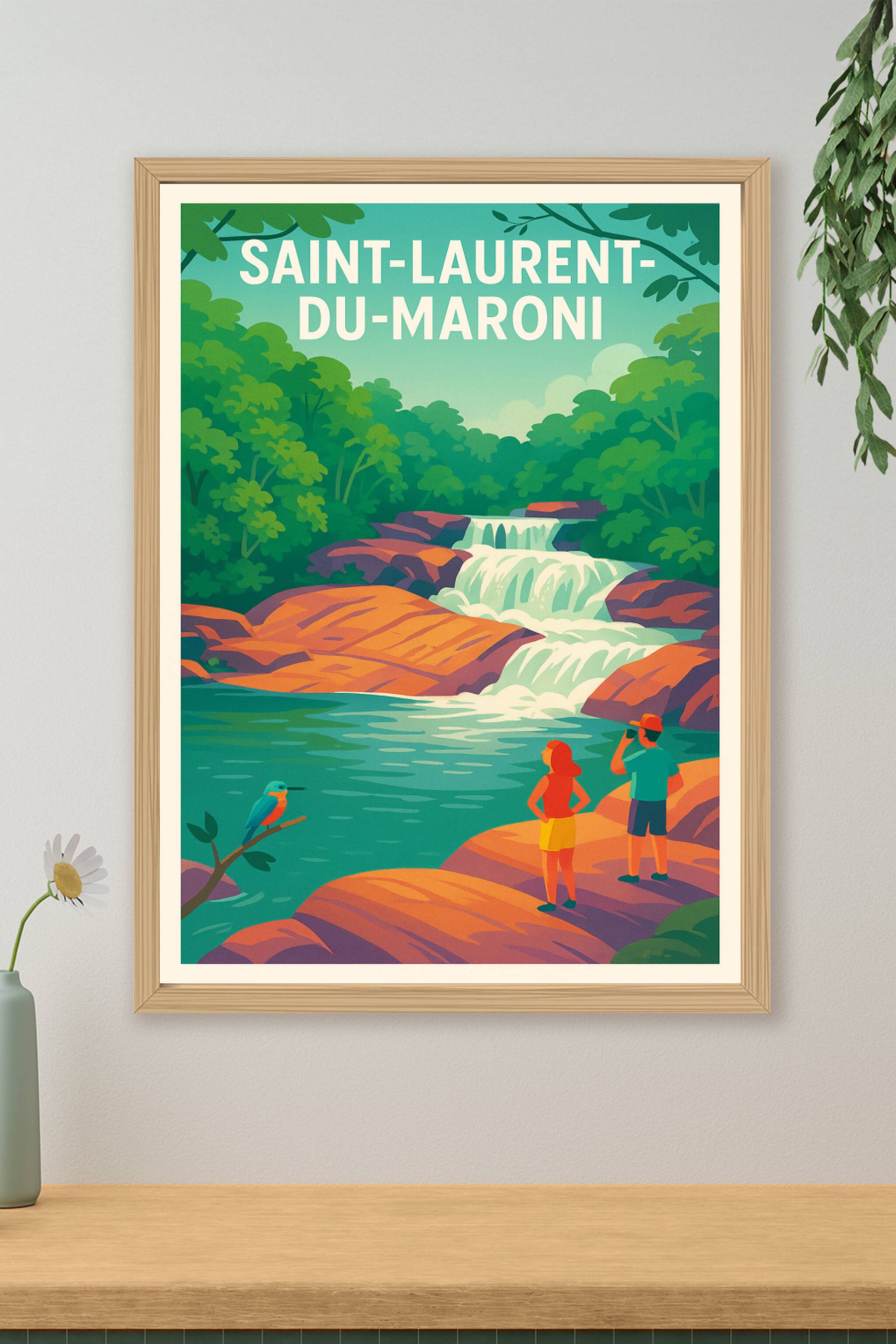 Découvrez la beauté naturelle et sauvage de Saint-Laurent-du-Maroni avec cette affiche au style rétro illustrant une paisible cascade entourée d'un...