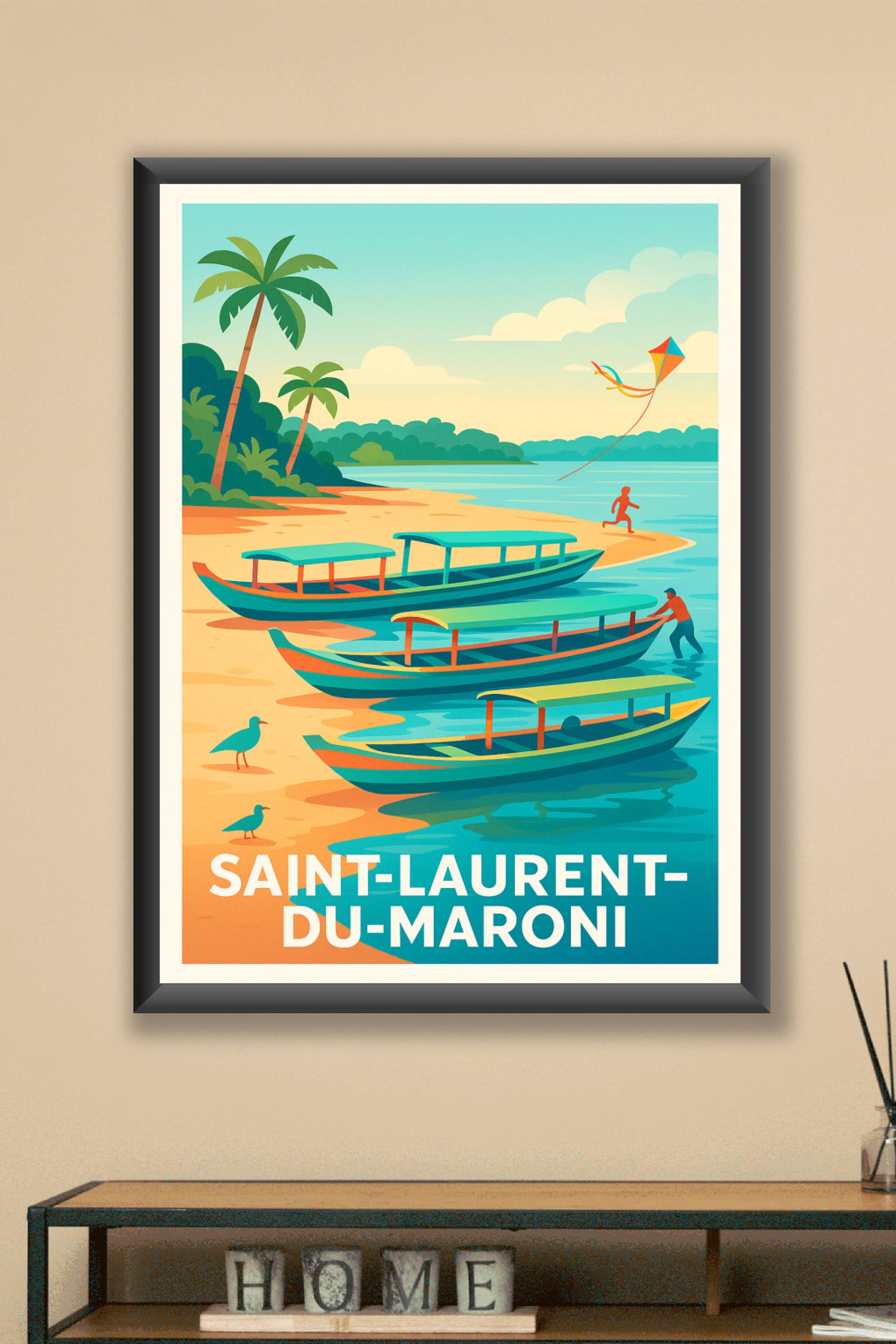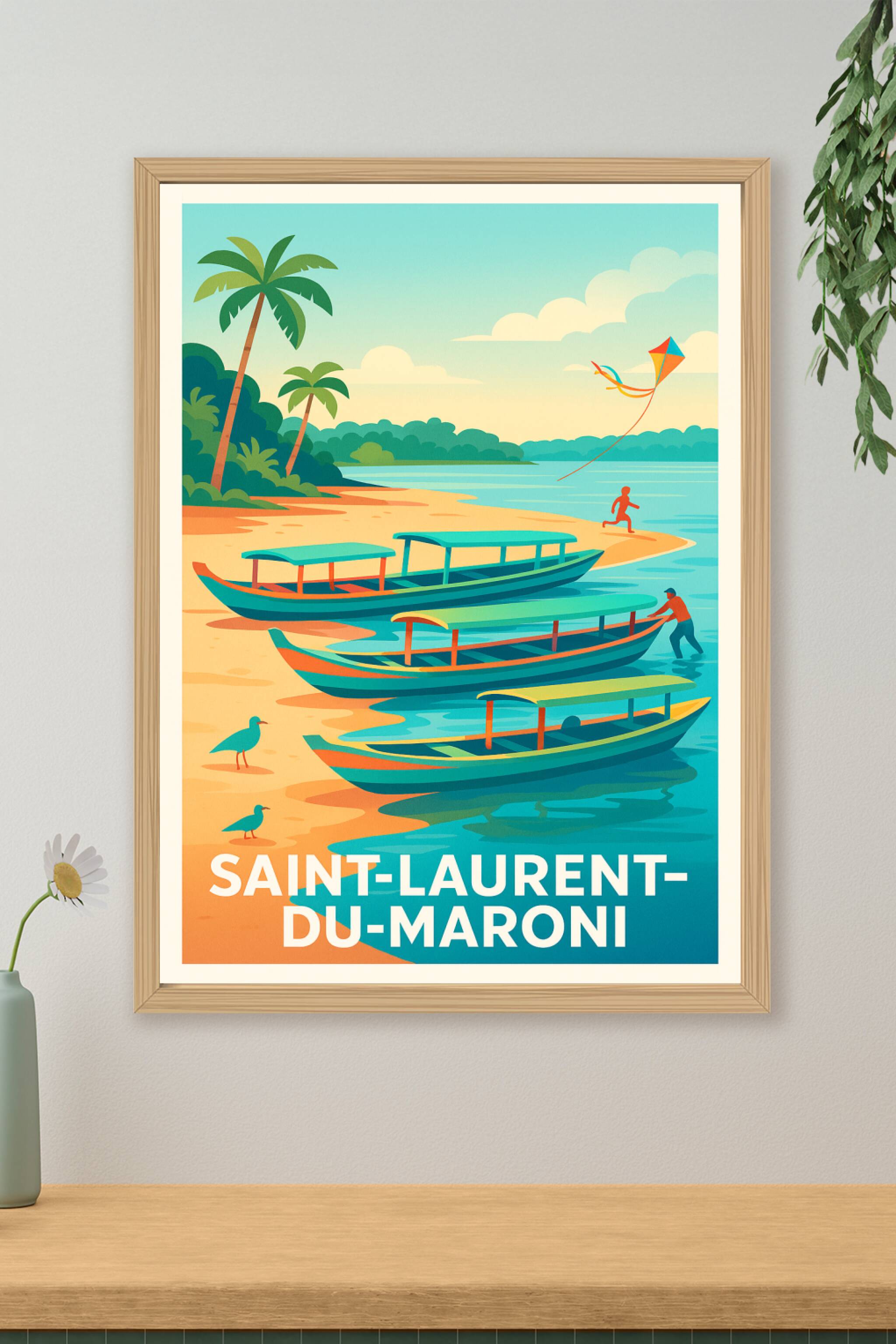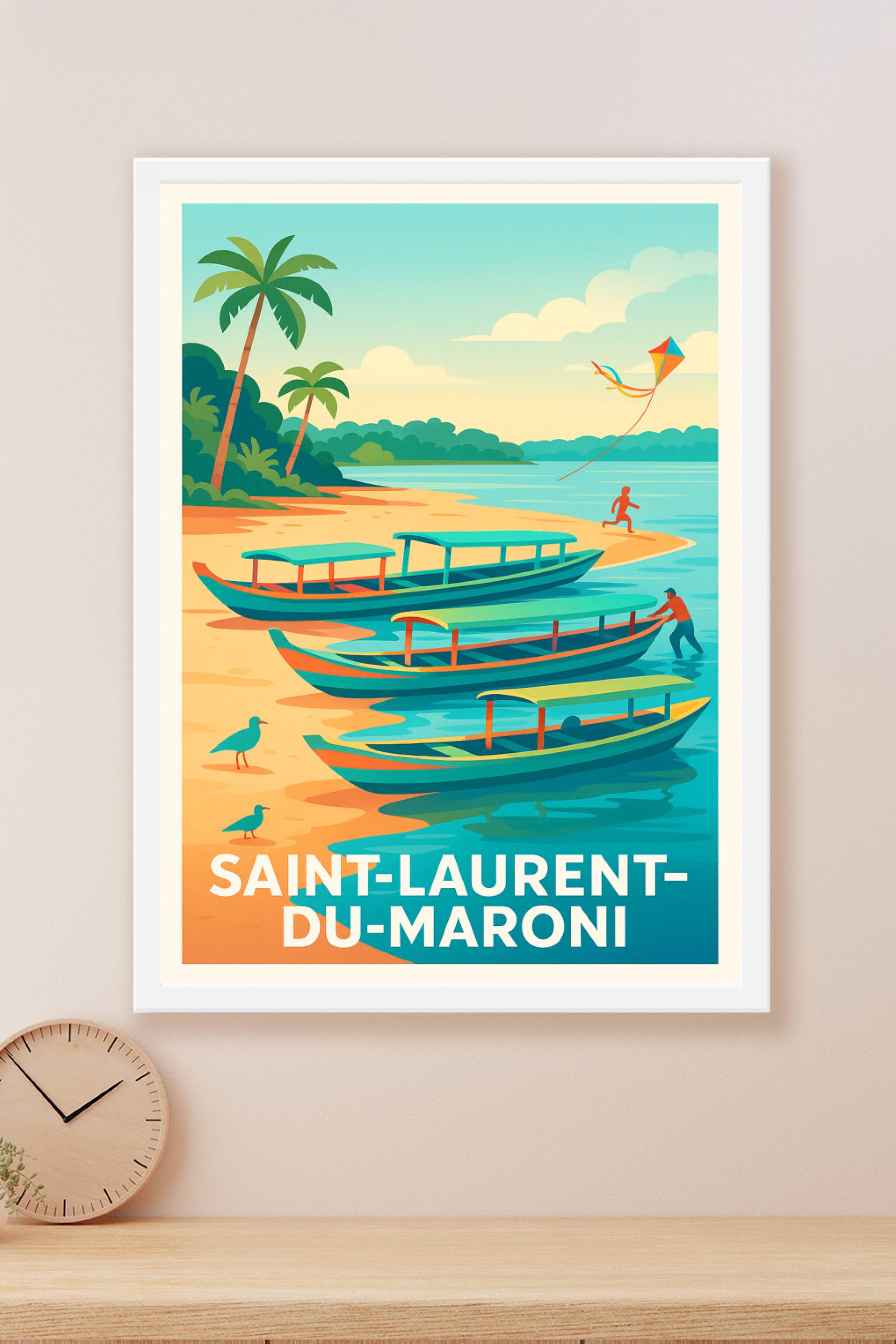 Découvrez l'ambiance paisible et ensoleillée de Saint-Laurent-du-Maroni avec cette affiche illustrée mettant en scène ses pirogues traditionnelles ...