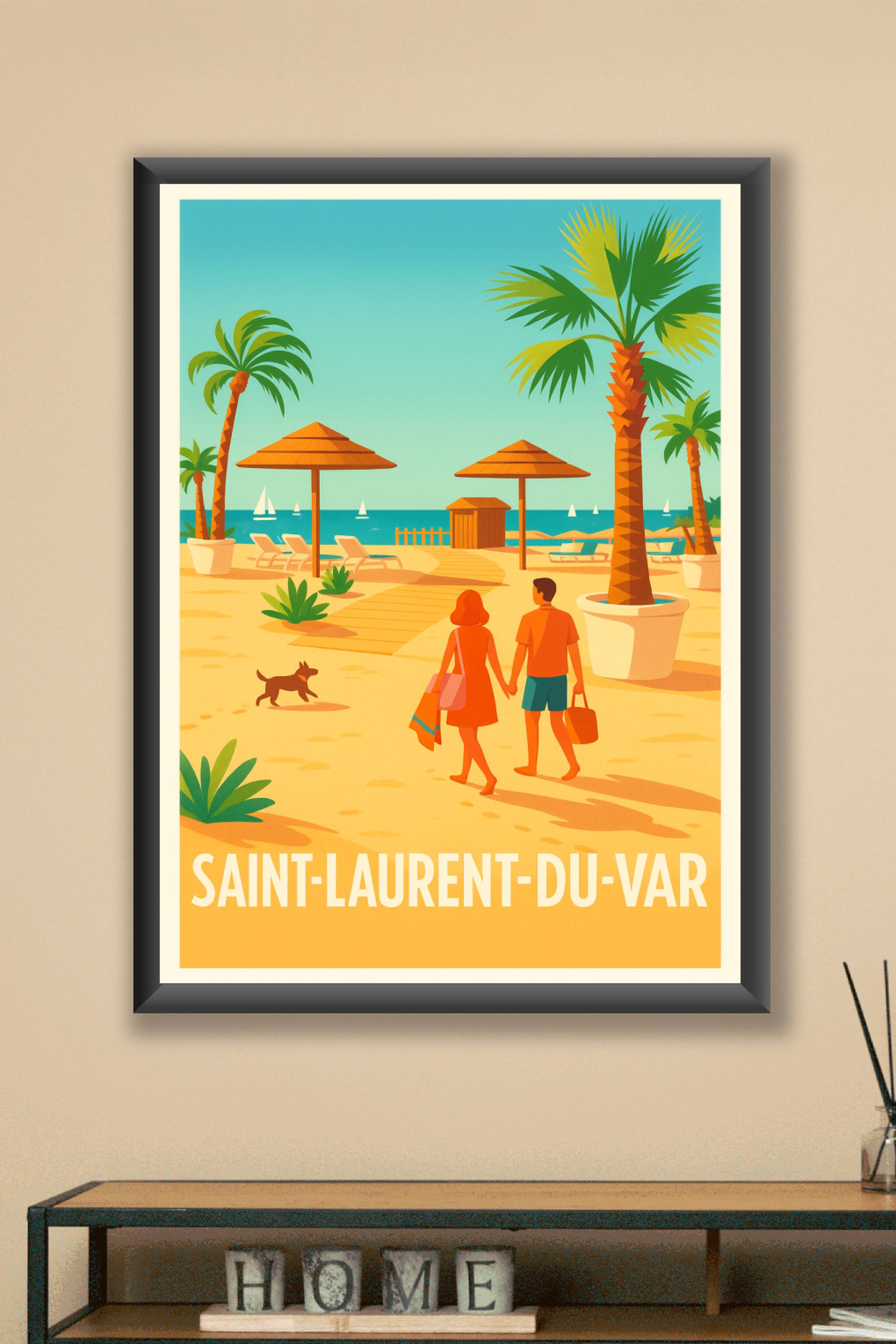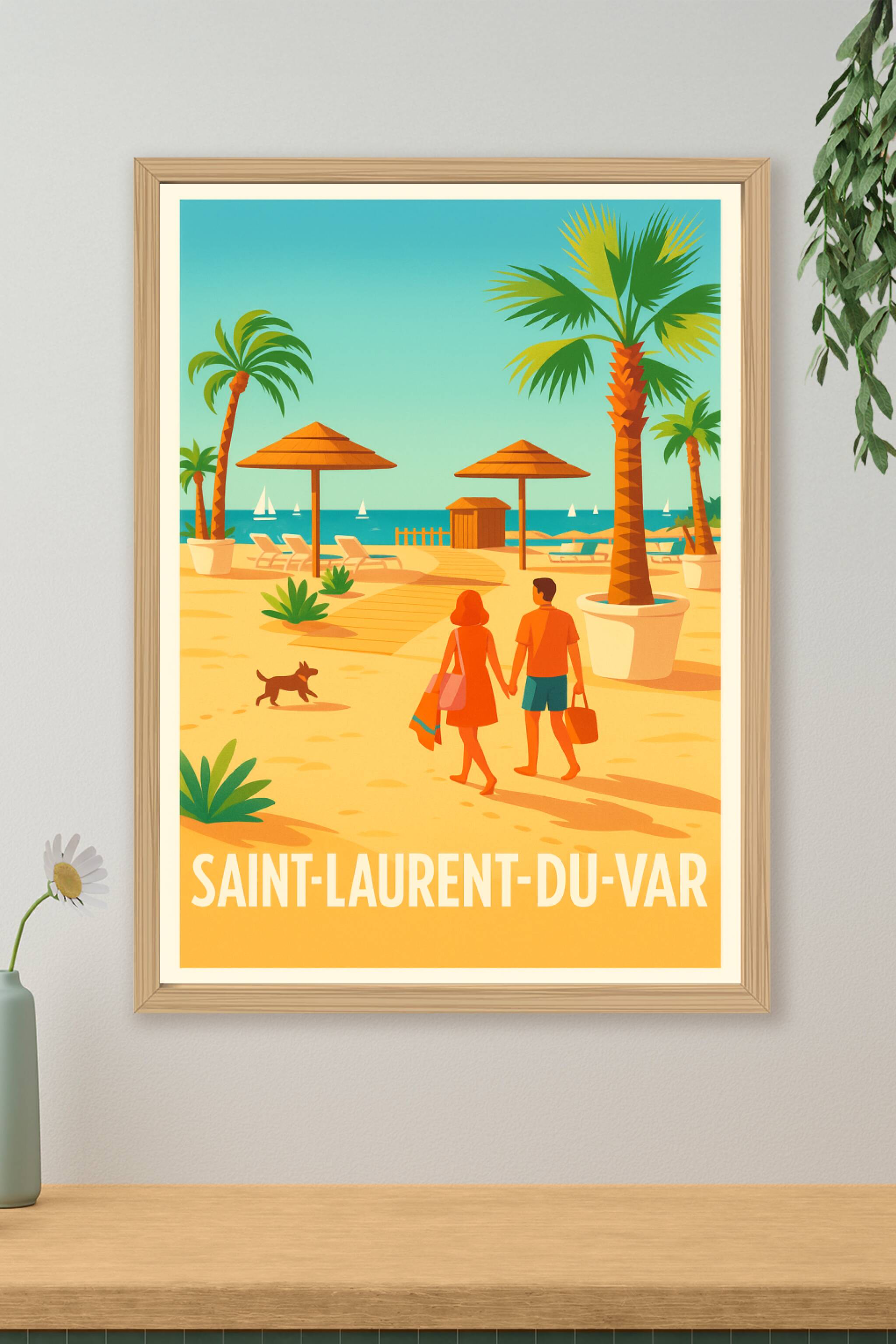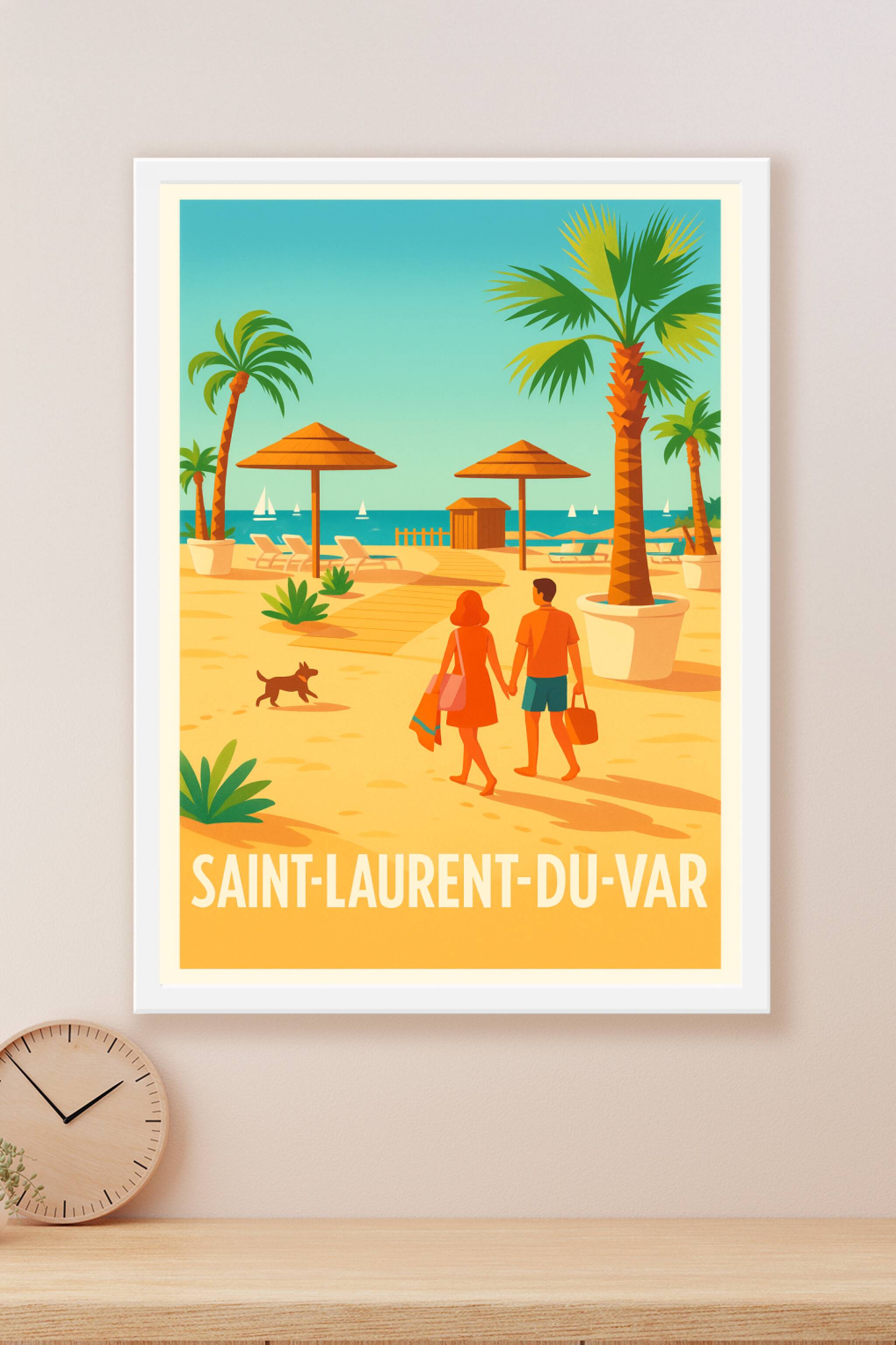Découvrez l'ambiance douce et estivale de Saint-Laurent-du-Var avec cette affiche illustrée au style rétro qui capture une plage paisible bordée de...