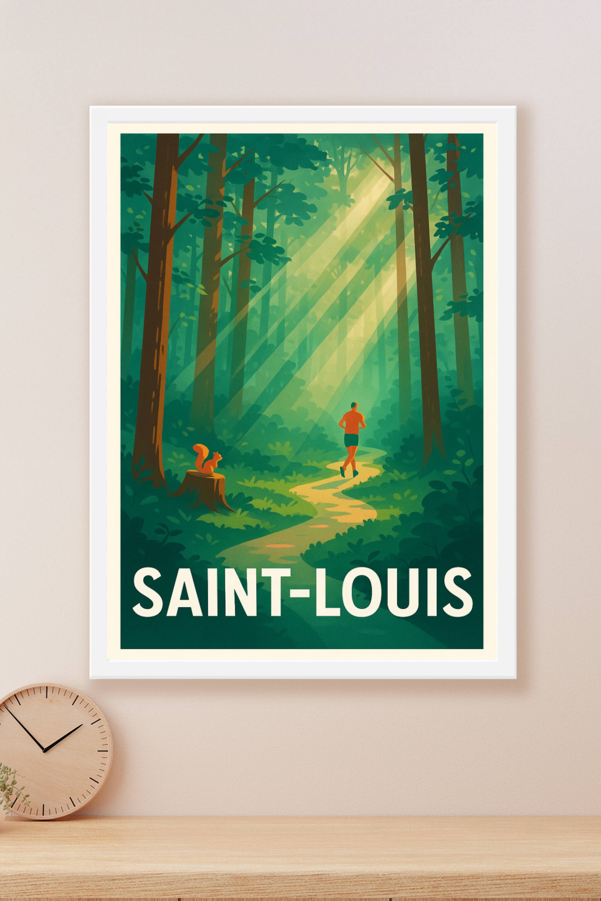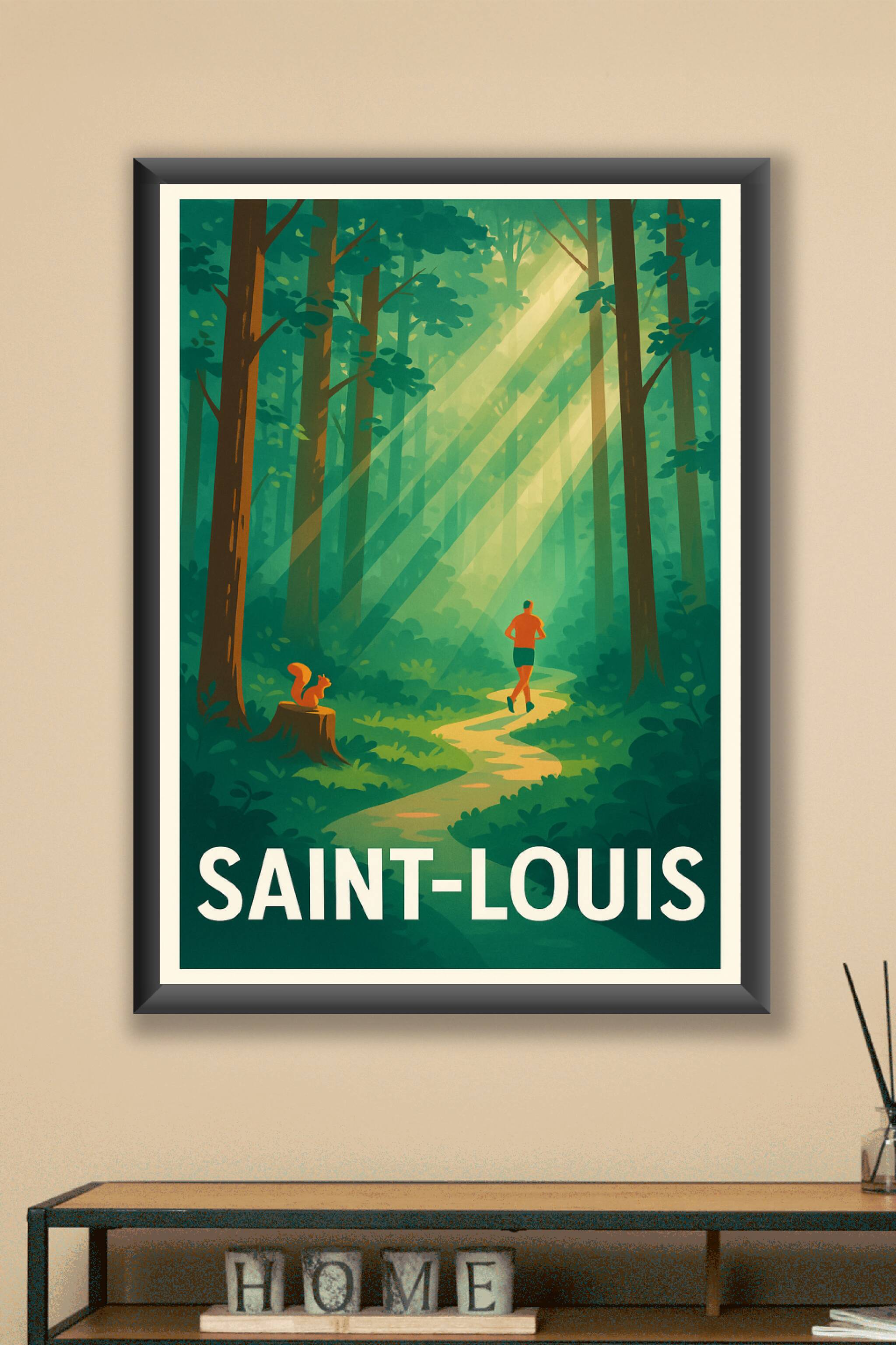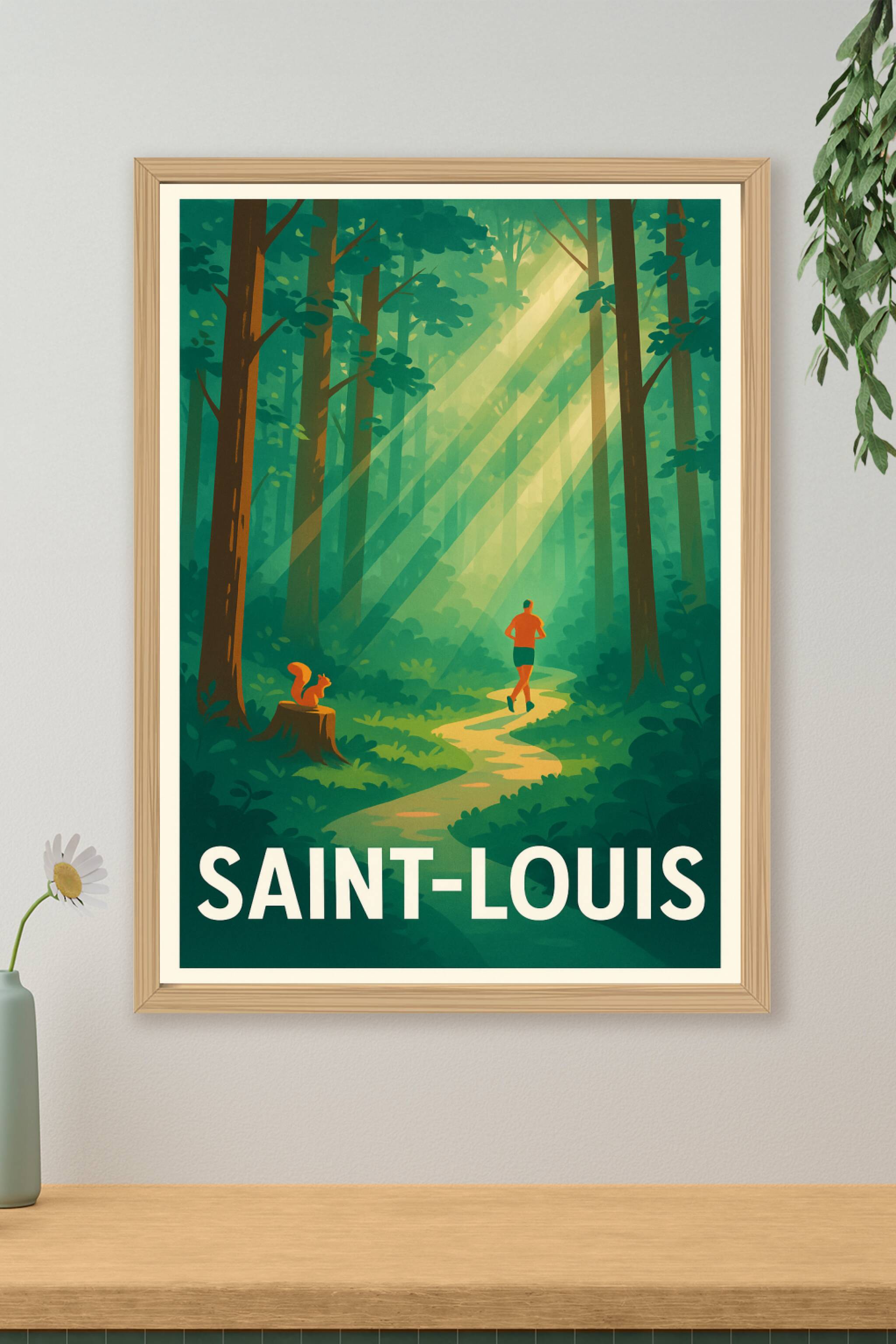 Découvrez la sérénité de la forêt de Saint-Louis avec cette superbe affiche illustrée d'une scène paisible où un coureur profite des rayons du sole...