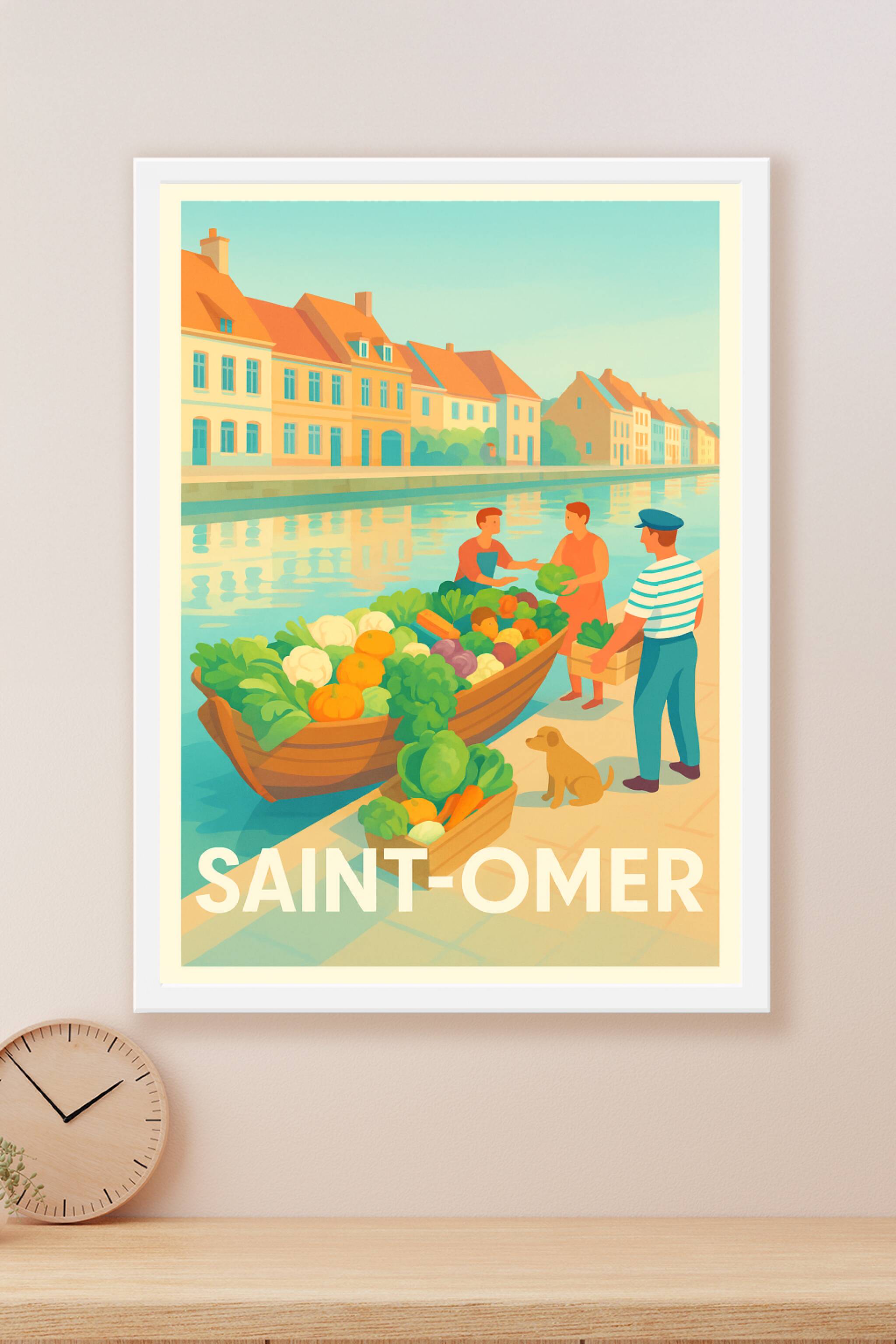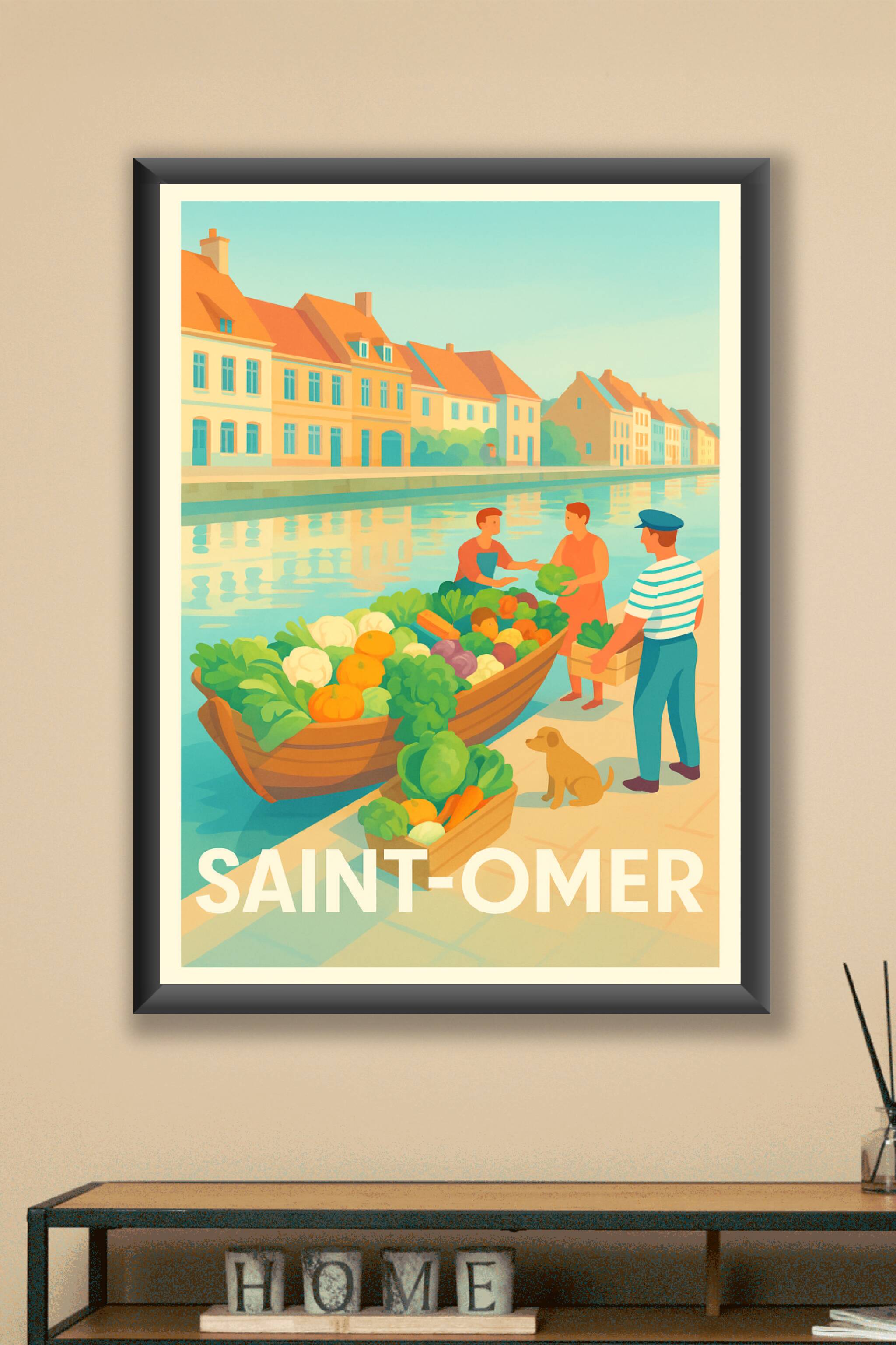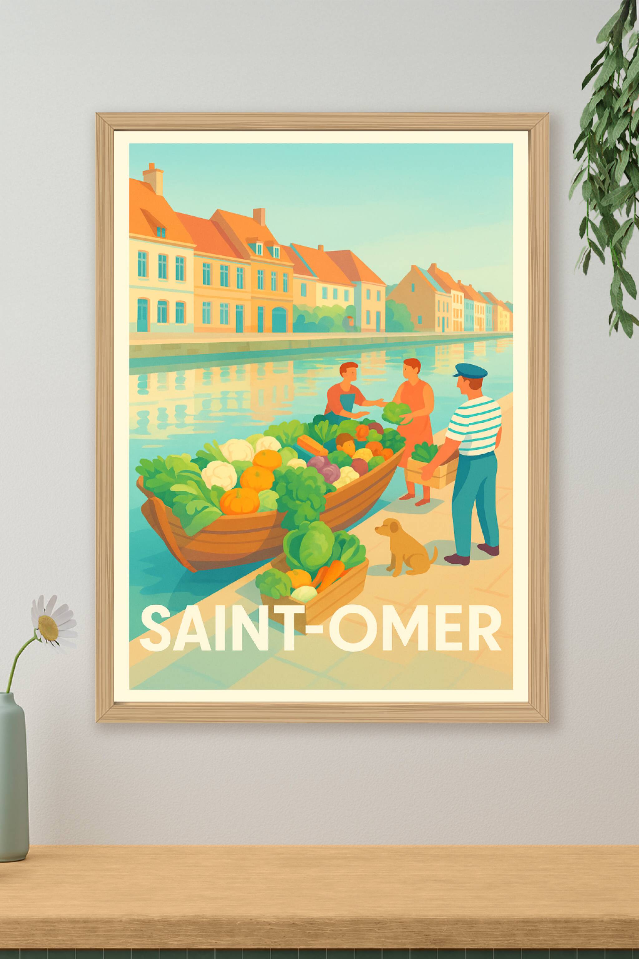 Découvrez l'ambiance paisible et colorée de Saint-Omer avec cette affiche illustrée mettant en scène un marché flottant pittoresque au bord d'un ca...