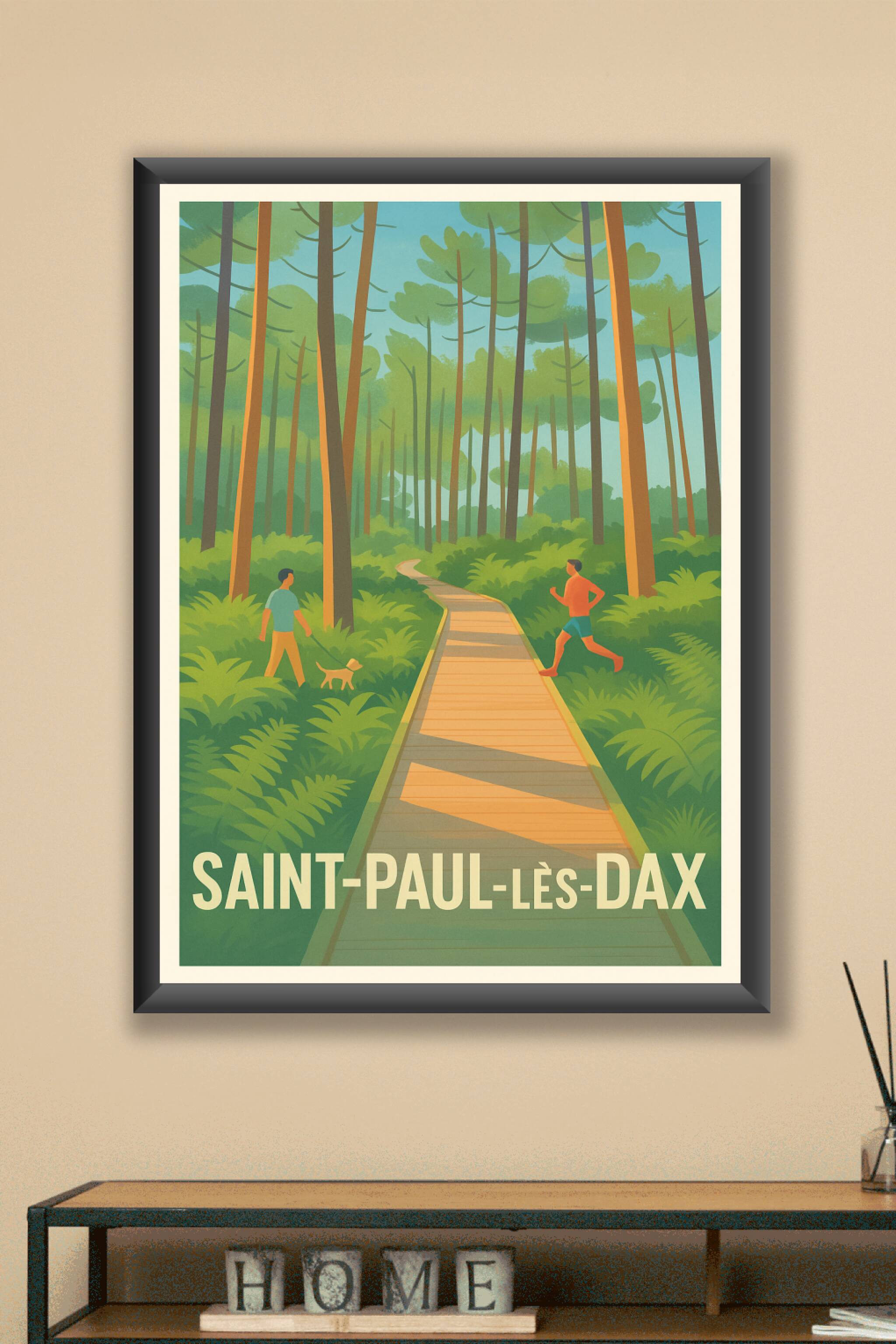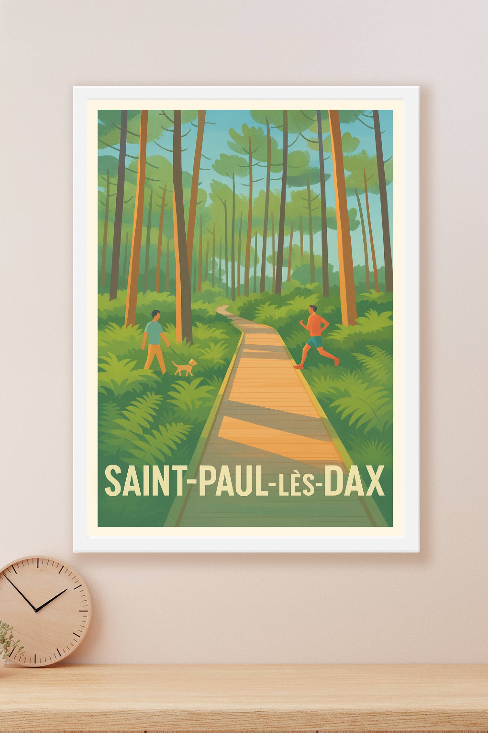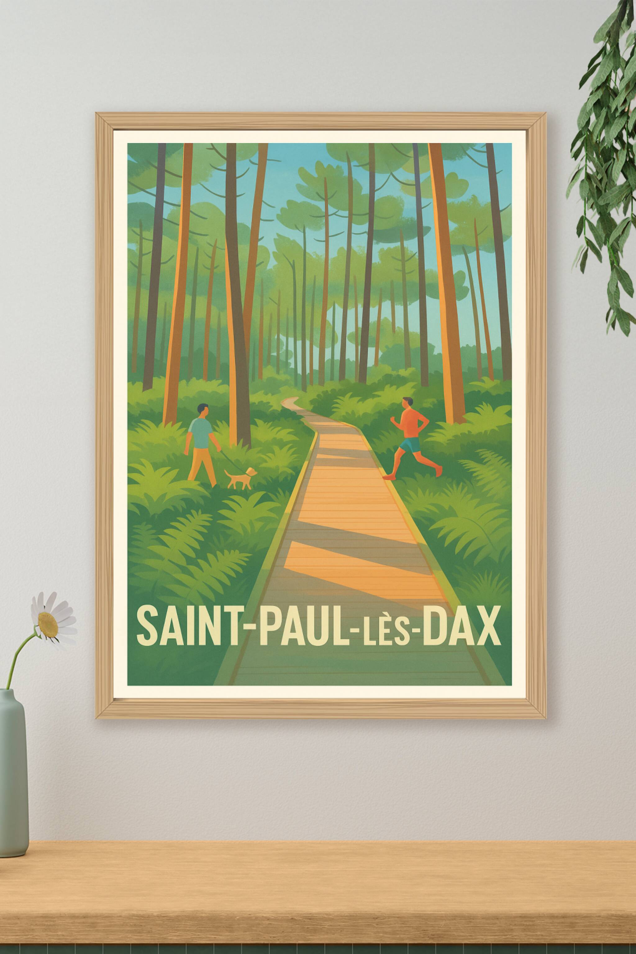 Découvrez l'atmosphère apaisante et verdoyante de Saint-Paul-lès-Dax avec cette affiche illustrée mettant en scène une promenade en forêt, où march...