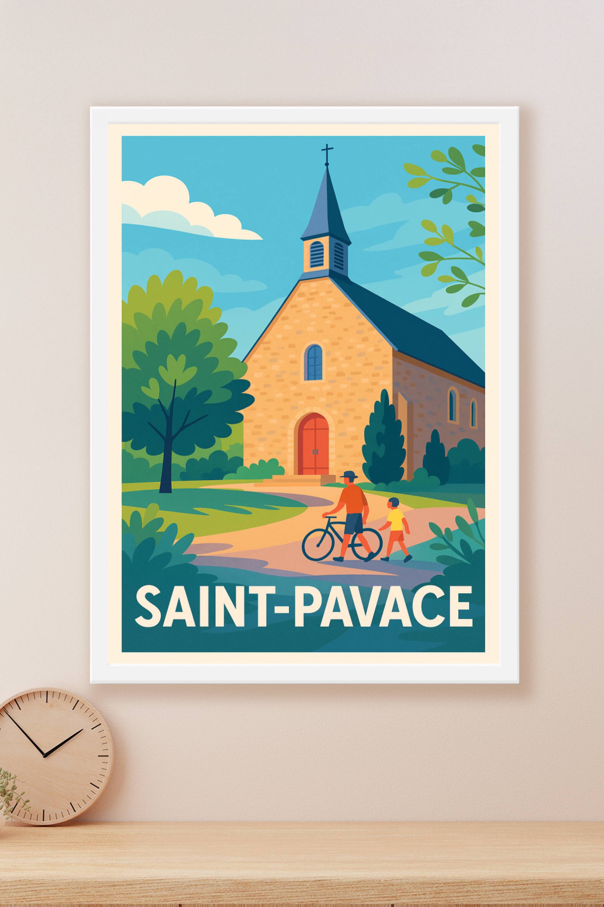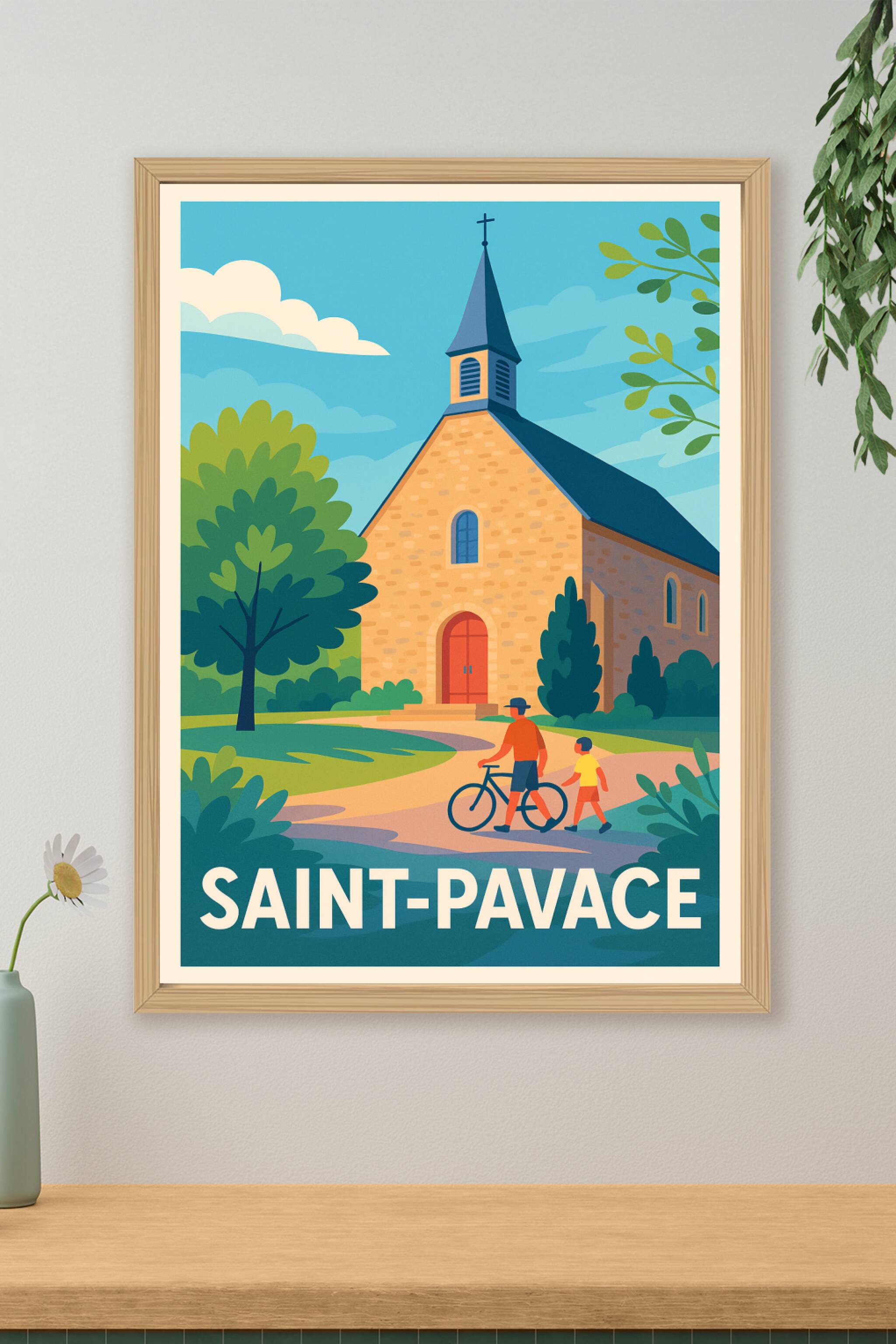 Découvrez la douceur de vivre à Saint-Pavace avec cette affiche illustrée, mettant en scène une charmante église de pierre baignée par la lumière d...