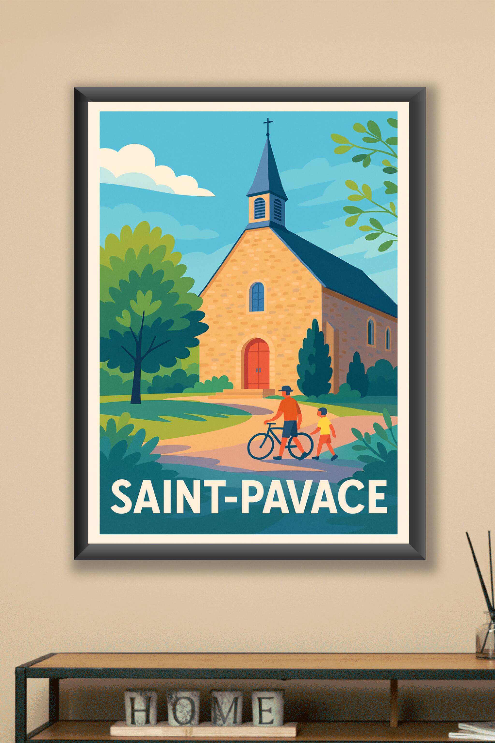 Découvrez la douceur de vivre à Saint-Pavace avec cette affiche illustrée, mettant en scène une charmante église de pierre baignée par la lumière du jour. Ce poster au style vintage capture l’atmosphère paisible et conviviale du village, idéale pour une décoration chaleureuse. Imprimée en tirage "Fine Art" sur papier 305g coton, cette affiche garantit une qualité d'impression exceptionnelle, avec des couleurs vives et un rendu soigné. Disponible en formats A1 à A4, avec ou sans cadre, cette pièce unique s’adapte à tous les espaces, que ce soit pour embellir votre intérieur ou offrir un cadeau raffiné aux amateurs de la région.