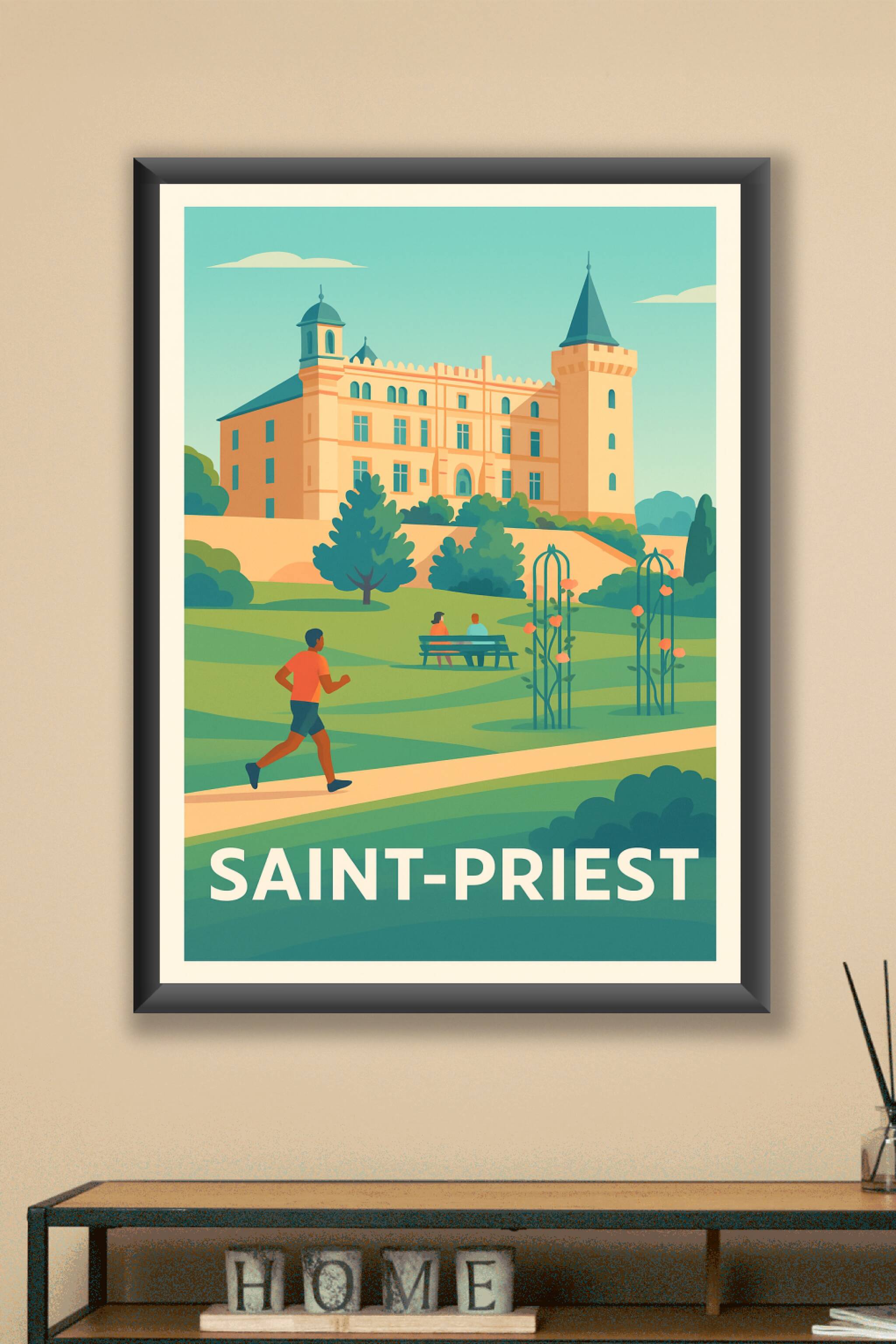 Découvrez la sérénité et le charme architectural de Saint-Priest avec cette affiche illustrée mettant en scène son château emblématique au cœur d’u...