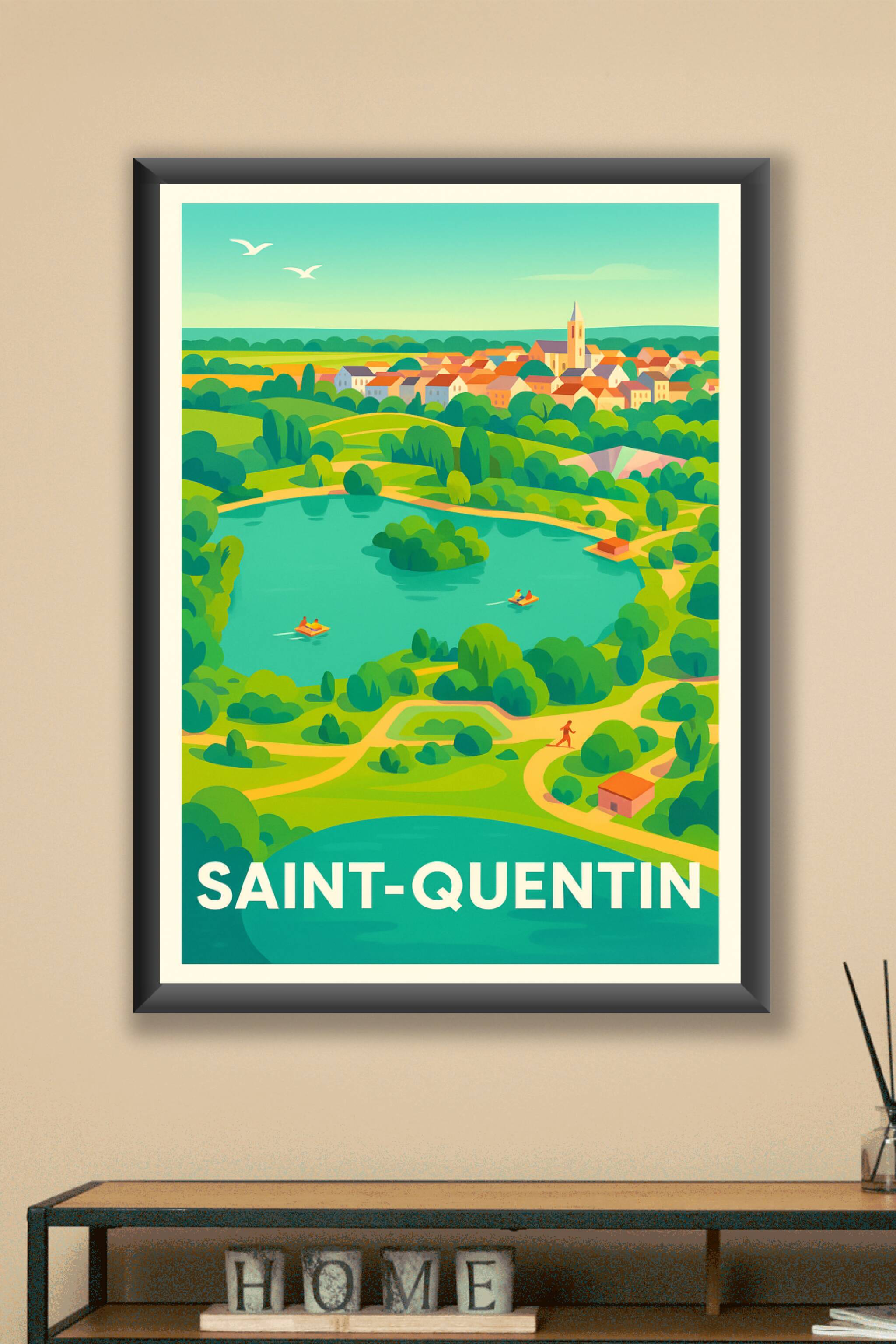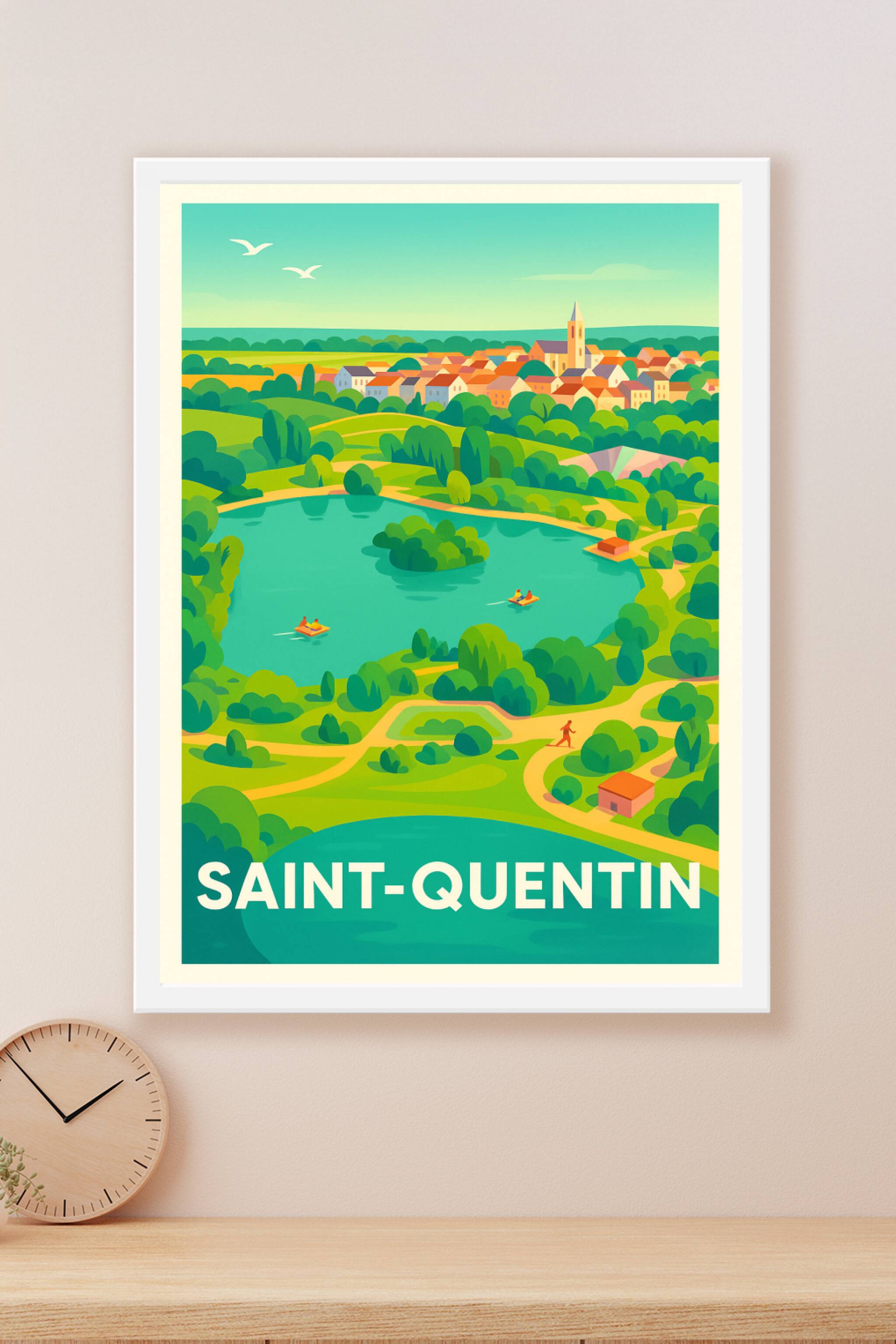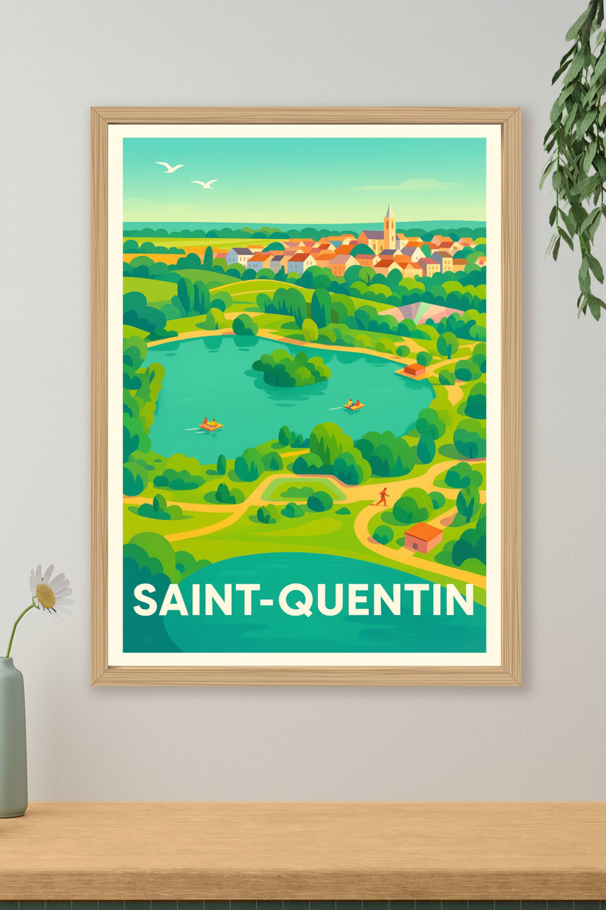 Découvrez le charme bucolique de Saint-Quentin avec cette affiche illustrée aux couleurs douces et apaisantes qui célèbre la nature et les espaces ...