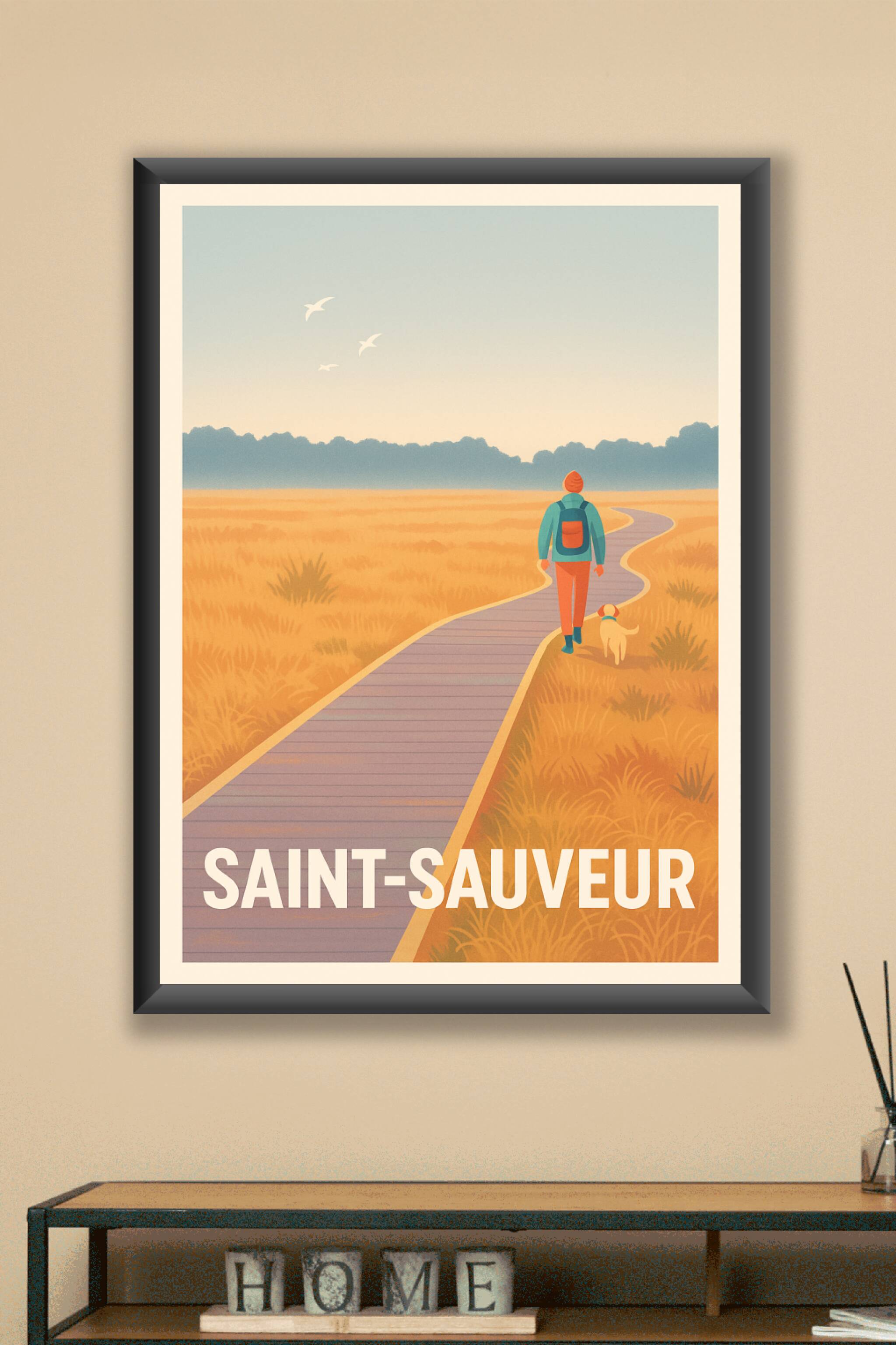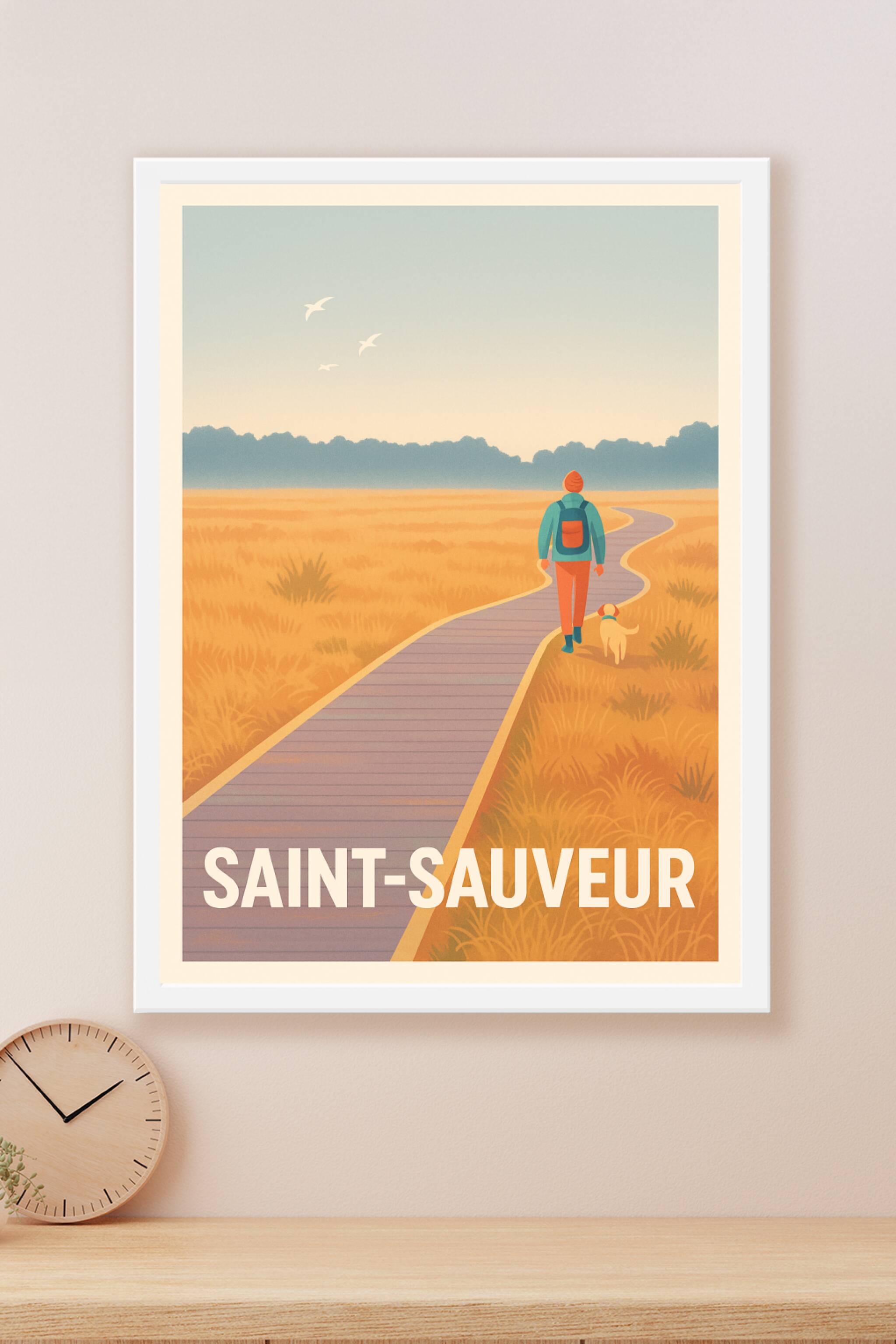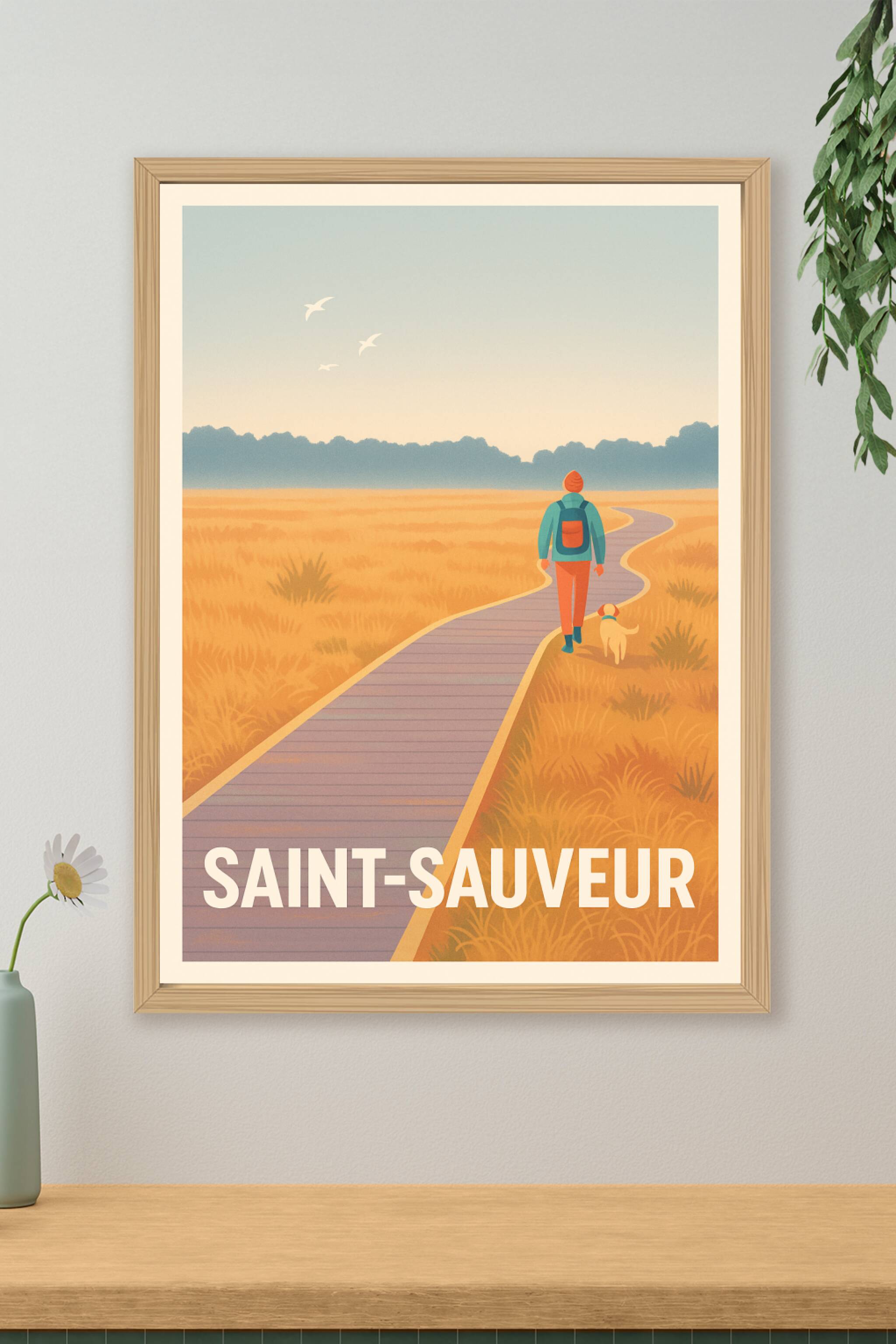 Capturez la douceur d'une balade apaisante à Saint-Sauveur avec cette affiche illustrée aux teintes chaudes et harmonieuses. Le poster met en scène...