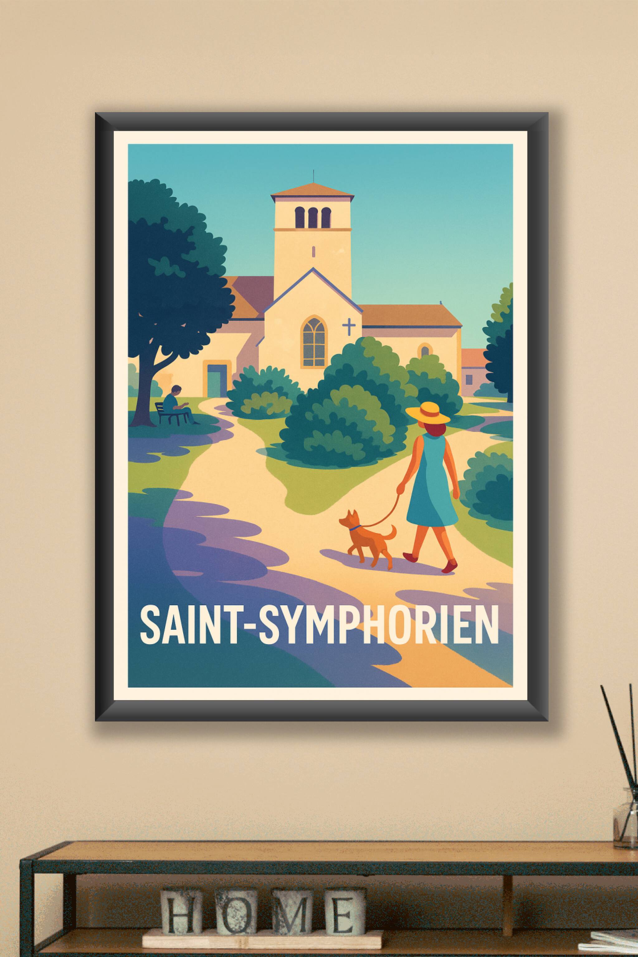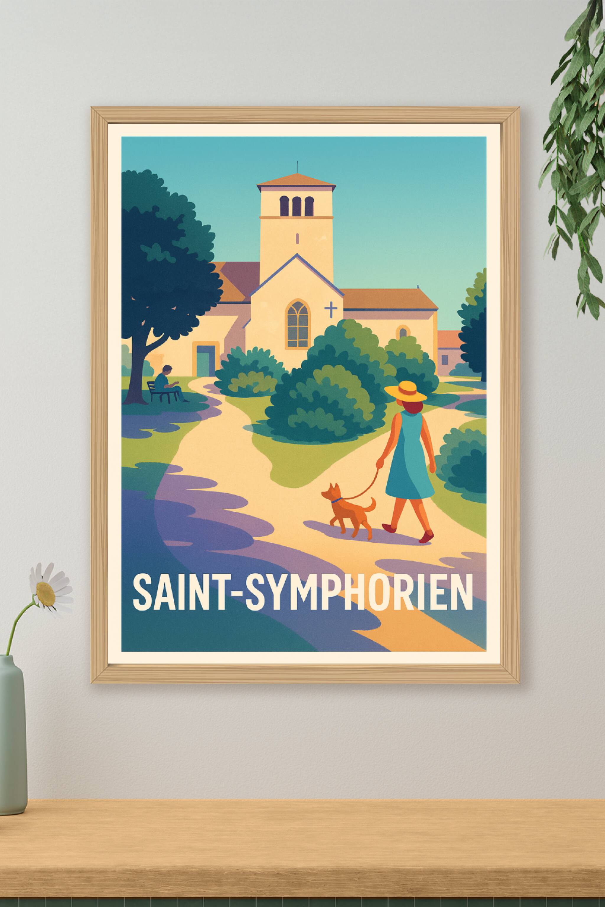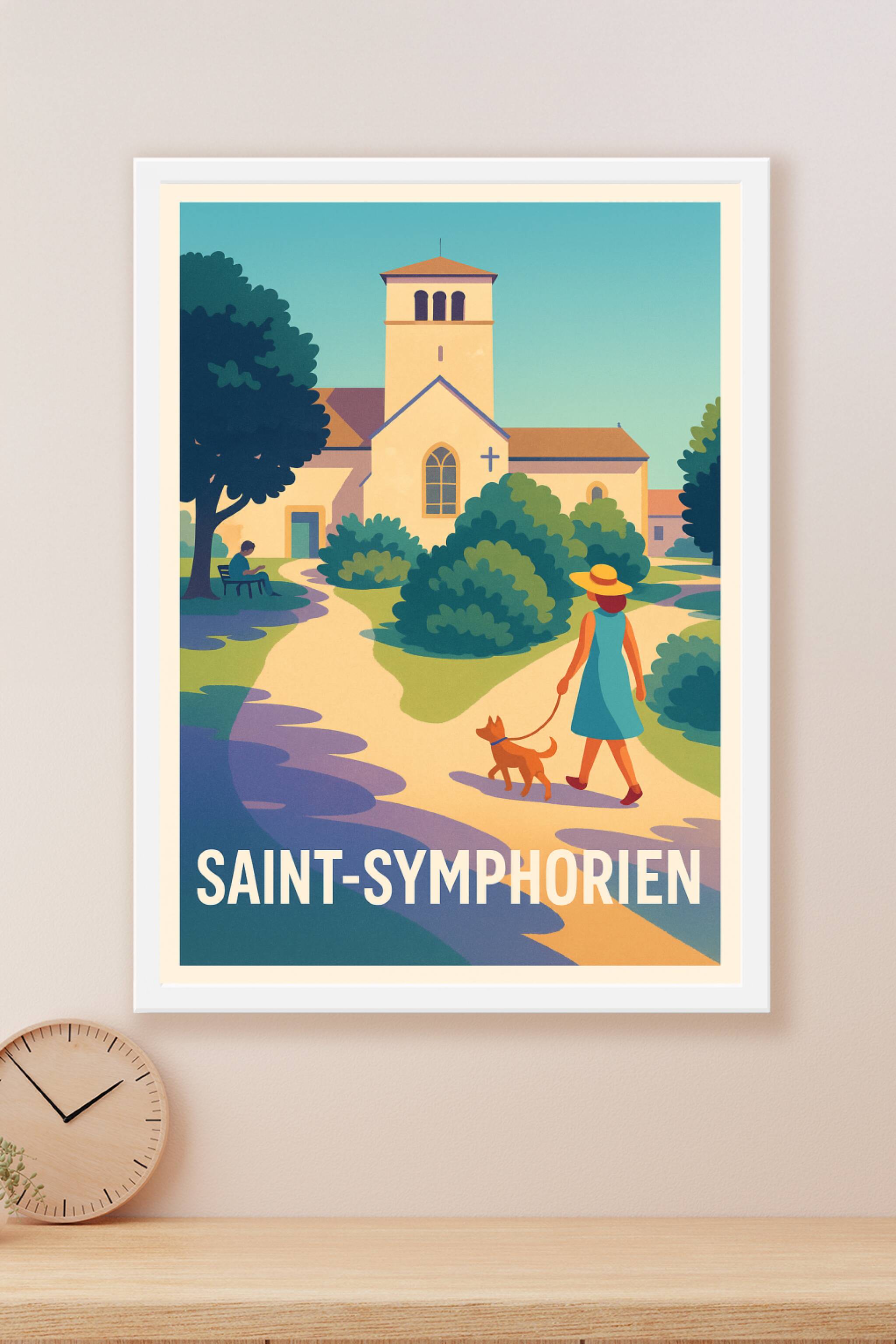 Découvrez l'ambiance sereine et bucolique de Saint-Symphorien avec cette affiche illustrée dans un style doux et coloré. Ce poster met en scène une...