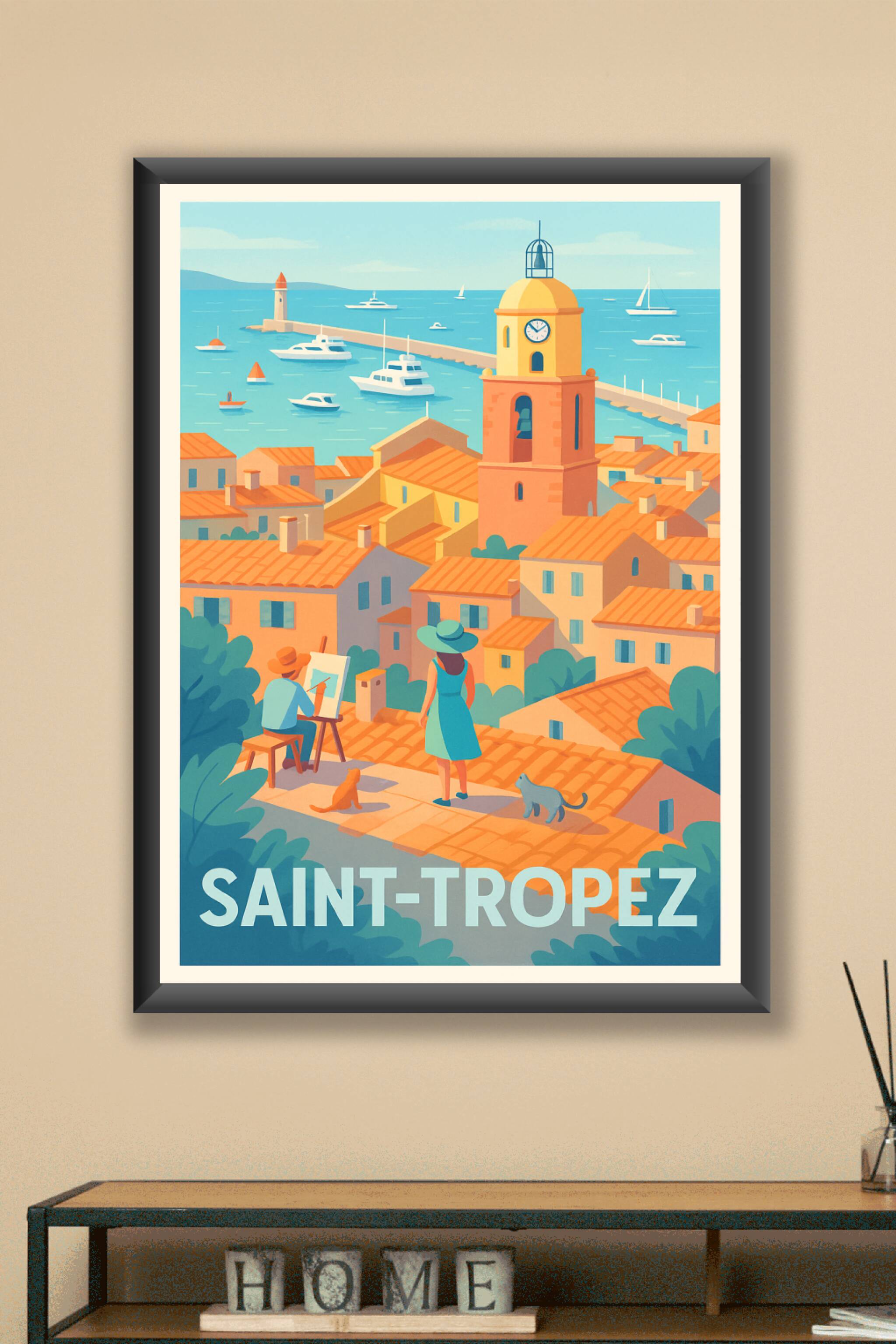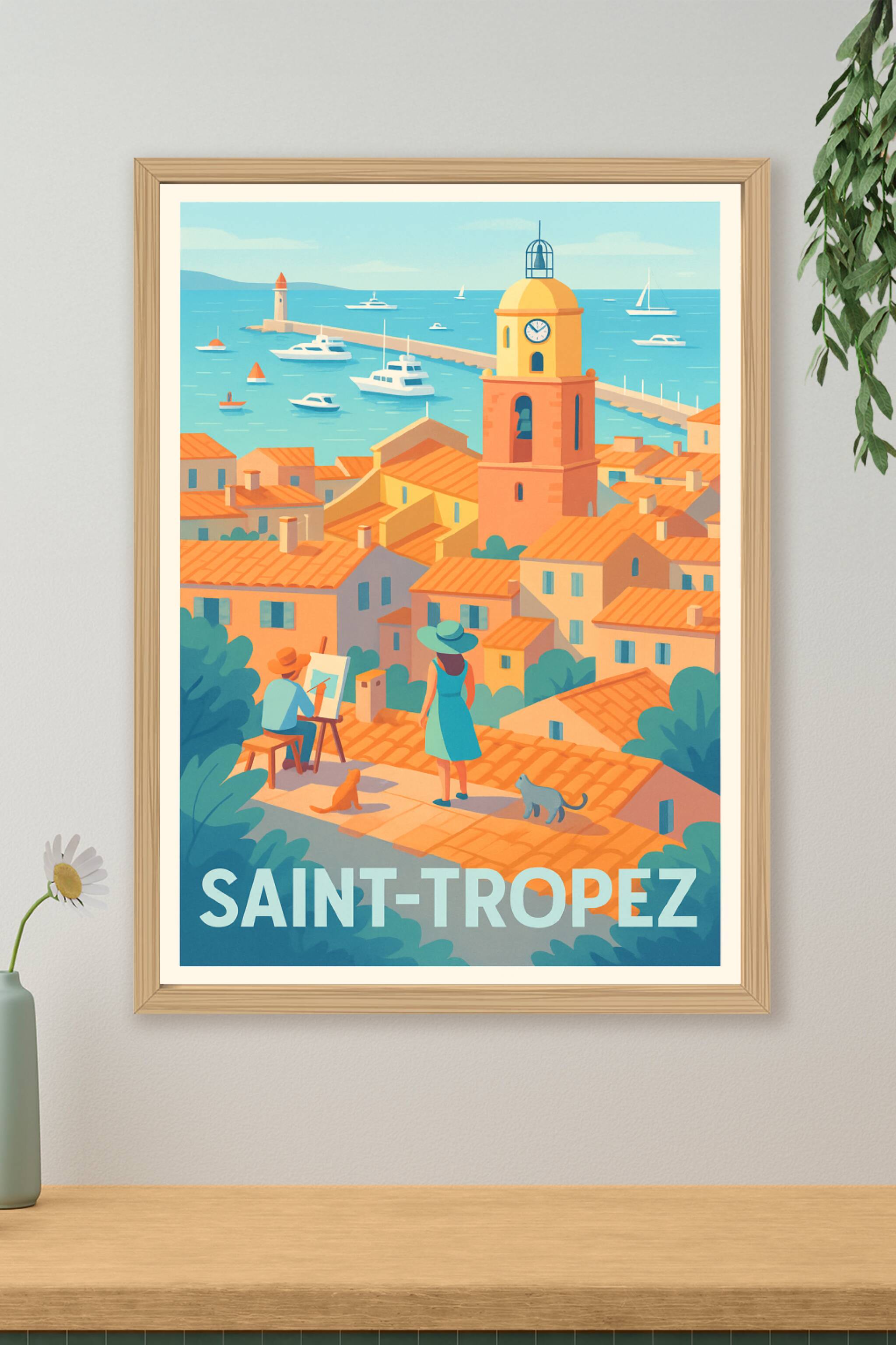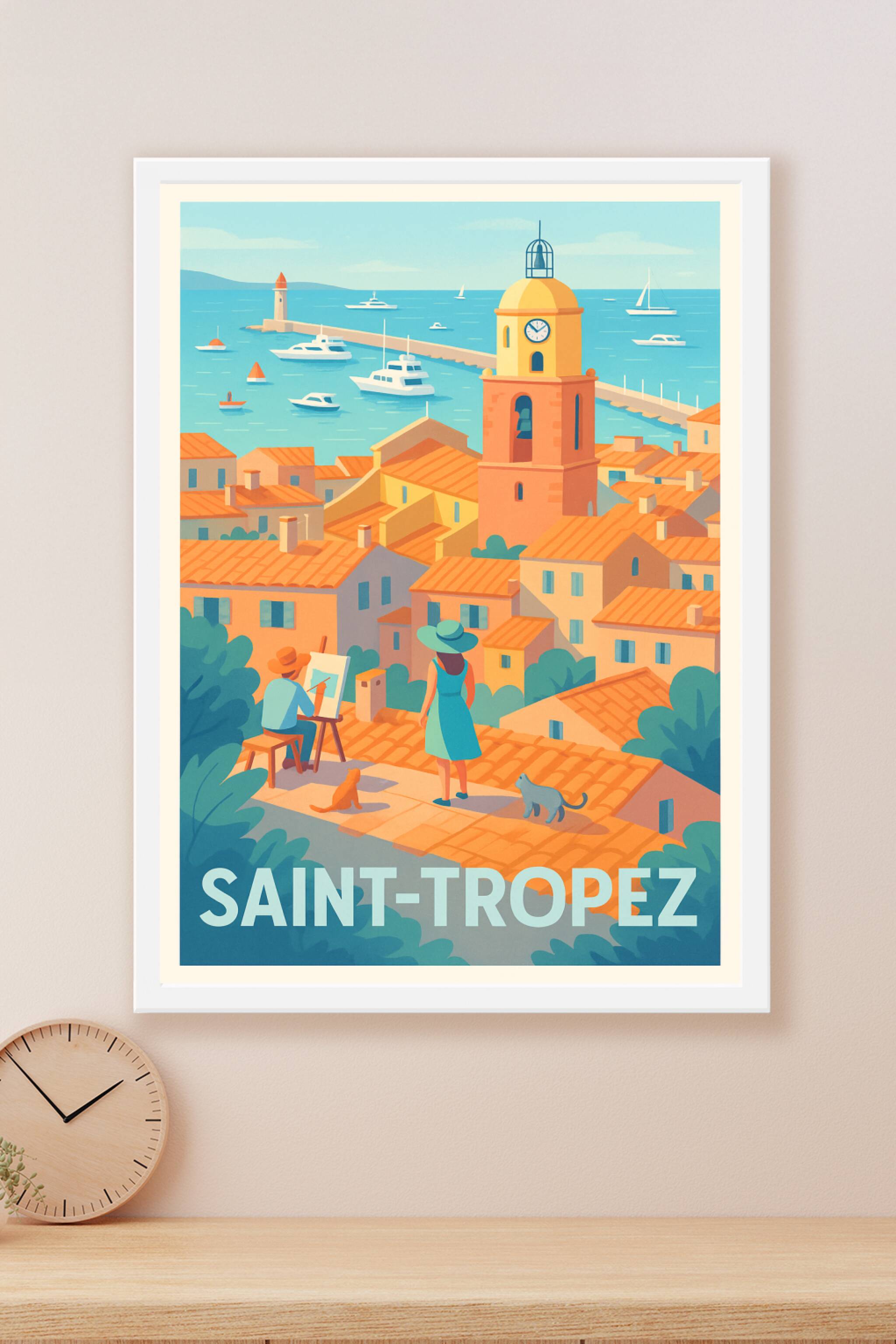 Plongez dans l'atmosphère méditerranéenne avec ce poster au style néo-rétro de Saint-Tropez. L'affiche capture l'essence du célèbre port : toits ocres, mer azur et clocher emblématique, où un artiste et une flâneuse partagent un moment face à la mer.