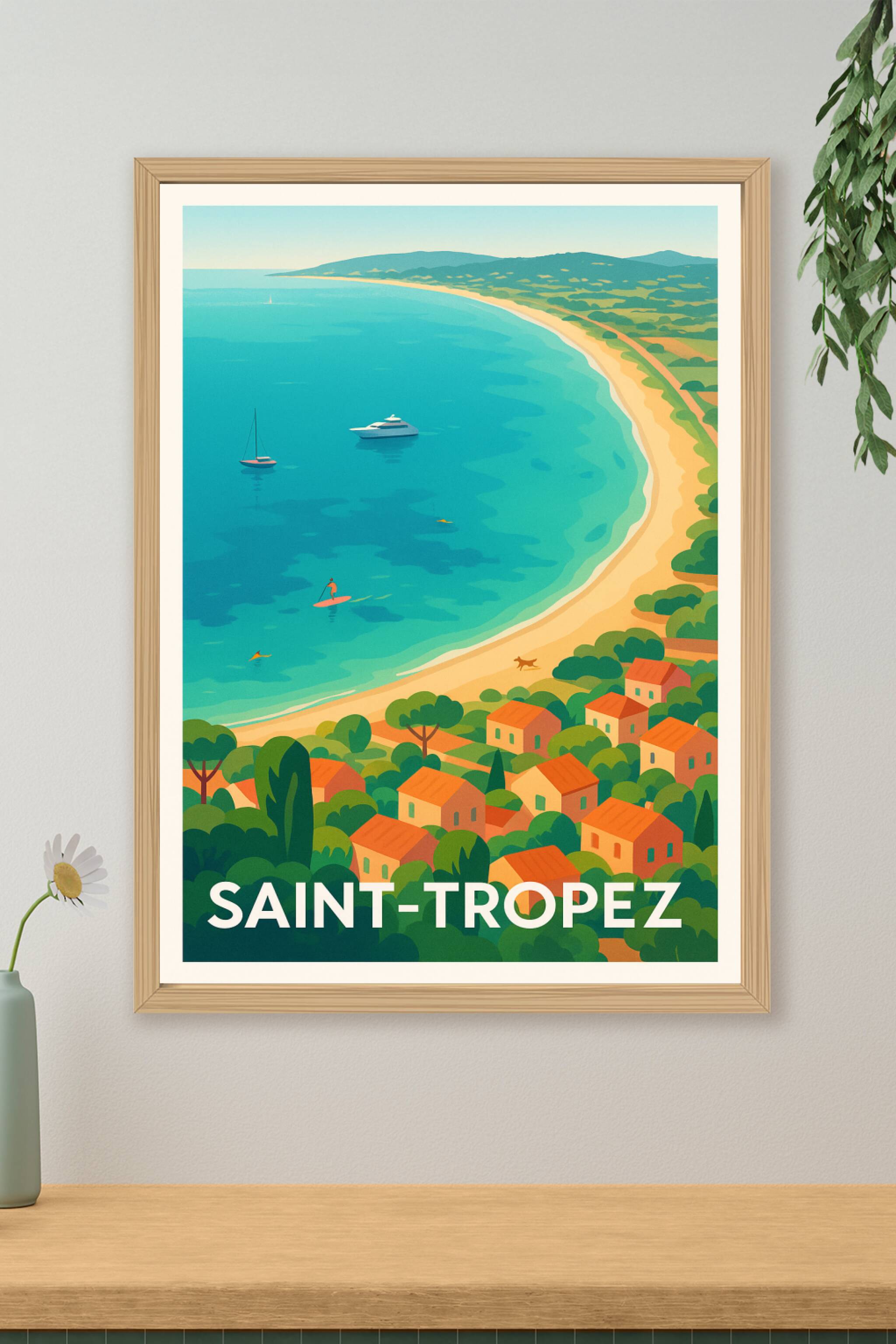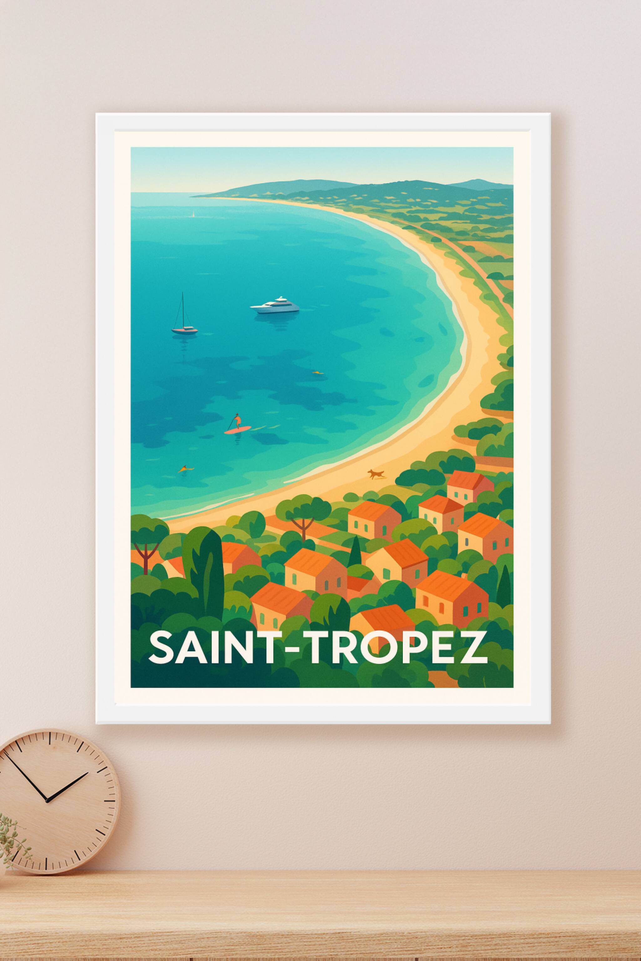 Apportez une touche de glamour à votre intérieur avec ce poster néo-rétro de Saint-Tropez. Capturant la beauté de la Côte d'Azur, cette affiche illustre une mer turquoise, des yachts élégants et des maisons méditerranéennes aux toits orangés.