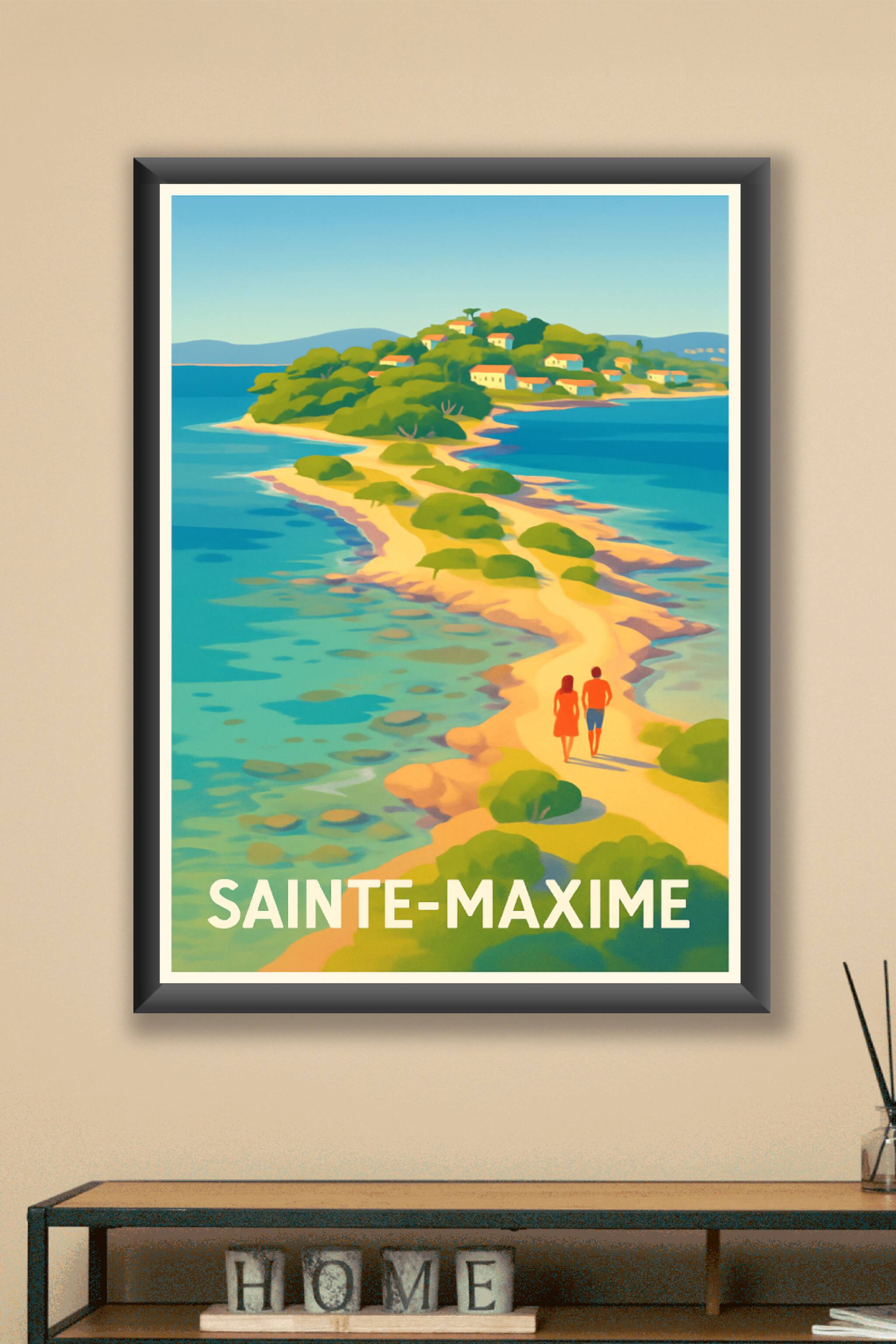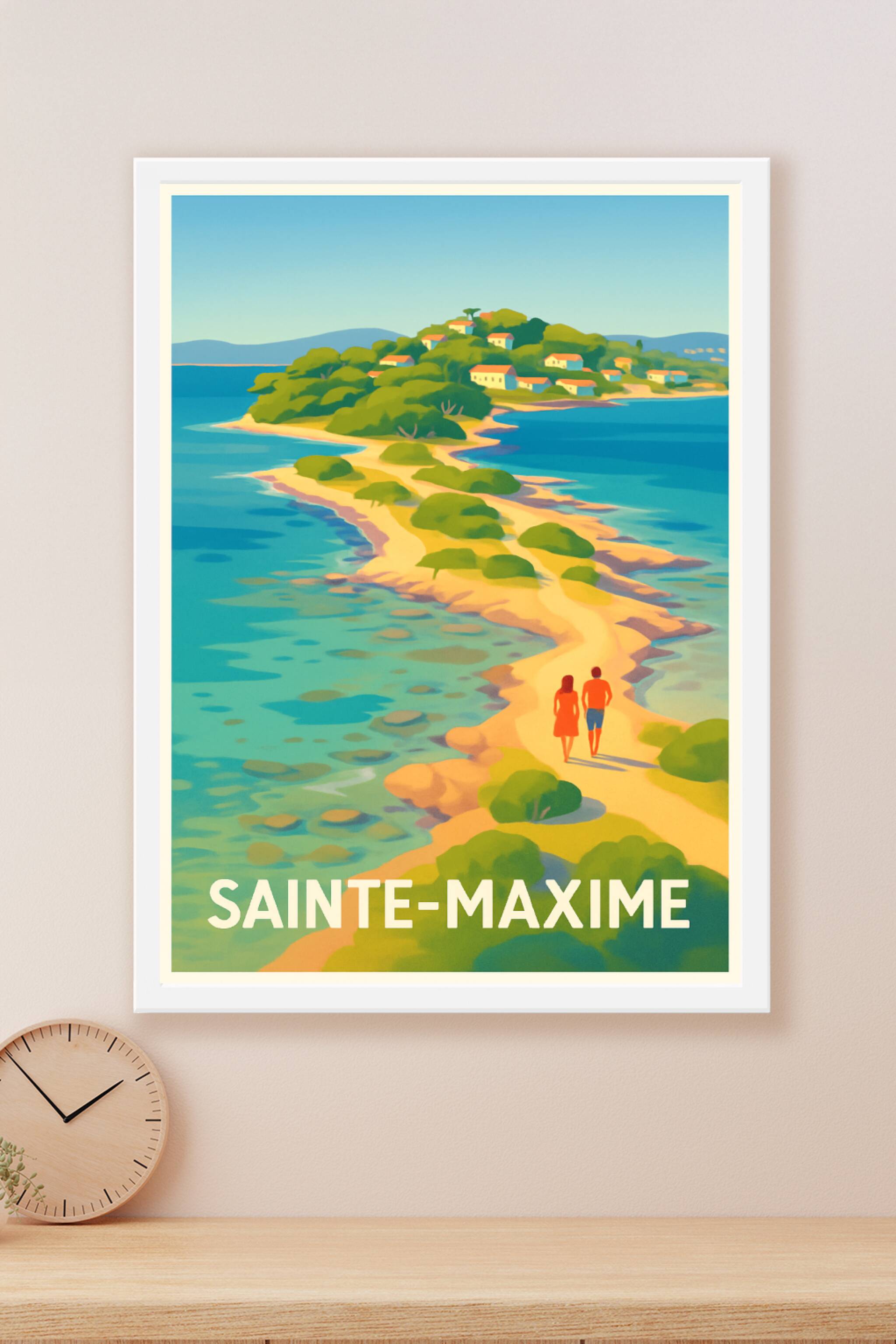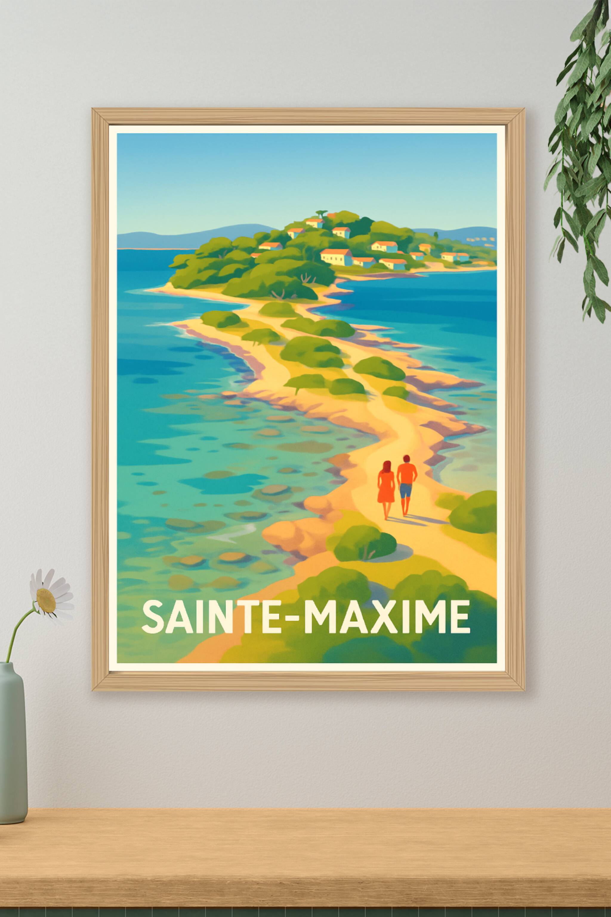 Découvrez la beauté lumineuse de Sainte-Maxime à travers ce poster vibrant qui capture une promenade paisible le long d'une presqu'île baignée de s...
