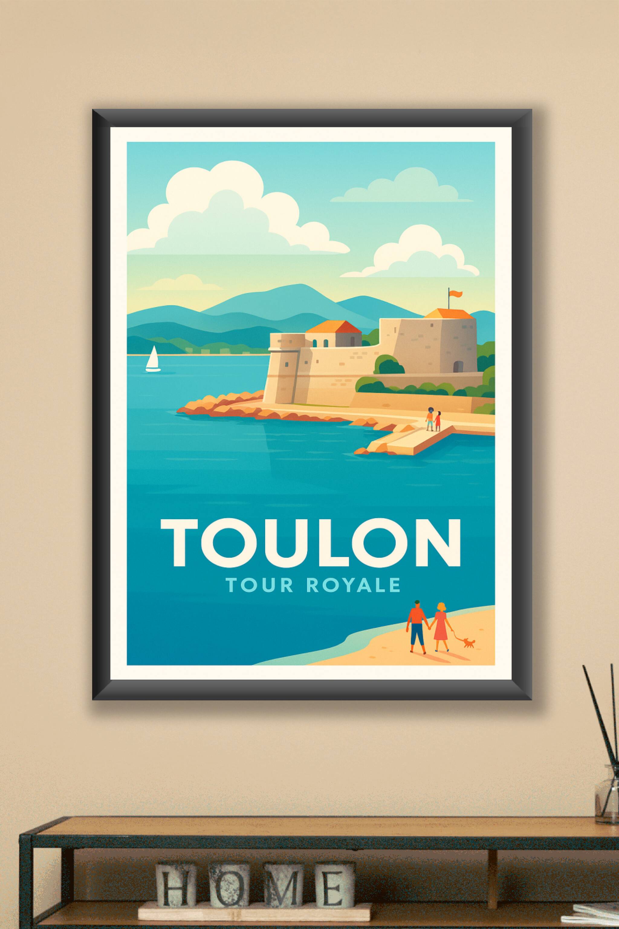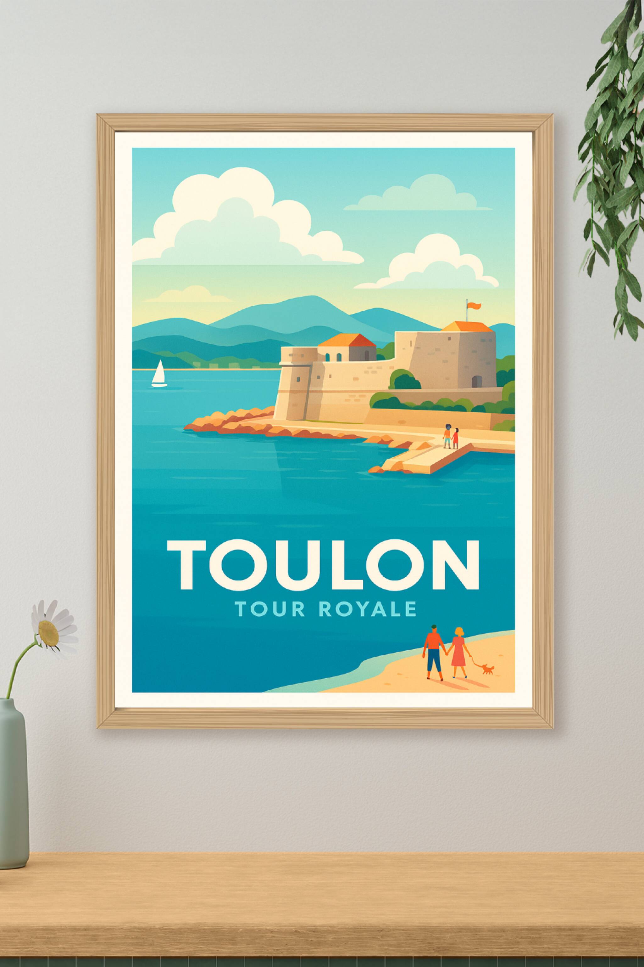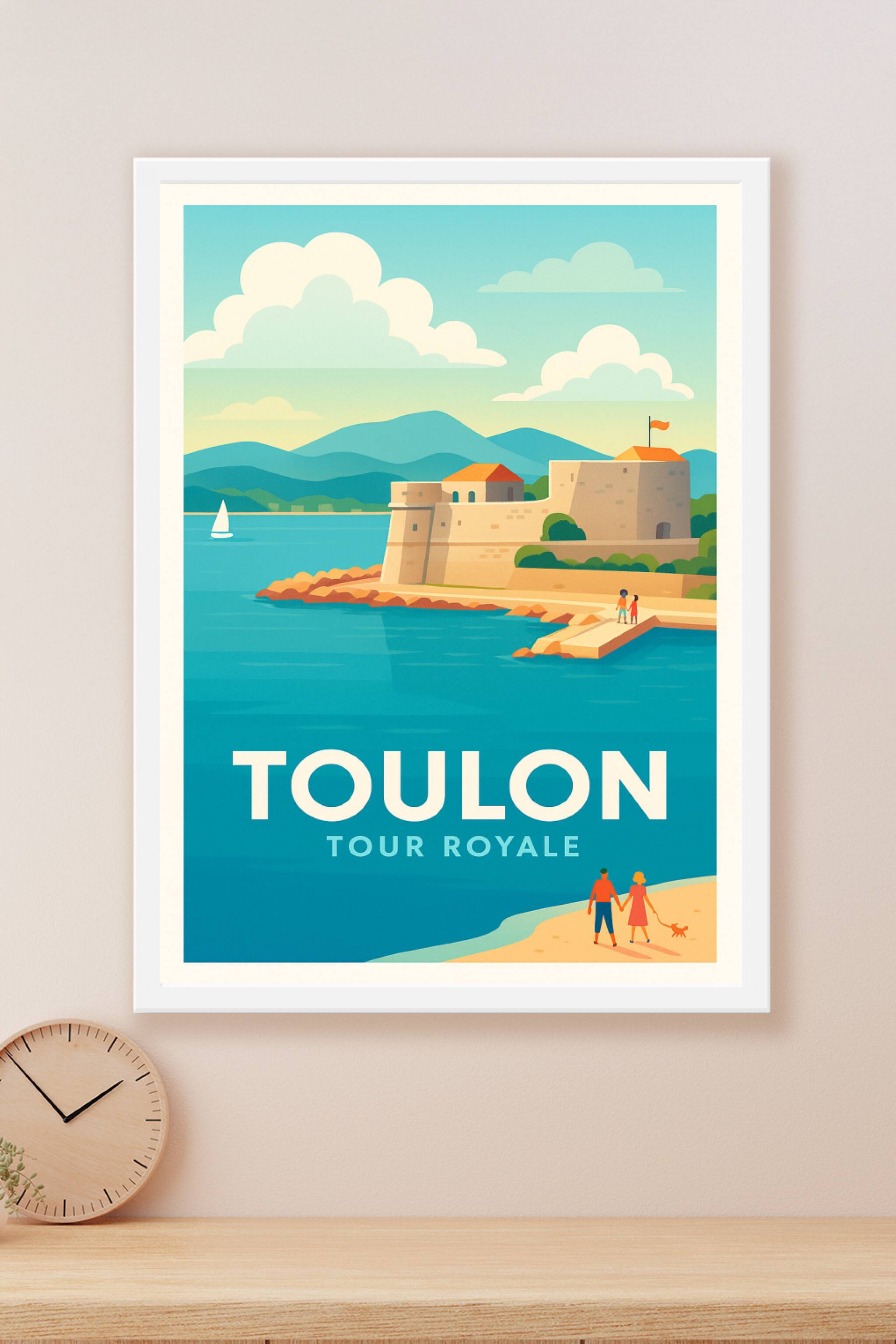 Plongez dans le charme méditerranéen de Toulon avec ce poster au style vintage. La célèbre Tour Royale se dresse fièrement face à une mer turquoise...