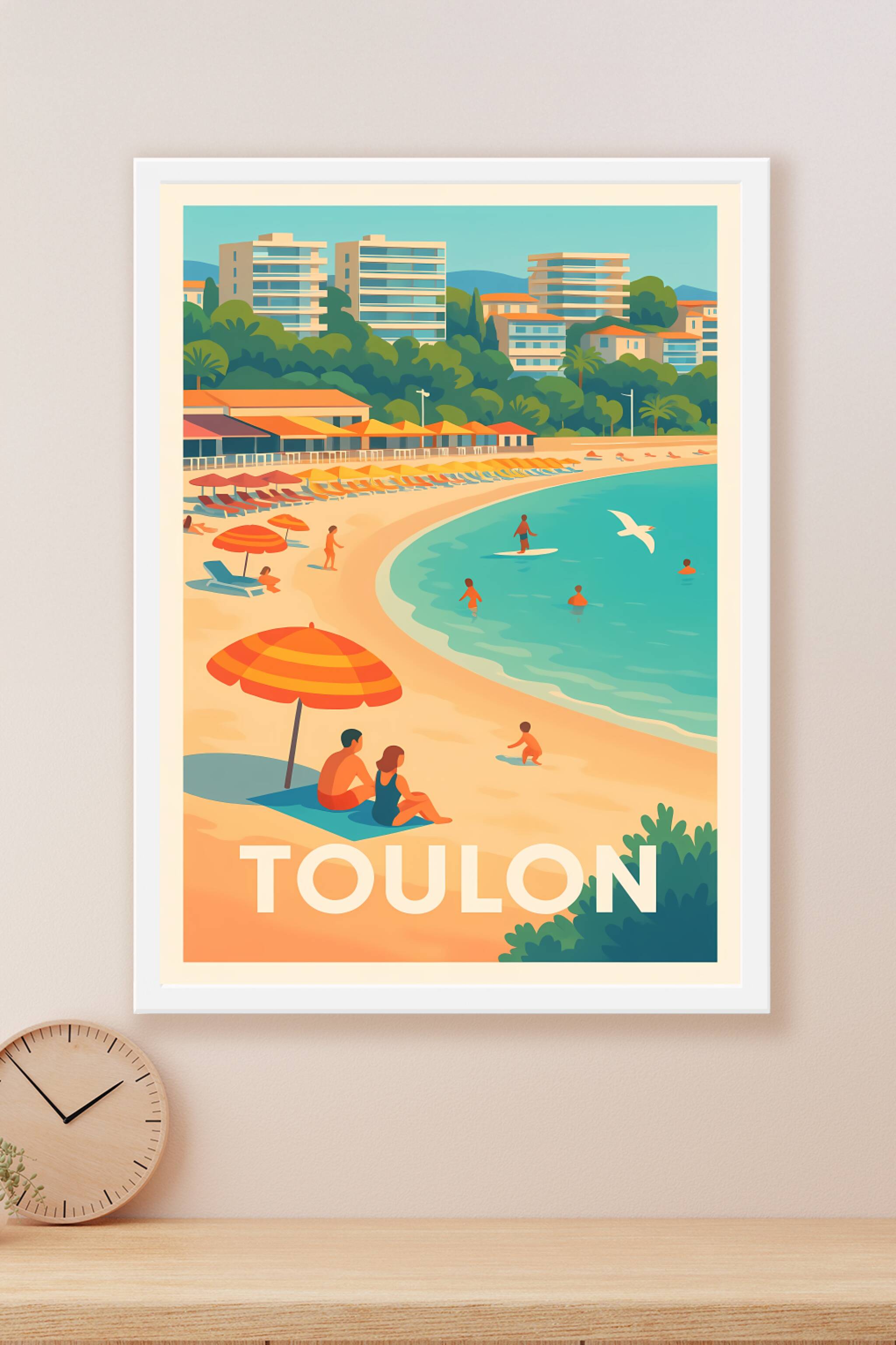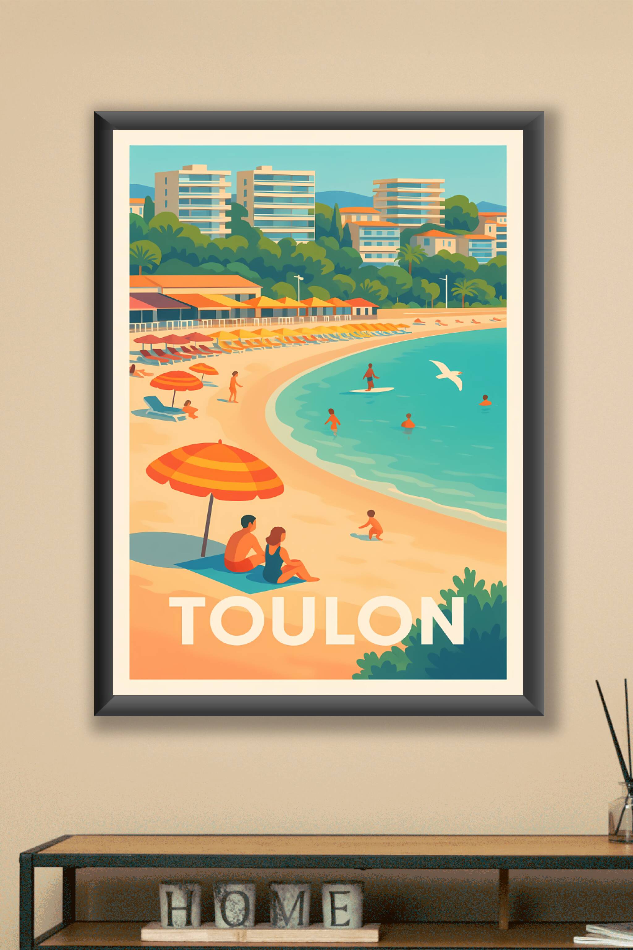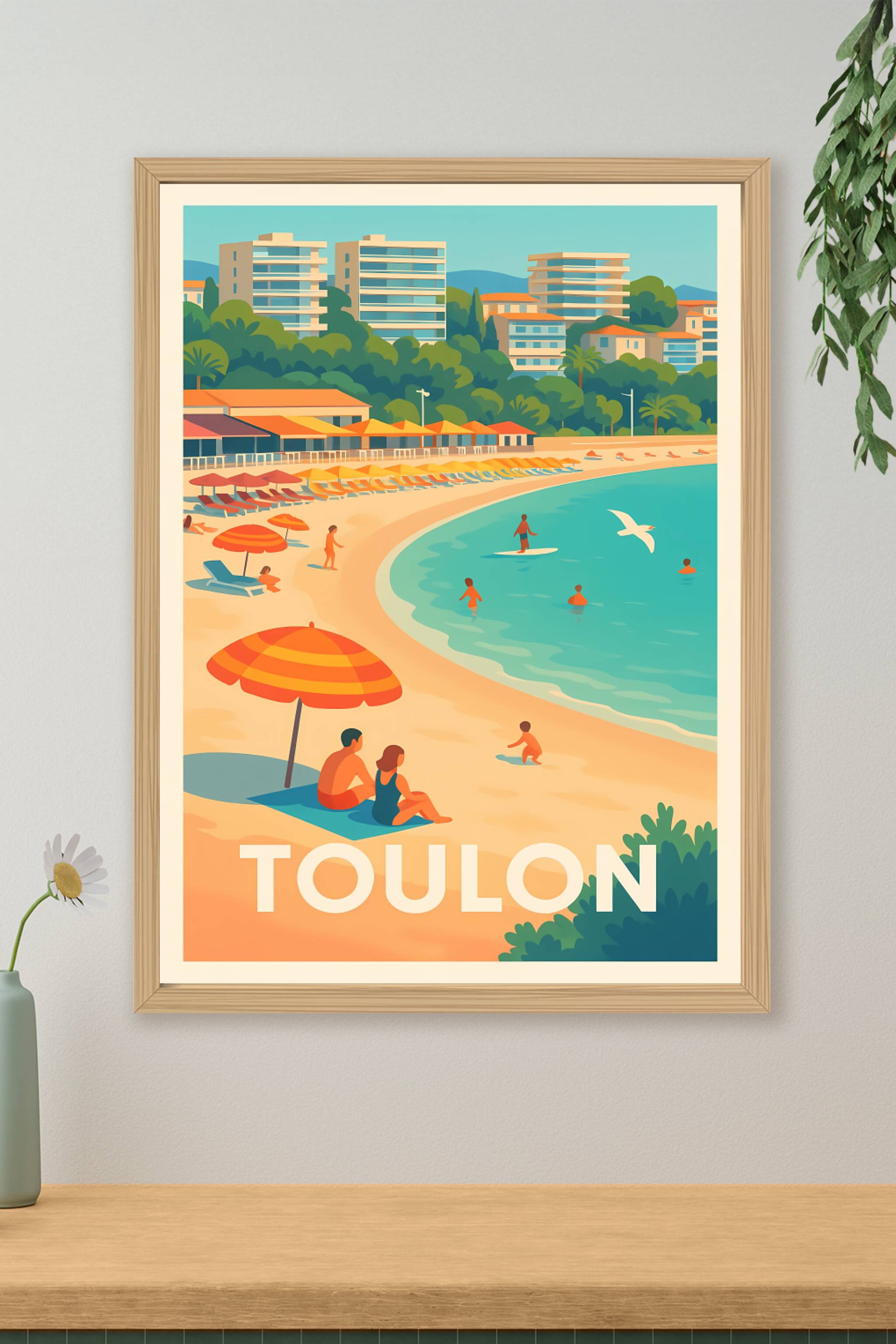 Apportez un souffle de vacances à votre décoration avec ce poster néo-rétro de Toulon. À travers ses couleurs chaudes et son style vintage, cette affiche immortalise la plage animée et les parasols colorés de cette perle méditerranéenne.